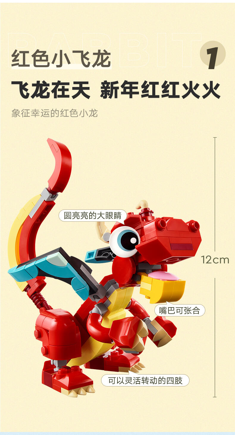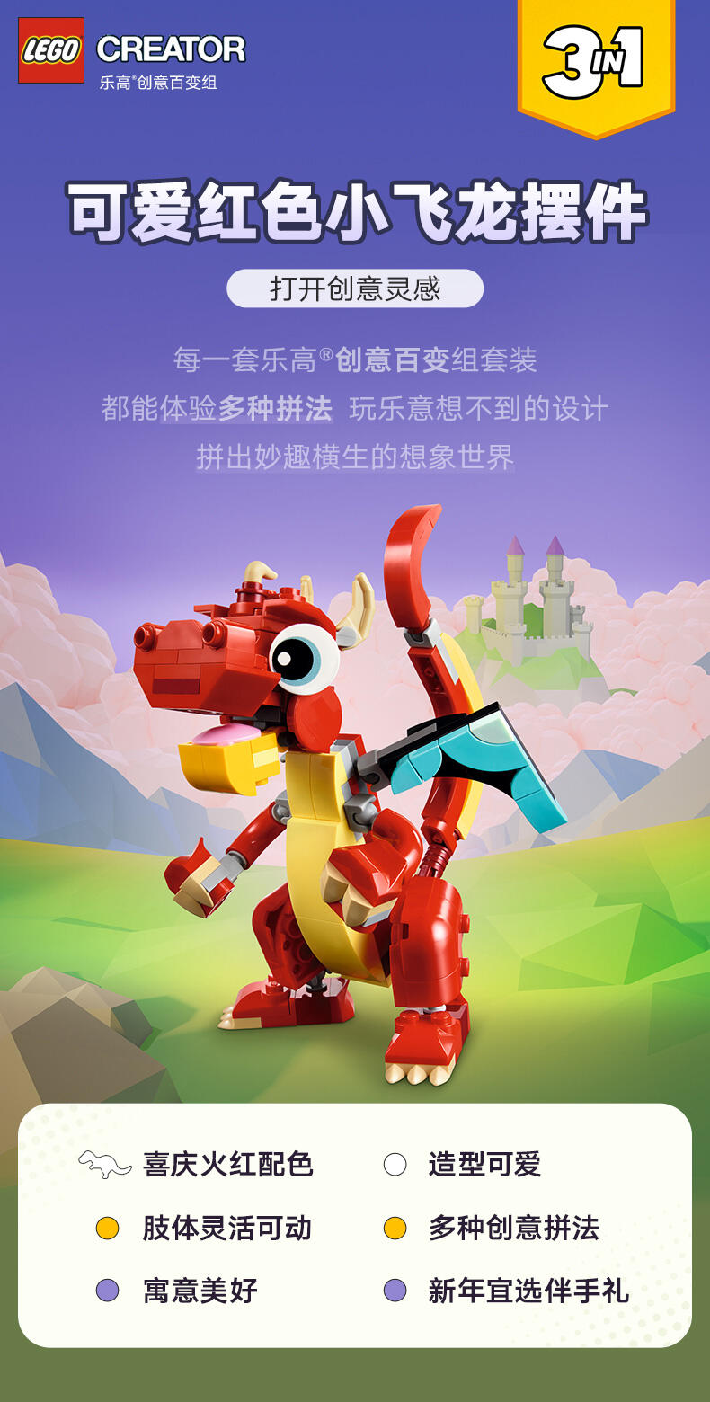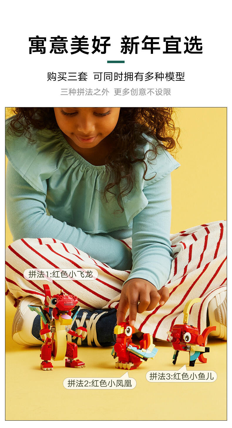 - 一套3个神奇动物玩具——6岁以上的男孩和女孩可以在这个乐高创造者红龙玩具套装中用同一套砖块建造和重建3个不同的彩色模型