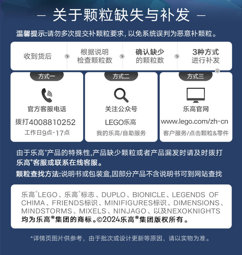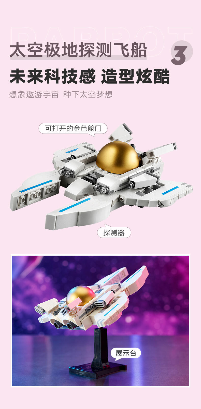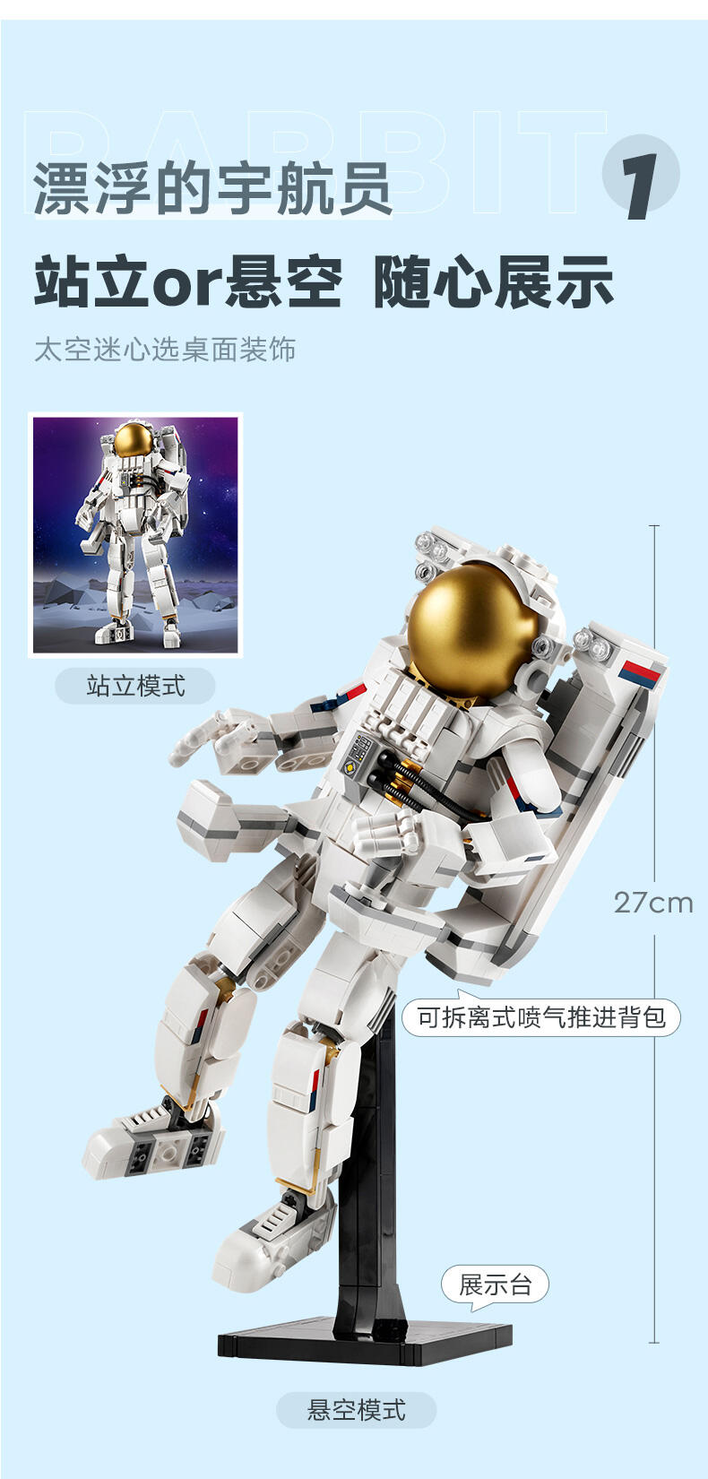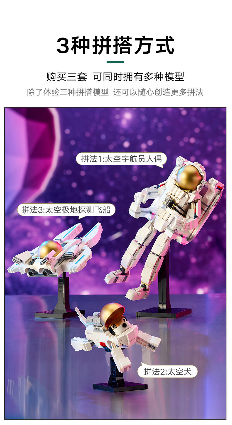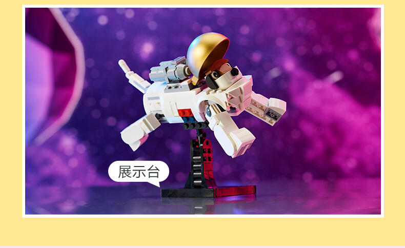 男孩与女孩可拼砌 3 种不同的太空模型:可摆姿势的航天员、腿与尾巴可动的未来风格太空狗狗,或是有座位可让 1 只人偶(未附)驾驶的太空喷射机。3 种模型皆为太空主题创意好礼,并配有展示座。