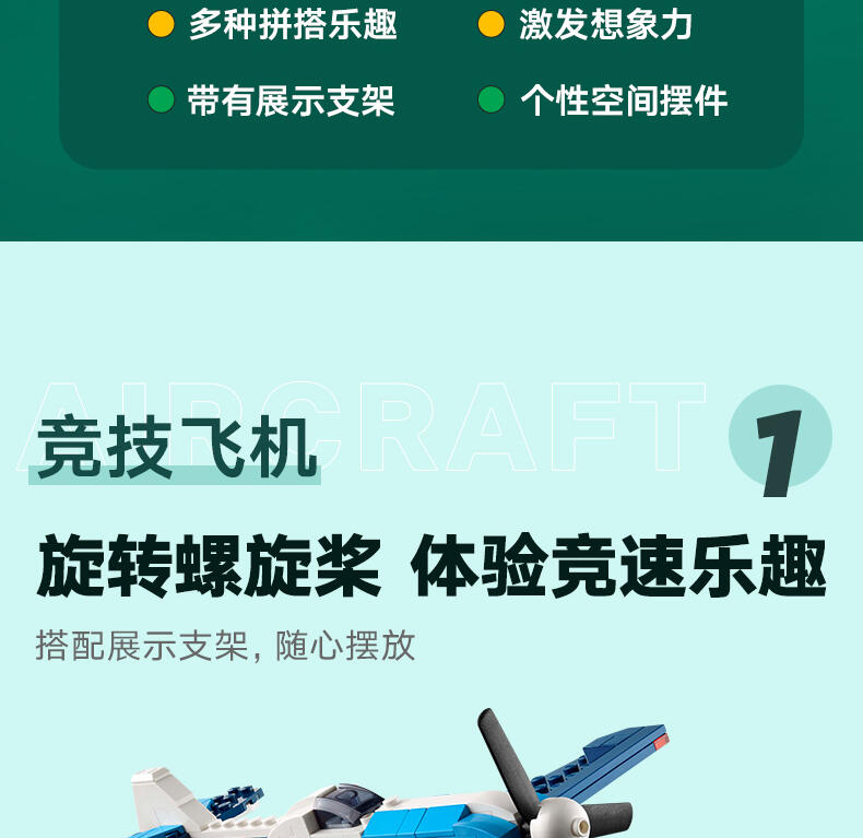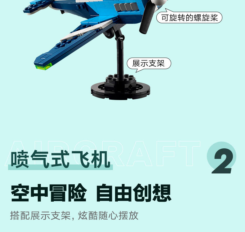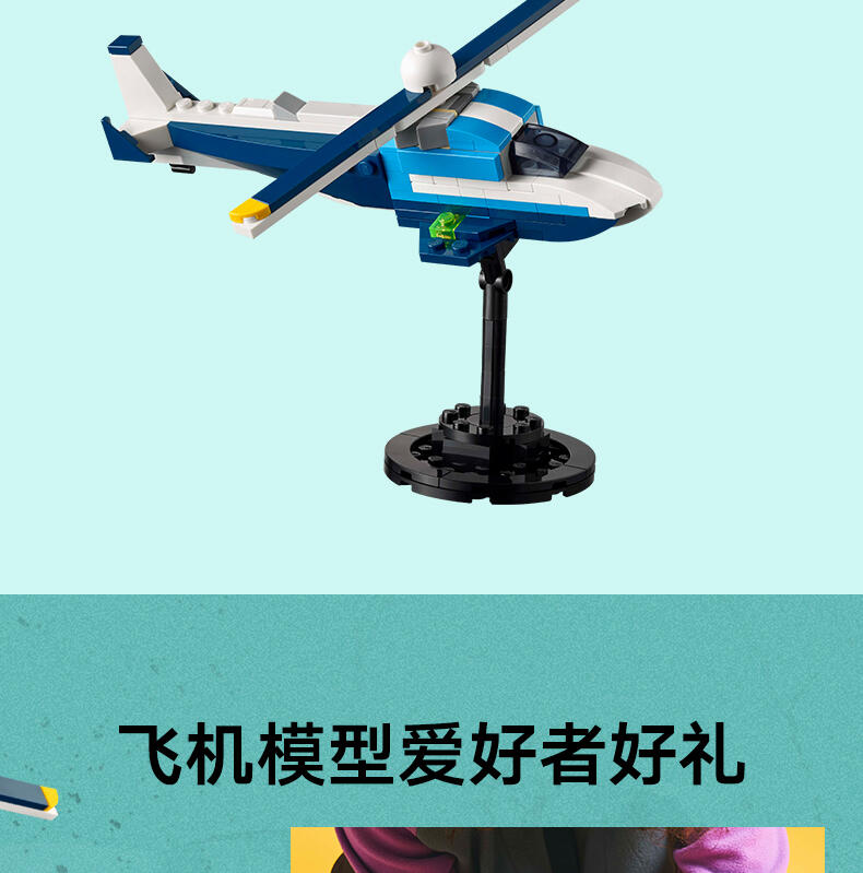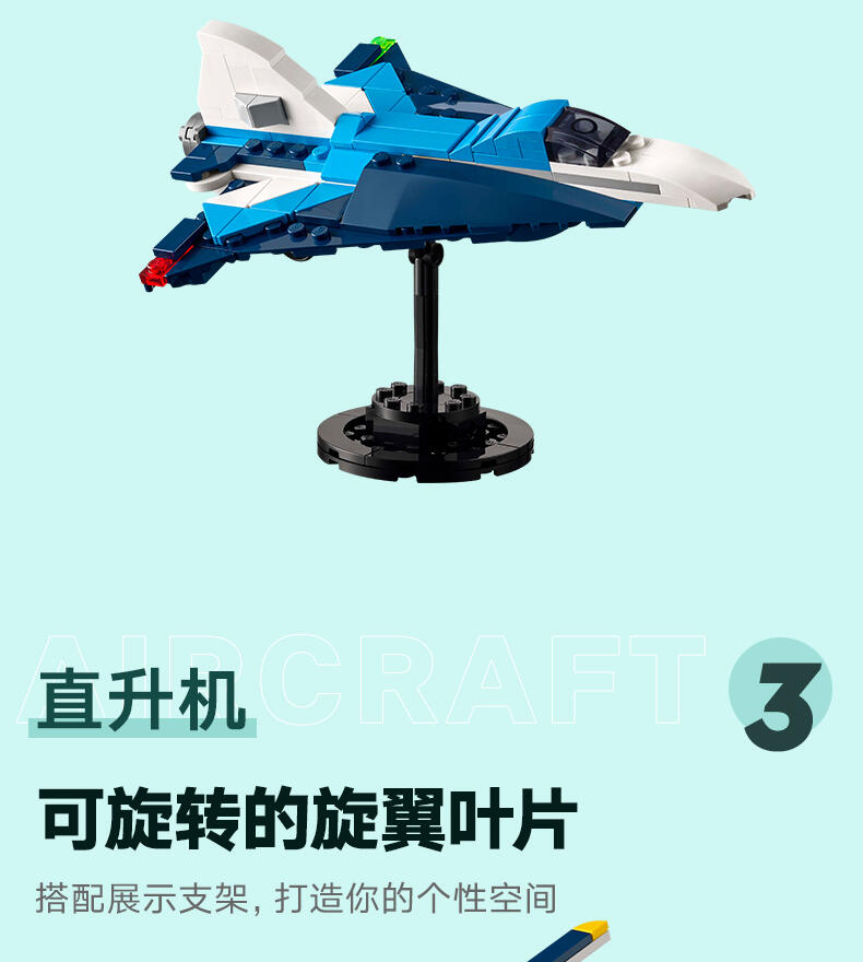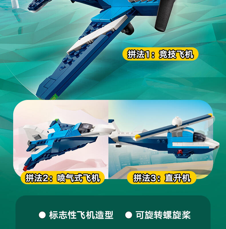 借助这款乐高 Creator 3 合 1 玩具套装,孩子们可以驾驶竞技飞机在高空翱翔,然后将其重新拼搭为喷气式飞机或直升机模型。玩乐这款动作丰富的 3 合 1 乐高 交通工具拼搭套装,7 岁及以上的孩子可以培养他们的讲故事能力。拥有可以旋转的螺旋桨、可以活动的轮子和展示架。可以活动的轮子允许模型在地面上行驶。直升机的旋翼叶片可以旋转,可供进行精彩的角色扮演。