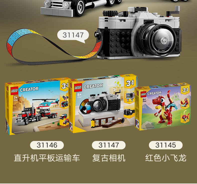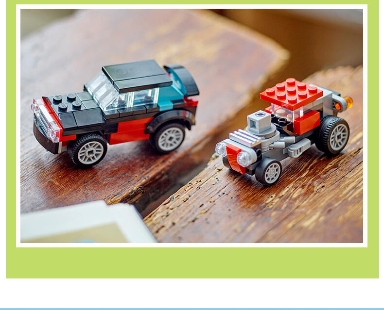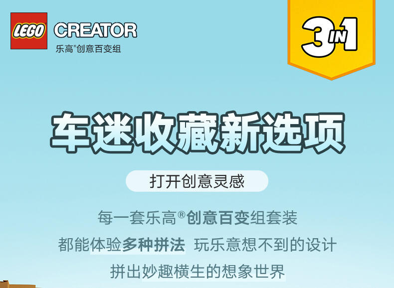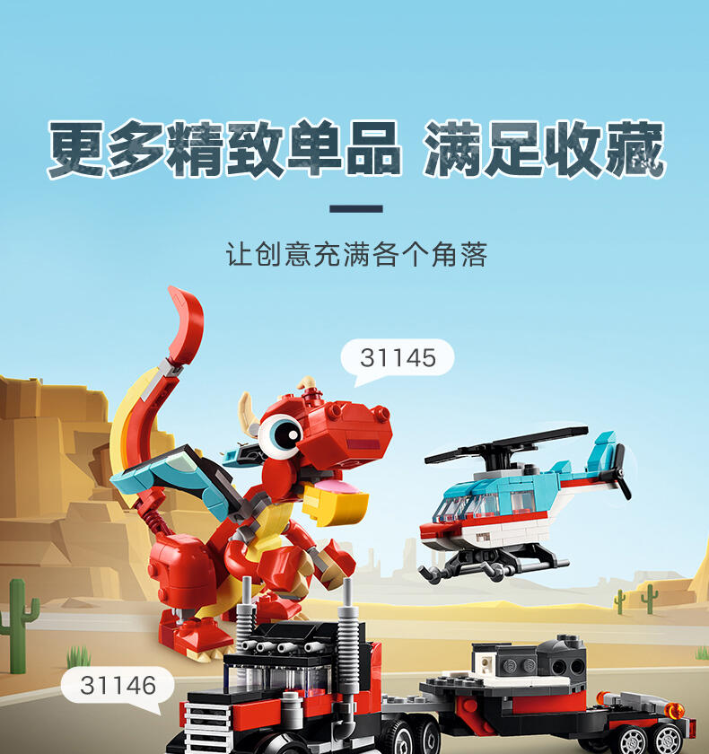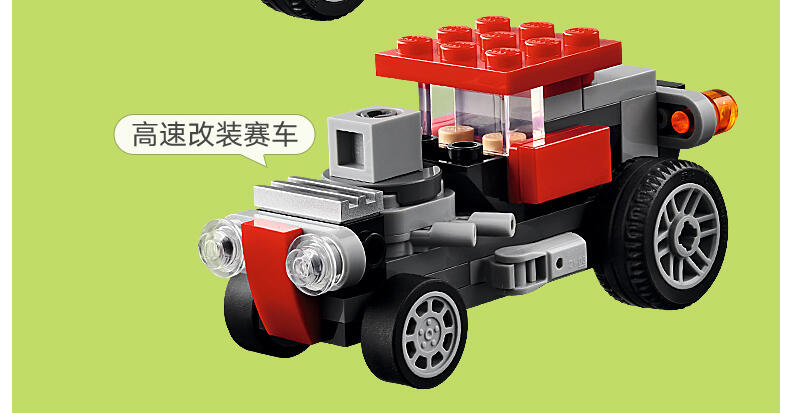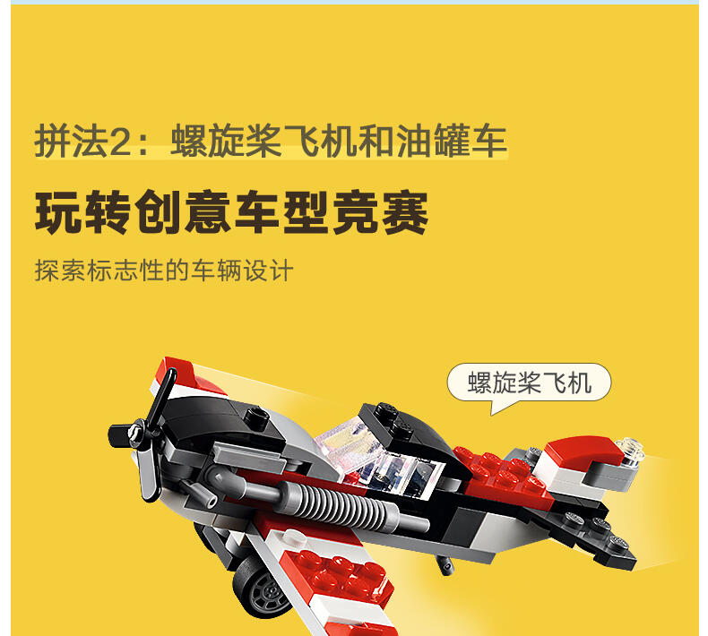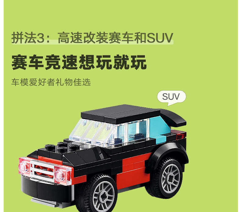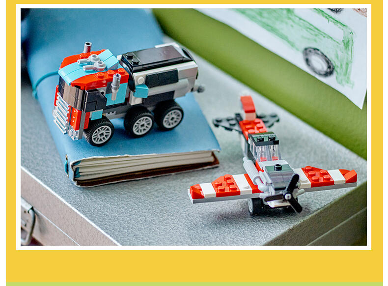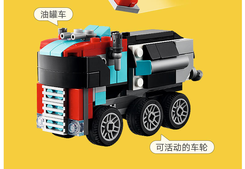 这款 3 合 1 玩具套装允许孩子们拼搭一辆直升机平板运输车,然后将其重新拼搭为一架飞机和一辆卡车,或者 2 辆玩具汽车。玩乐这款动作丰富的 3 合 1 乐高 交通工具拼搭套装,7 岁及以上的孩子可以培养他们的讲故事能力。直升机的旋翼叶片可以旋转。飞机的螺旋桨可以转动,带来角色扮演的乐趣。高速改装赛车和 SUV 拥有可以活动的车轮,可供进行赛车比赛。