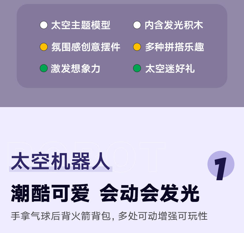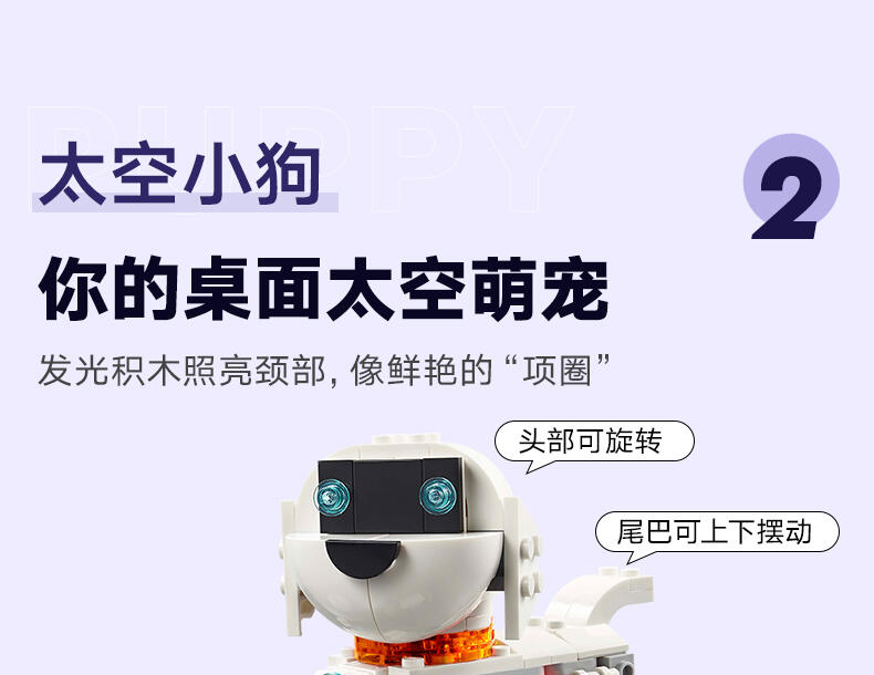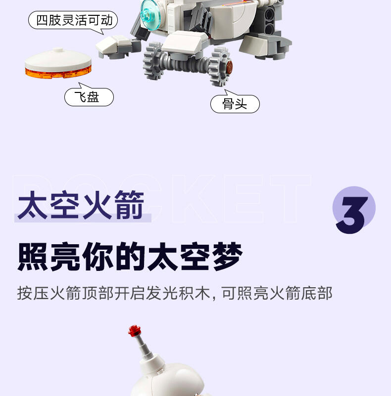 借助这款乐高 Creator 3 合 1 太空机器人玩具套装,孩子们可以进入太空,然后将其重新拼搭为太空小狗或太空火箭。8 岁及以上的孩子可以体验有趣的拼搭,然后使用 3 种不同的模型飞向太空,表演精彩的故事。这件模型包含喷气背包以及可以旋转的身体和头部。拥有可以旋转的头部和 4 条灵活的腿。太空火箭可供进行激动人心的角色扮演。