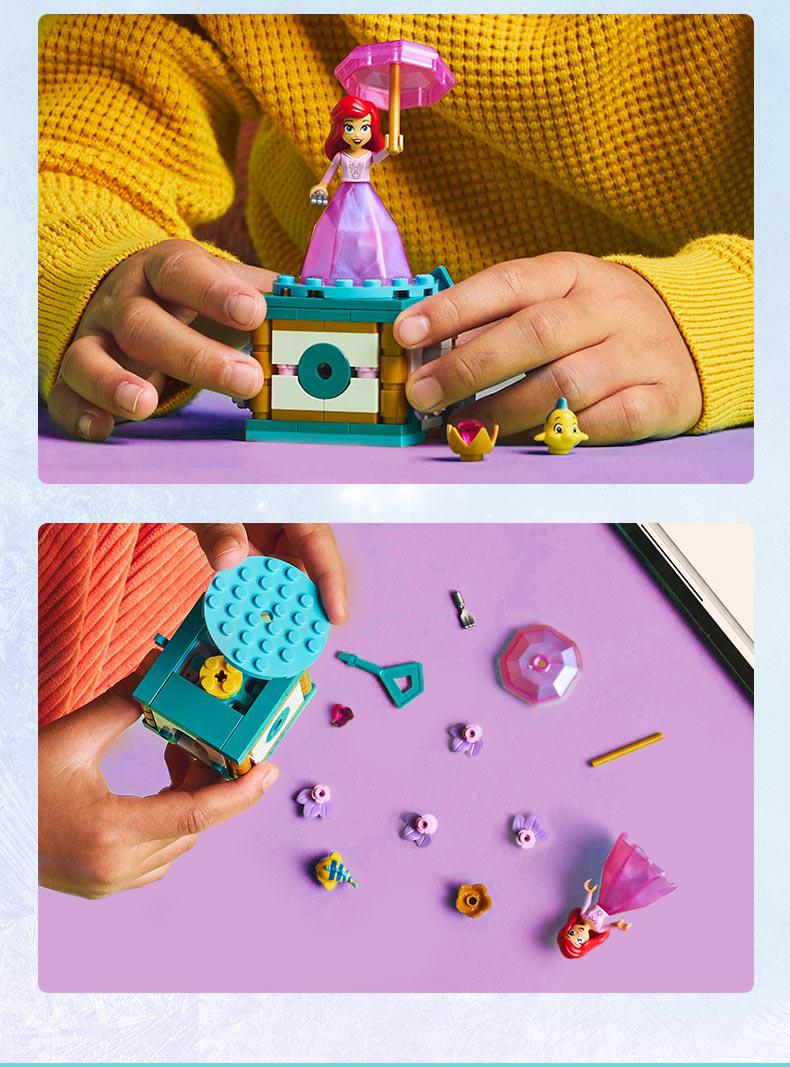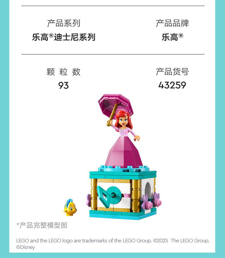 这款乐高 ǀ 迪士尼翩翩起舞的爱丽儿 (43259) 拼搭套装包含一个可以拼搭的玩具展示台,其拥有转台、钥匙、叉子、可容纳弗朗德的空间,以及侧面的“钻石”,会令 5 岁及以上的孩子和迪士尼《小美人鱼》粉丝们爱不释手。孩子们可以把爱丽儿存放在“钻石”长裙中,并用雨伞作为盖子来确保她的安全。这款可以拼搭的迪士尼模型可作为男孩、女孩和影迷的有趣礼物,展示起来效果也很棒,非常适合进行短暂而有趣的日常玩乐。拼搭和玩乐这款套装,孩子们可以尽情发挥自己的创造力,并从中体验到很多乐趣。这有助于增强他们的自信心,并在他们创作属于自己的故事过程中激发他们的想象力。本套装既适合单独玩乐,也可以与本系列的其他乐高 ǀ 迪士尼拼搭套装(单独出售)组合玩乐。此外,孩子们可以使用 LEGO Builder 应用程序进行轻松直观的拼搭冒险,在其中缩放和旋转三维模型,保存套装,以及跟踪进度。
