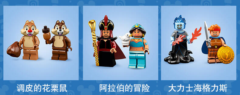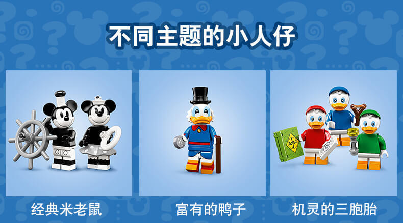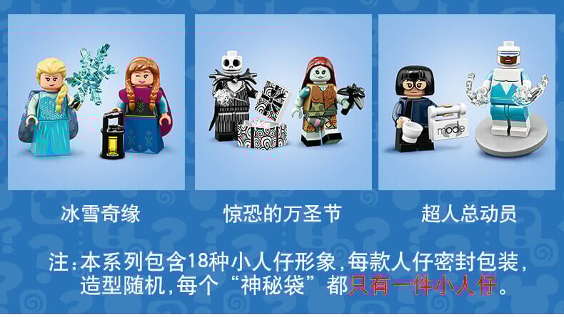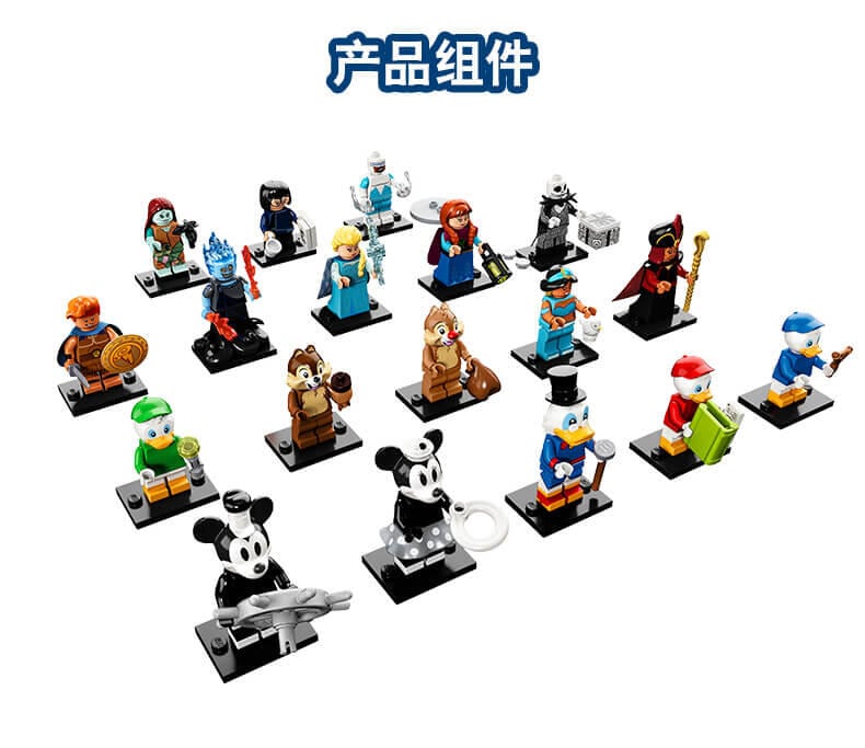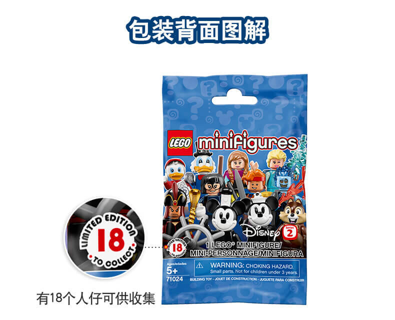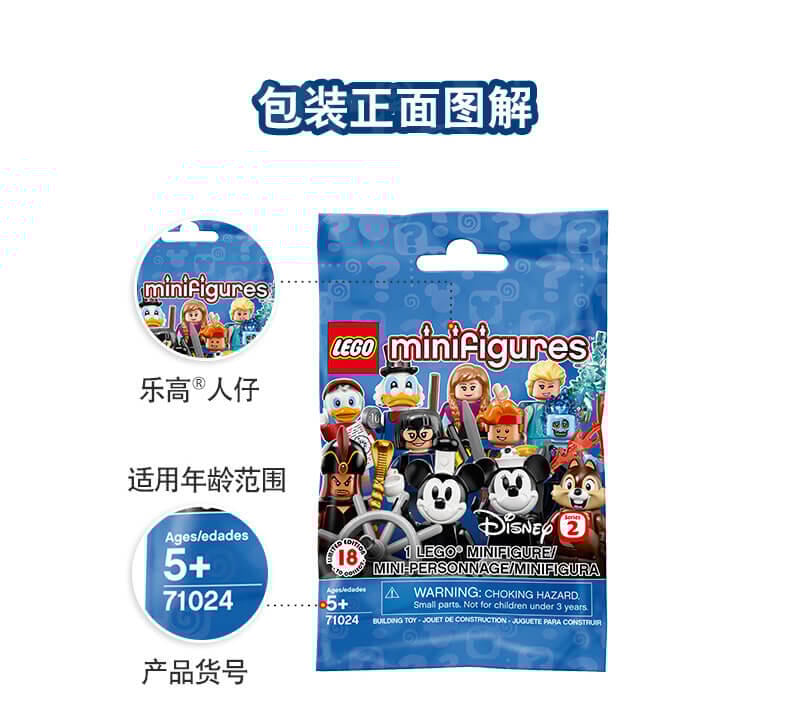 每个迪士尼迷你人偶都装在一个密封的“神秘”袋子里,连同一个或多个配件元素,还有收藏者的小册子和一个独特的显示屏底板。适合5岁以上儿童。