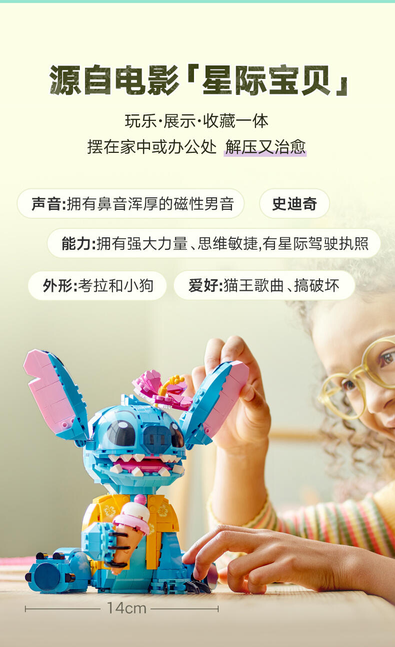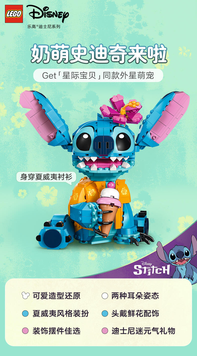 - 专为孩子们准备的迪士尼星际宝贝拼搭套装——这款乐高 ǀ 迪士尼史迪奇适合 9 岁及以上的男孩和女孩,他们可以拼搭此模型,然后进行玩乐和展示,同时还可以激发自己的想象力 迪士尼史迪奇角色——这款乐高 拼搭套装包含一个源自《星际宝贝》的展示模型、一个可以拼搭的蛋筒冰淇淋,以及一朵用来装饰角色的鲜花 可以活动的身体部分——这款史迪奇拼搭模型拥有可以上下活动的耳朵、可以转动的头部(还可以装饰上一朵鲜花),以及一只可以握着蛋筒冰淇淋的手 有趣的展示品——可以创造身穿夏威夷衬衫的史迪奇,用蛋筒冰淇淋和鲜花来装饰他,将他的头和耳朵移动到不同的位置,以展现新的表情,然后将他展示起来 适合孩子的迪士尼礼物——这款拼搭玩具包含一个功能丰富的迪士尼角色和许多配件,适合作为 9 岁及以上影迷、男孩和女孩的礼物,可供他们在学校和家中分享 得力助手——让 LEGO Builder 应用程序引导孩子踏上直观的拼搭冒险之旅。他们可以在拼搭过程中保存套装,跟踪进度,以及缩放和旋转三维模型 培养生活技能——这款儿童拼搭玩具包含一个乐高 ǀ 迪士尼角色及系列配件和功能,可用来增强展示效果。本玩具还有助于孩子在玩乐中培养生活技能 尺寸——这款玩乐和展示一体式拼搭套装内含 730 块组件,其中积木拼搭的角色高 20 厘米(8 英寸)