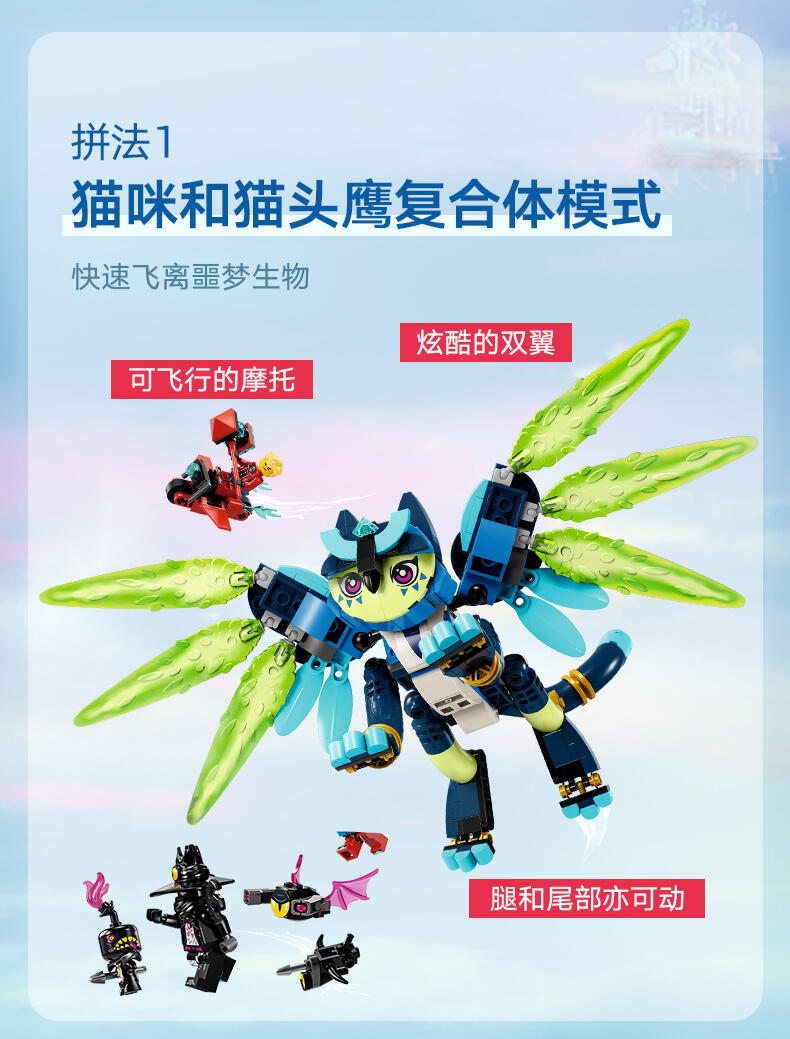 本套装提供故事性拼搭说明和 2 种激动人心的拼搭模式,以便孩子们沉浸在梦境世界冒险中,并享受双份的玩乐时间。他们可以放飞想象的翅膀,将希恩拼搭为长有双翼的猫咪和猫头鹰复合体,快速飞离噩梦生物,或者将其拼搭为长着漂亮尾巴的猫咪和孔雀复合体,与这些生物进行战斗。