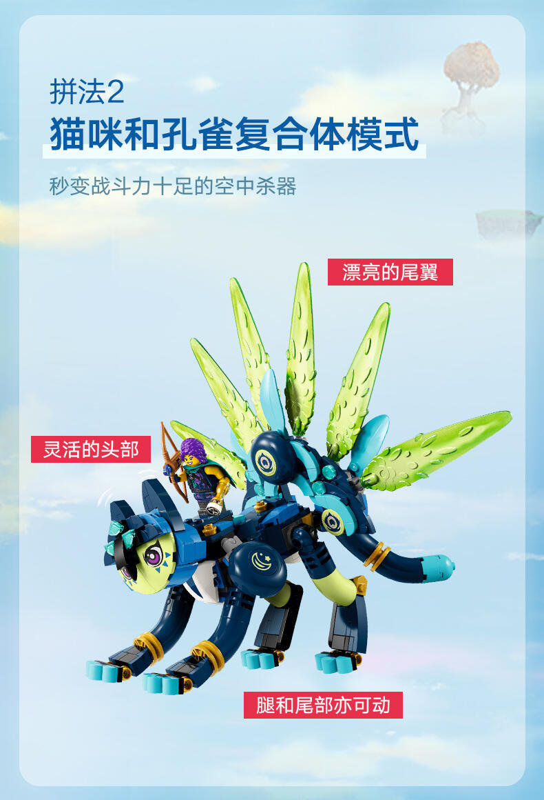 一款套装,2 种模型——这款具有创意的拼搭玩具允许孩子们选择自己的冒险,既可将希恩拼搭为猫咪和猫头鹰复合体,也可把他拼搭为猫咪和孔雀复合体