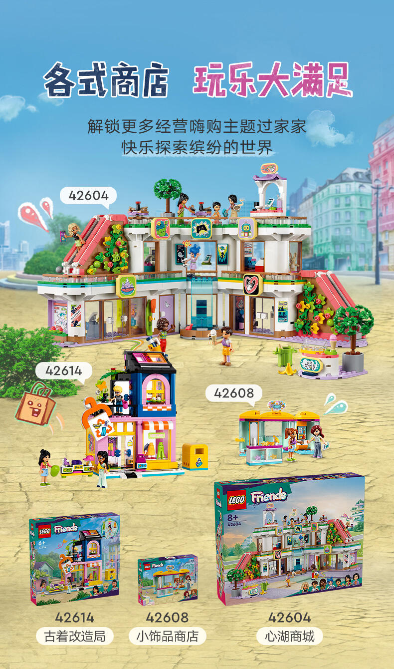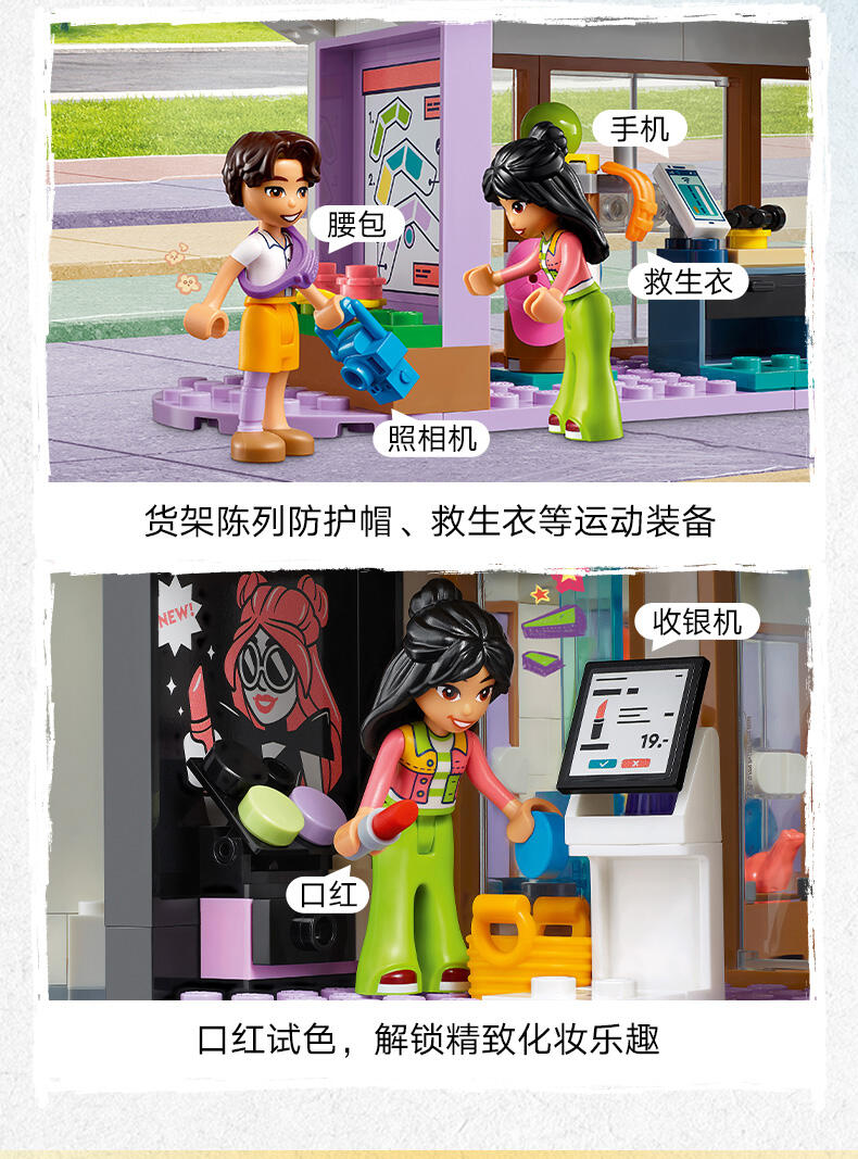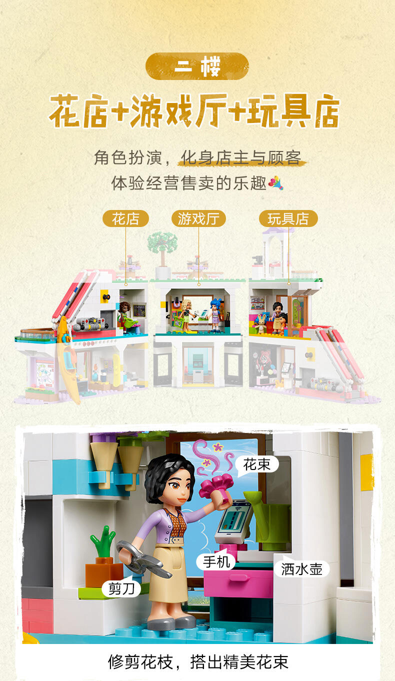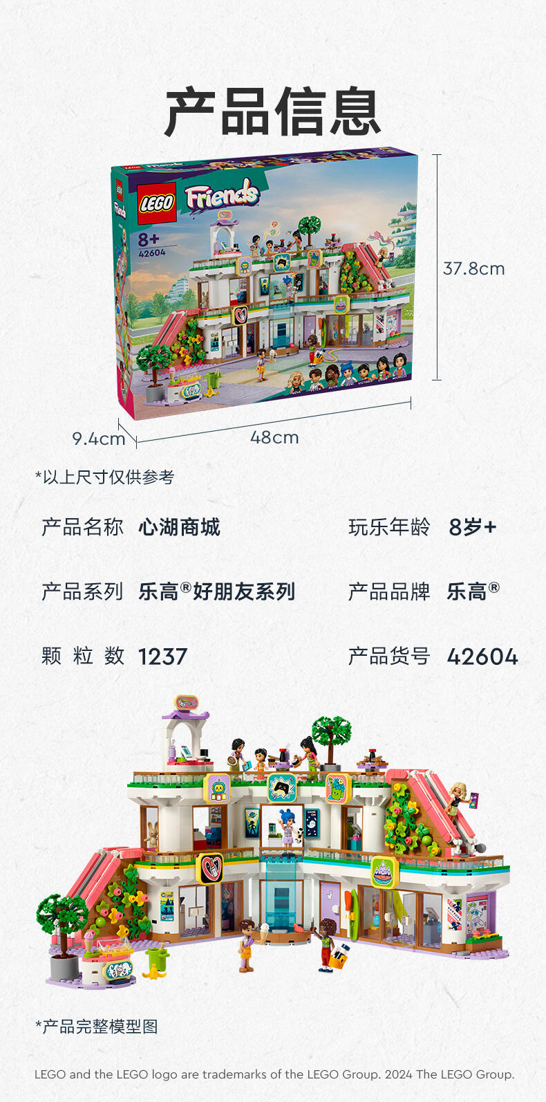 公园富有想象力的购物游戏与乐高之友心湖城购物中心(42604)游戏集为8岁以上的孩子。这款儿童玩具有7个角色,可以激发创造性的角色扮演,帮助儿童发展社交技能