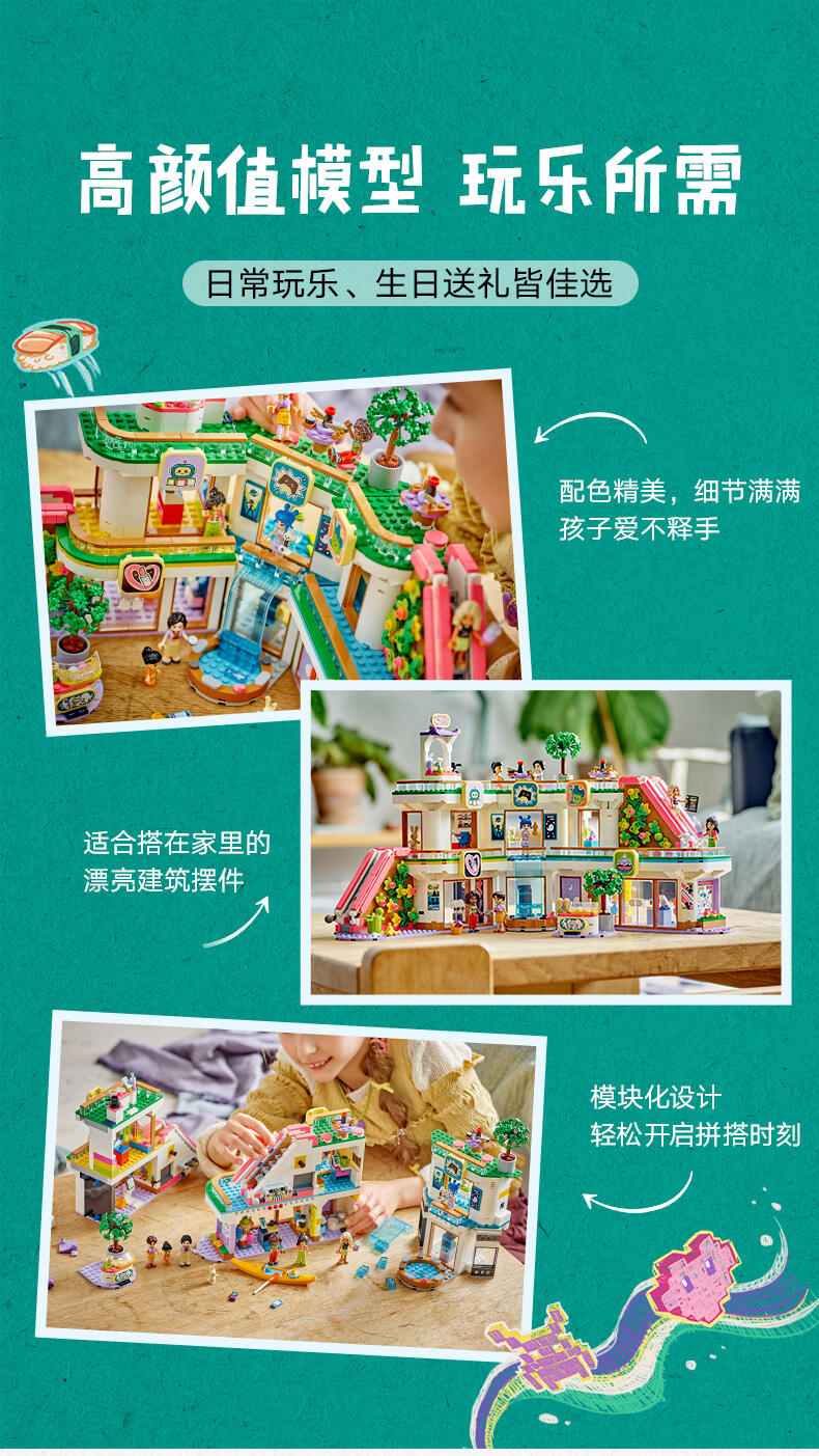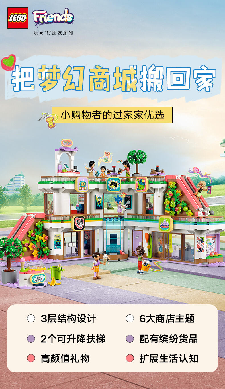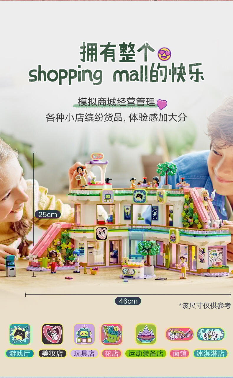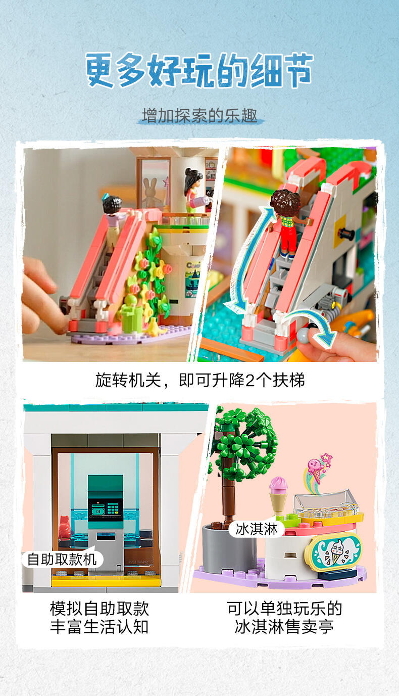 公园富有想象力的购物游戏与乐高之友心湖城购物中心(42604)游戏集为8岁以上的孩子。这款儿童玩具有7个角色,可以激发创造性的角色扮演,帮助儿童发展社交技能