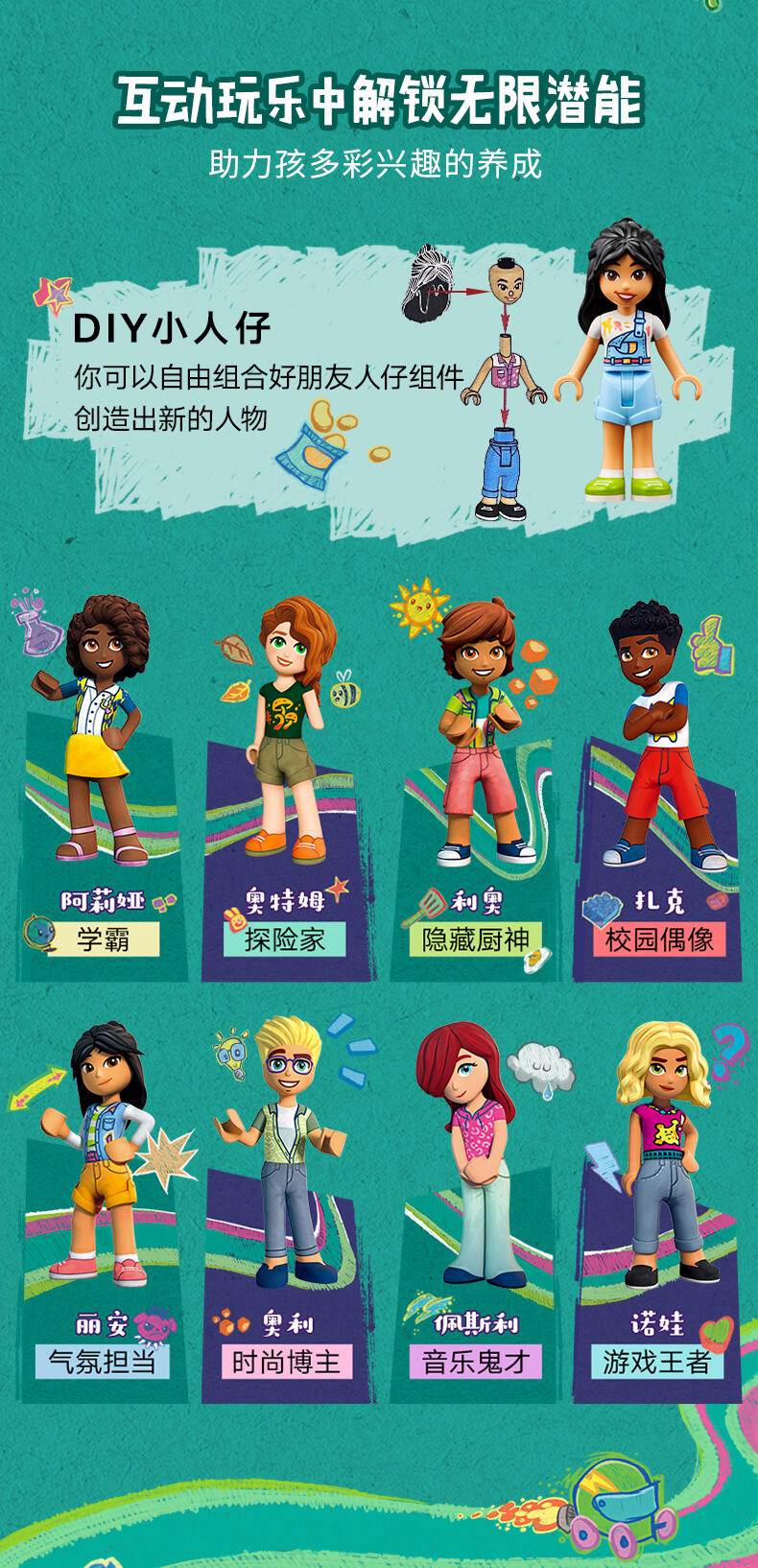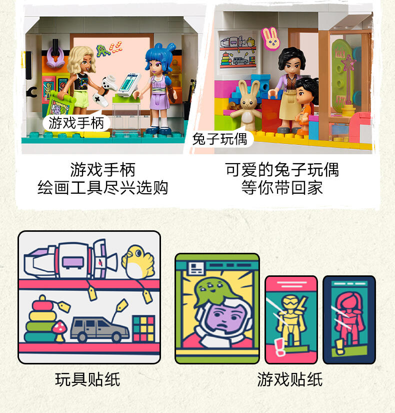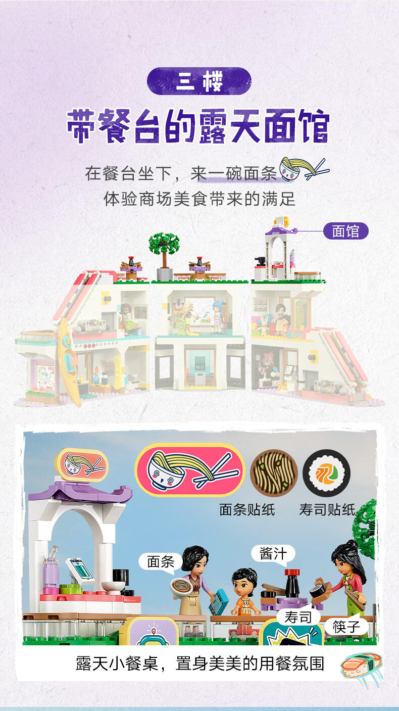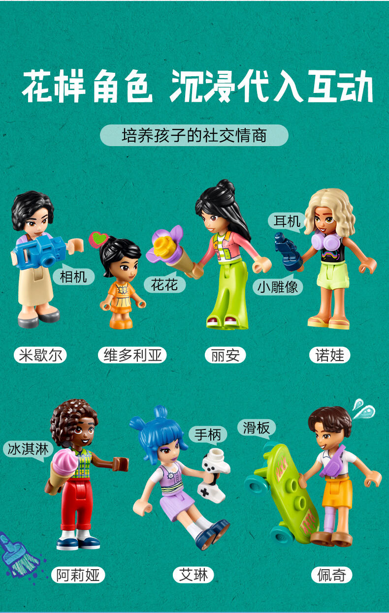 公园富有想象力的购物游戏与乐高之友心湖城购物中心(42604)游戏集为8岁以上的孩子。这款儿童玩具有7个角色,可以激发创造性的角色扮演,帮助儿童发展社交技能