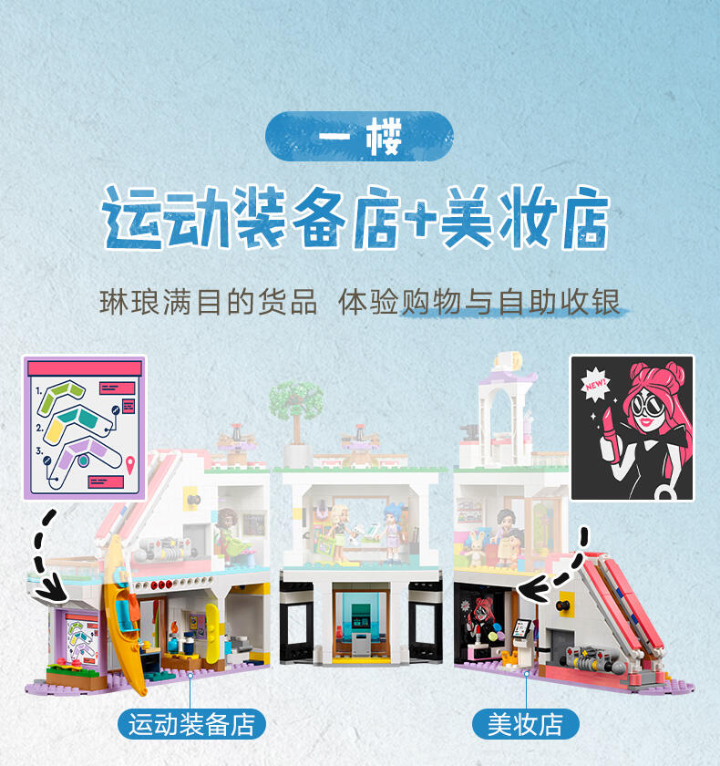 孩子们在购物中心的3层楼里聚集了美容产品、玩具、电子游戏、鲜花和户外用品商店,有很多东西可以发现。而构建只是一个开始!这个建筑工具包充满了丰富的功能,可以在孩子们帮助角色探索商店并挑选他们最喜欢的东西时激发友谊故事