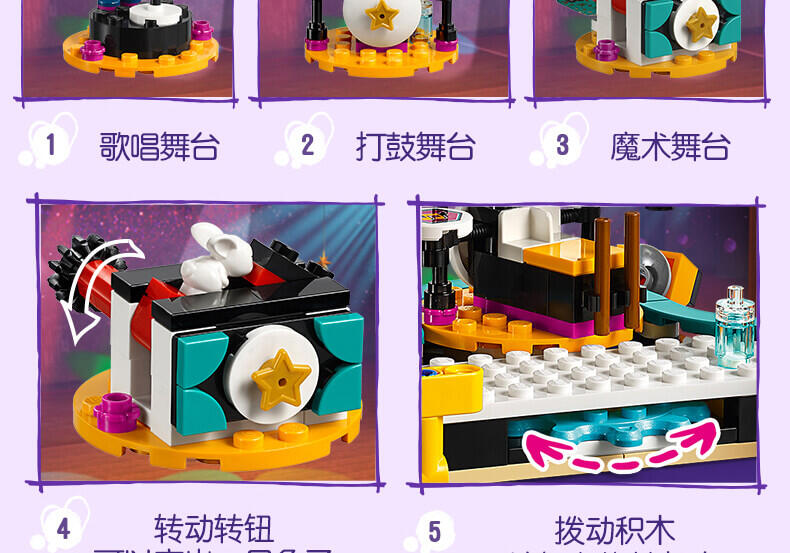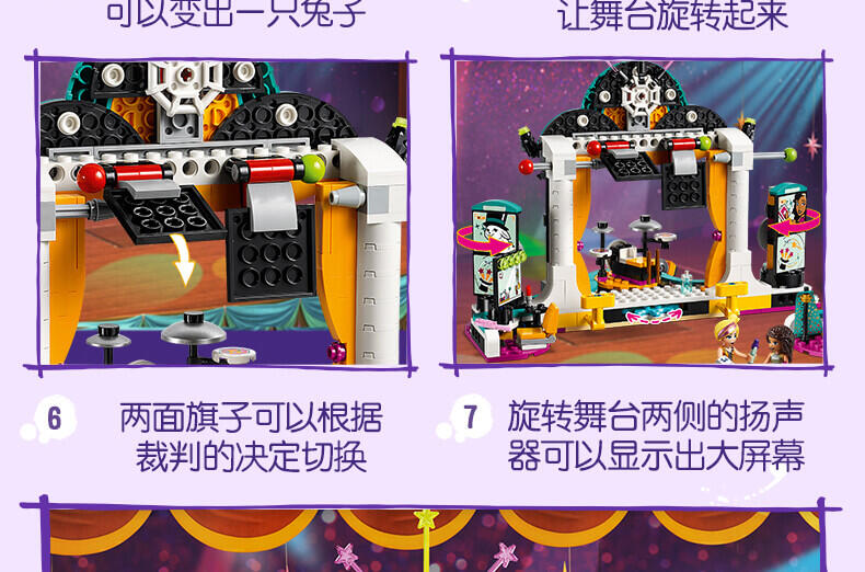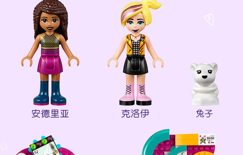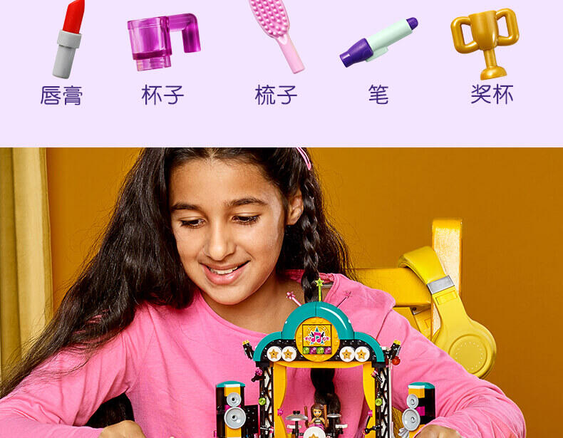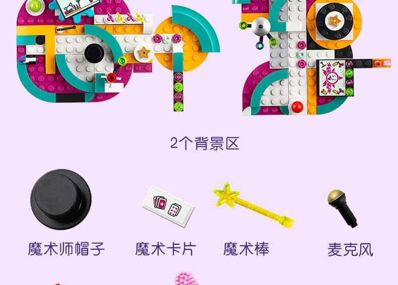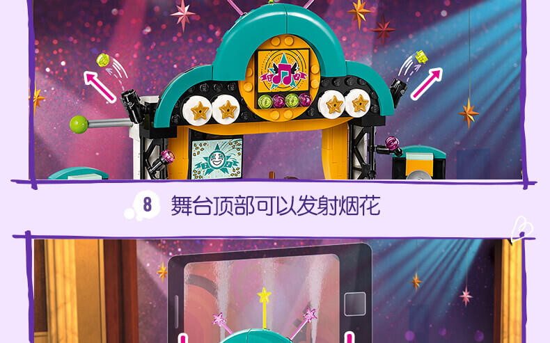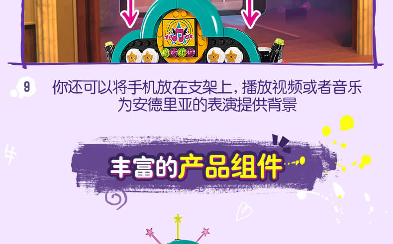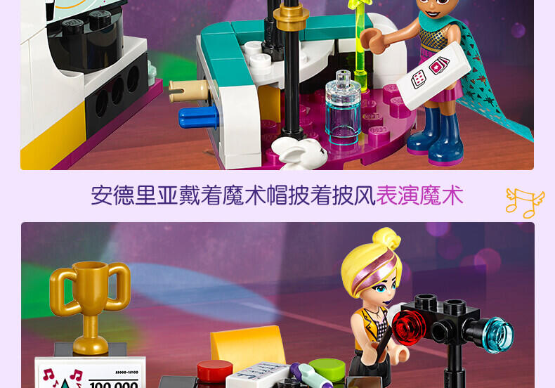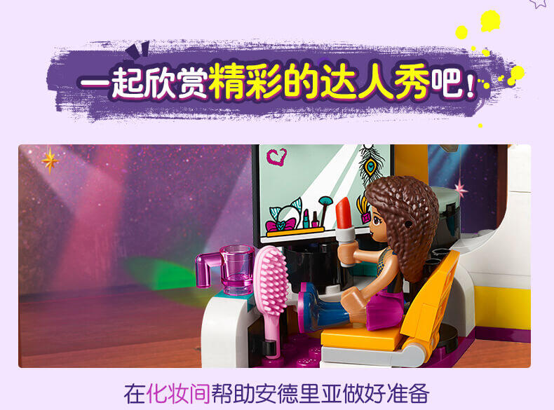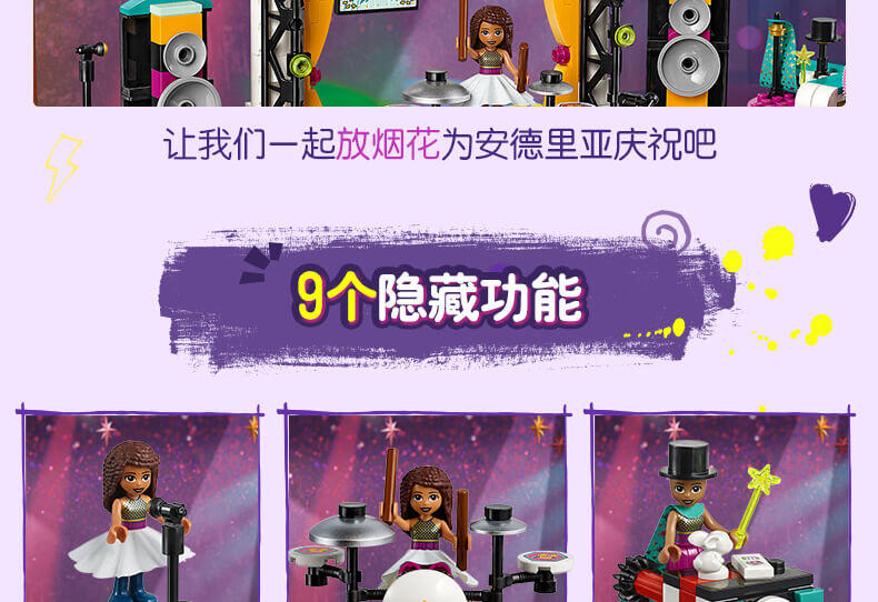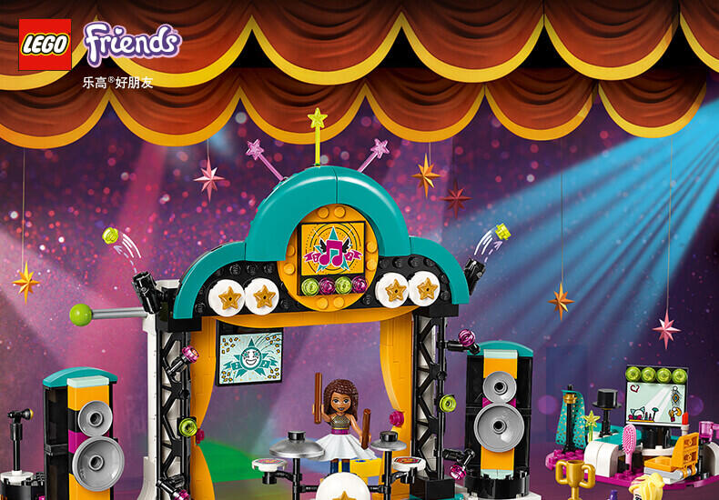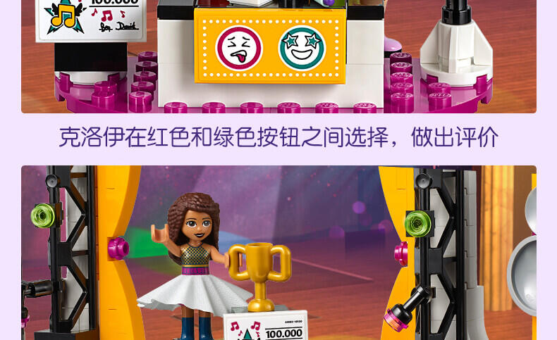 乐高好友Andrea拥有天赋才能,而这里正是您能看到她做出最精彩表演的地方。穿 上了新裙子的Andrea,正准备令群众发出欢呼声。在组合和切换不同舞台布景中,看看Andrea如何做出魔术把戏、成为音乐歌手或表演击鼓。帮助Andrea为她在化装间里的表演做好准备,或 者给她穿上魔术师的斗篷。 Chloe正对这才艺表演作出评审。当她按下投票按钮时,会显示一面旗帜以展示她对这个表演的意见。她给了一个大赞﹗快来 燃放烟花庆祝吧﹗