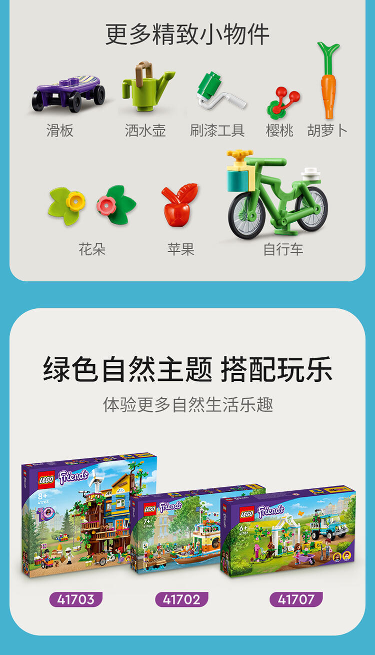 - (17厘米)高,12英寸。(33厘米)长4英寸。(12厘米)宽,该套件与友谊树屋(41703)和植树车(41707)玩具兼容•互动式建筑指南-数字说明提供了一个逐步的指南,让建筑体验更加有趣,通过点击乐高建筑说明应用程序上的“说明+”访问•一个关爱的社区-在孩子们加入乐高朋友的角色时,通过心湖城玩具培养他们的想象力,让世界变得更美好