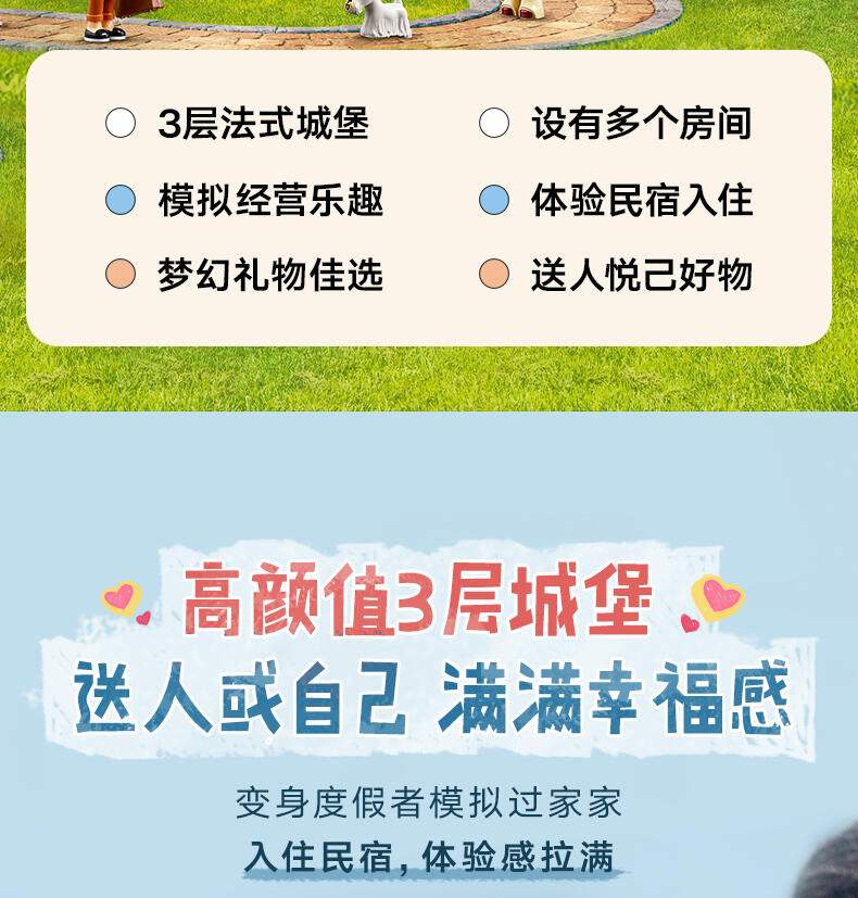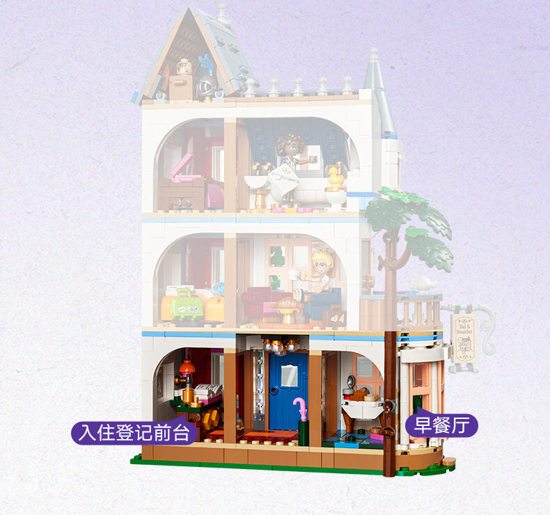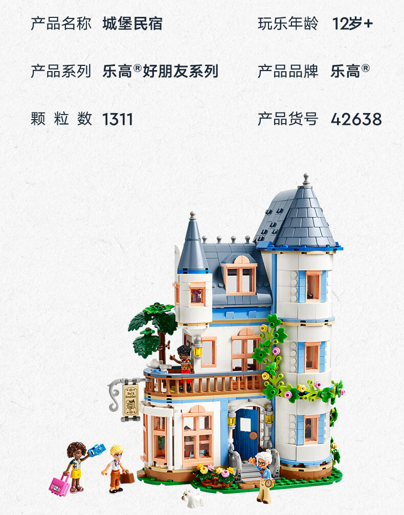 这款城堡住宿加早餐(42638)玩具酒店玩具套装,激励12岁及以上的儿童和青少年建造自己的法式城堡。这个详细的三层模型配有4个乐高 riends迷你娃娃、一个狗狗玩偶和许多配件,这样孩子们就可以为无休止的客人冒险搭建舞台。