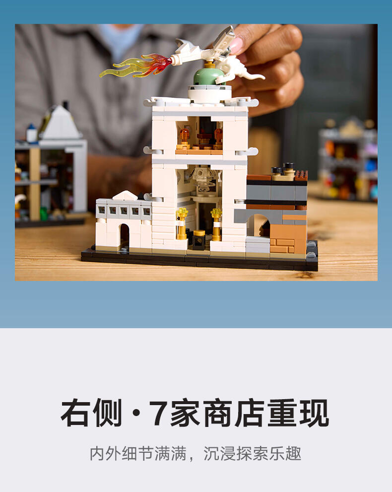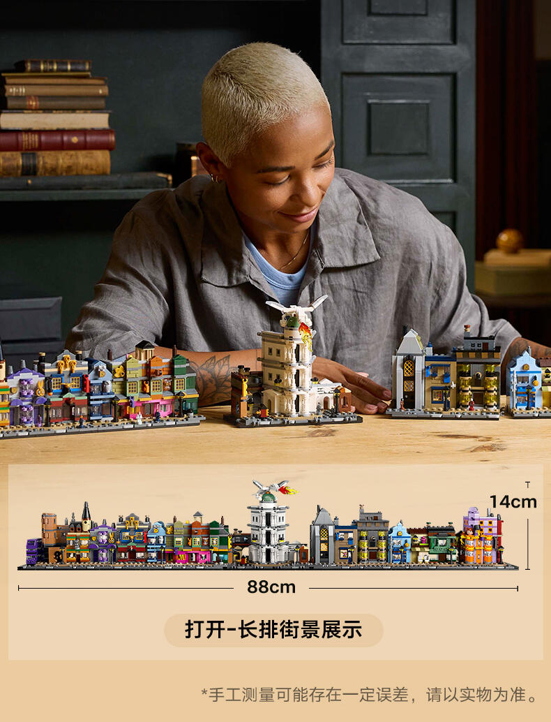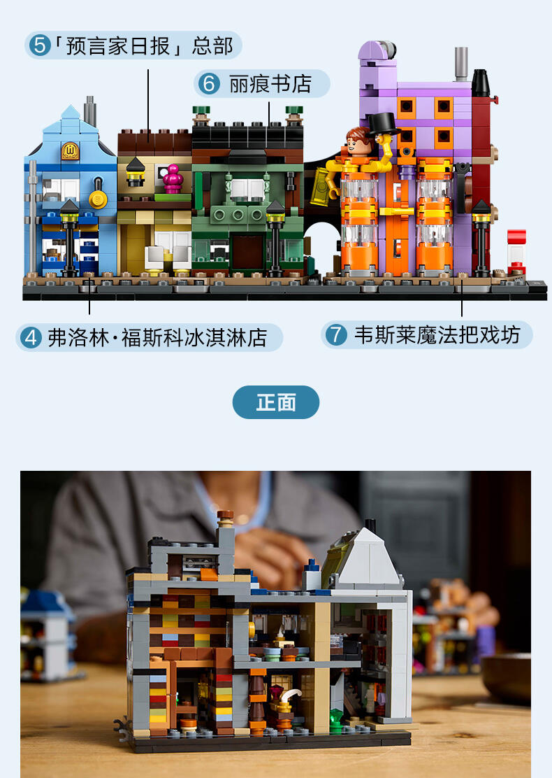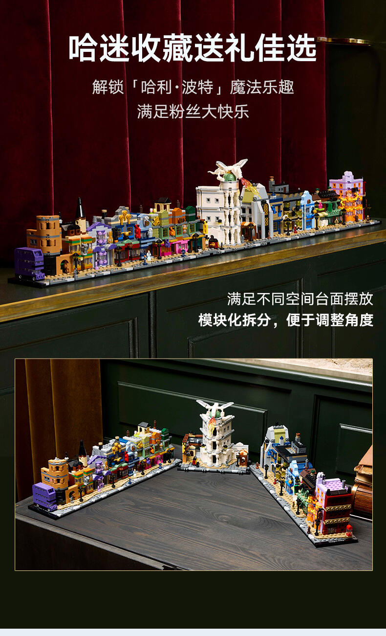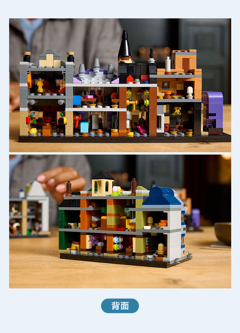 玩乐这款极为精致的乐高 哈利·波特 迷你对角巷 展示模型 (76444),进入一个神奇的世界。这款乐高积木拼搭的魔法套装邀请《哈利·波特》奇幻冒险的成年粉丝们重现标志性的对角巷商店,其中包括韦斯莱魔法把戏坊、弗洛林·福斯科冰淇淋店、奥利凡德魔杖店、穆尔派普先生的药店,以及古灵阁 巫师银行、破釜酒吧和《预言家日报》总部。每栋建筑都拥有一眼就能认出的外部细节,内部藏有令人欢乐的复活节彩蛋。这款魔法展示模型可作为一件引人注目的房间装饰品。既可将其展示为一条双面街道或一长排建筑物,也可将其分成 5 个部分,仔细进行观察。还可以添加 12 个独特的乐高哈利·波特微型人偶和骑士巴士,唤起人们对经典场景的记忆。这款微型拼搭套装属于品类繁多的乐高成人套装系列,既可作为自己的超级奖励,也可作为其他粉丝的哈利·波特礼物。