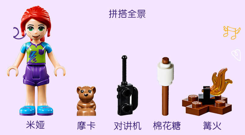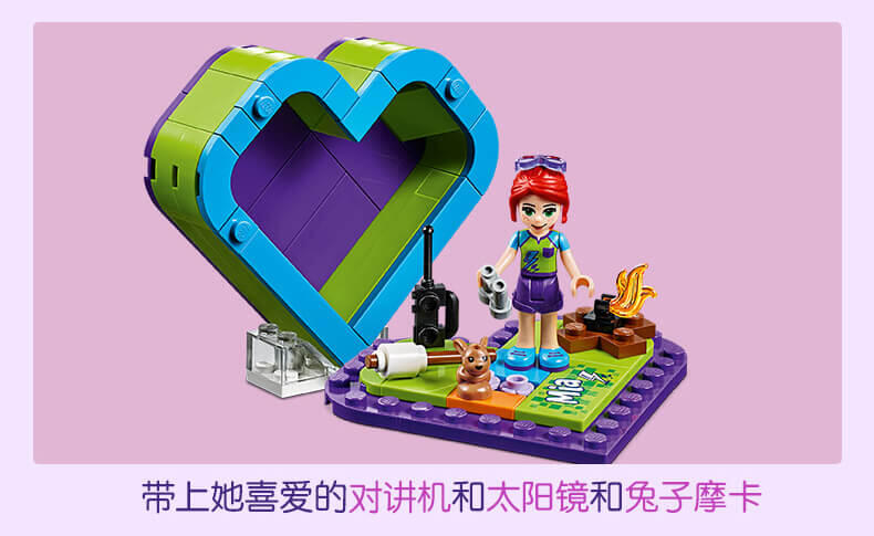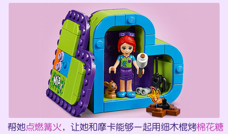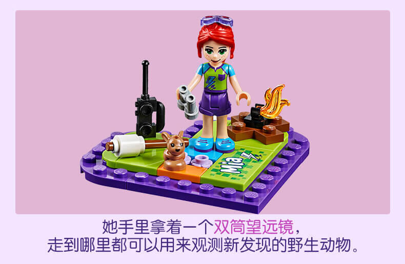 无论您走到哪里,随时都可带着载有Mia的心心盒子在自己身边作伴。建造心形盒子 ,然后从里面弹出乐高好友Mia并带她一齐旅行。可是别忘记为这个喜爱户外活动的女孩子收拾好所有她最喜欢的东西,例如她的对讲机和太阳眼镜,以及她的朋友仔宾尼兔Moka。帮助她生起营火,让她和 Moka可以享受在棍子上烤棉花糖的乐趣。无论你去到哪里,她都可带着手上的望远镜发现新的野生动物。