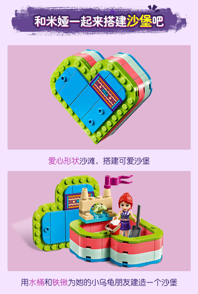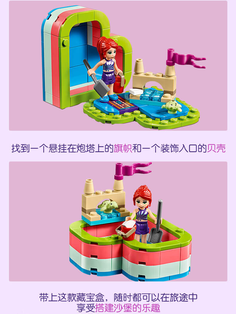 米娅在夏日海边度假,有可爱的小海龟,还有沙子堆积成的城堡,米娅拿着铁锹和小水桶在找寻自己的丰富宝藏,还配有心形的装饰,非常好看。此款共85颗粒,还有米娅公仔以及小海龟,适合6岁以上的小朋友。