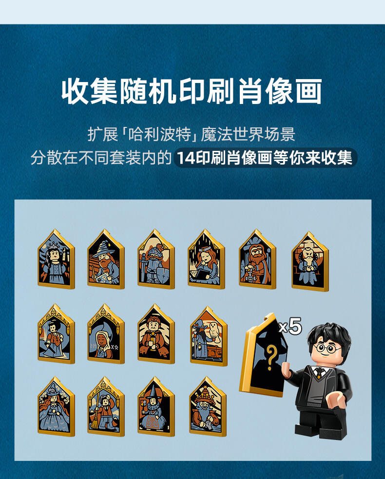 这套收藏品包括11个角色,包括哈利·波特、赫敏·格兰杰、阿不思·邓布利多和一个山地巨魔,以及14幅随机收藏的霍格沃茨肖像中的5幅。