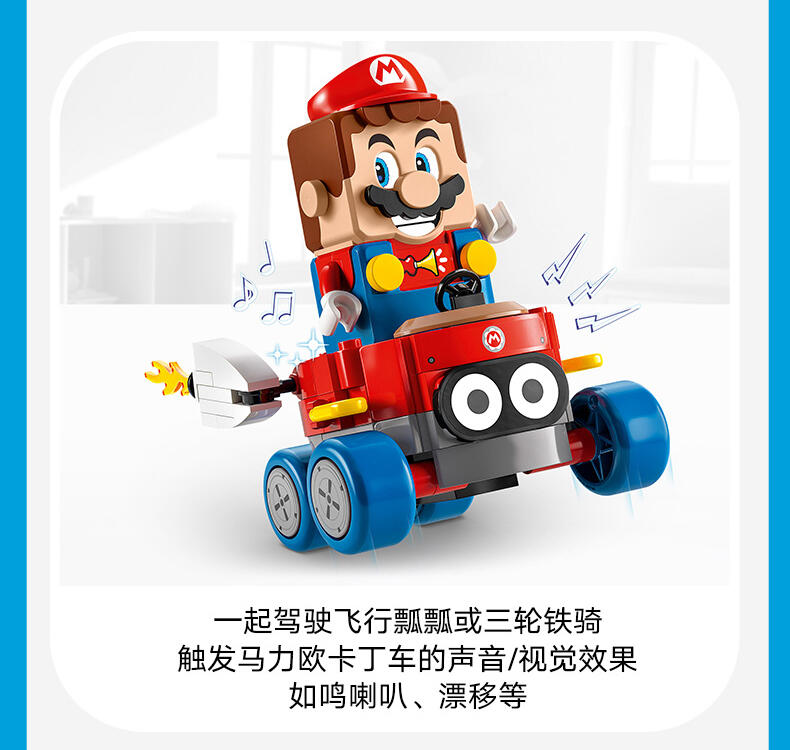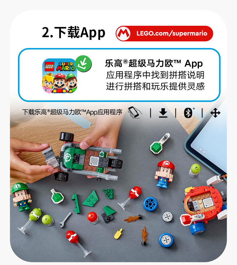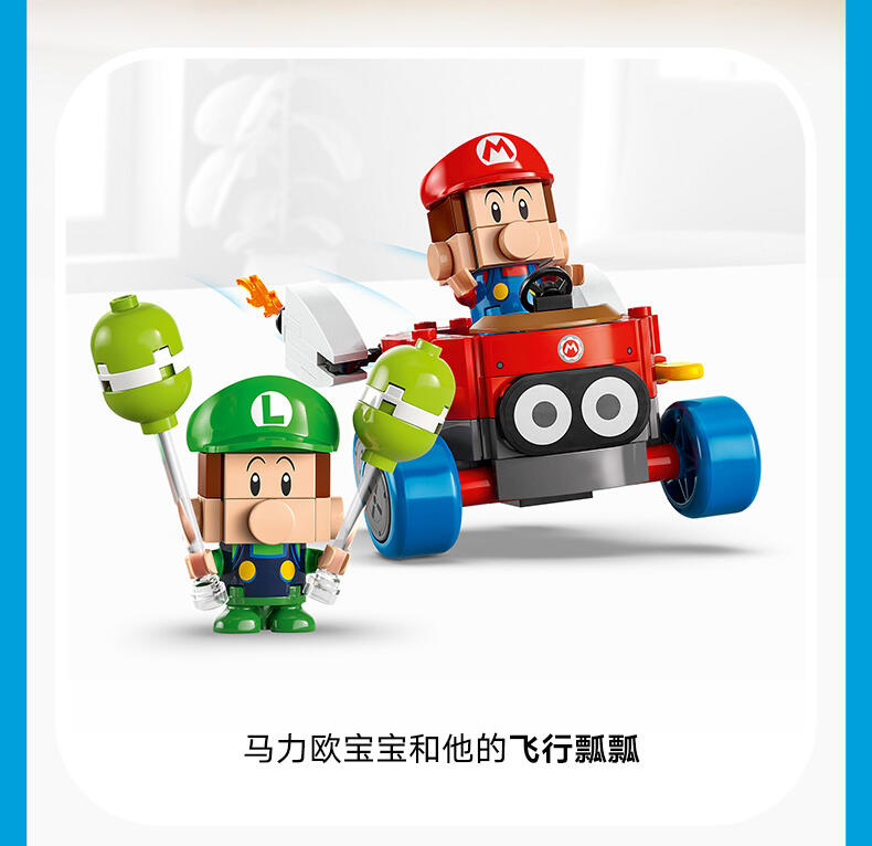 玩乐这款适合孩子的马力欧宝宝 vs 路易吉宝宝玩具套装 (72034),展开击落气球和赛车行动。本套装包含 2 个具有收藏价值的任天堂 人物——马力欧宝宝和路易吉宝宝,以及他们的座驾飞行瓢瓢和三轮铁骑,可作为一份令 8 岁及以上的男孩、女孩和游戏玩家激动不已的生日礼物。每辆积木拼搭的汽车都可以发射炮弹,还有 6 个积木拼搭的气球(3 个红色,3 个绿色)可供瞄准。谁会率先击落气球?将乐高 马力欧 、乐高 路易吉 或乐高 碧姬 人偶(来自套装 71439、71440 或 71441 – 单独出售)放入任一卡丁车进行交互式玩乐,触发马力欧卡丁车的声音/视觉效果,如比赛开始、鸣喇叭和漂移。可从包装盒中或乐高 超级马力欧 应用程序上找到这款任天堂套装的拼搭说明,还可以查看其它的乐高超级马力欧:马力欧卡丁车套装(单独出售),发现更多可供比赛和对战的角色和车辆。
