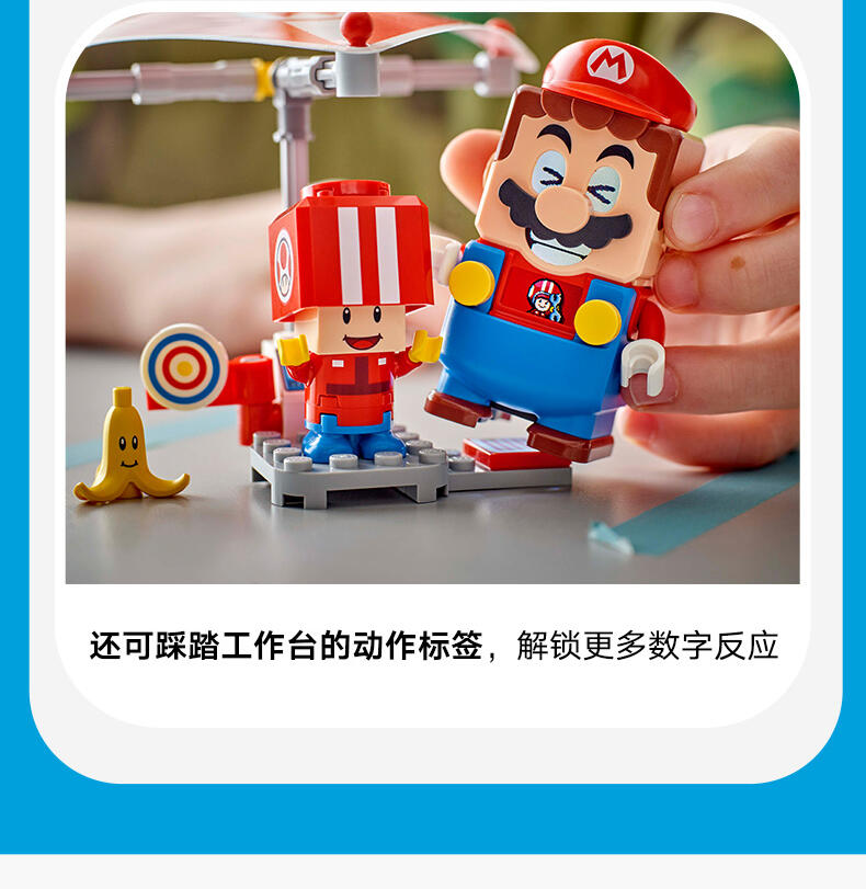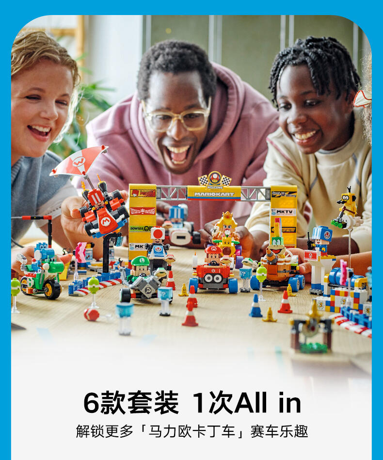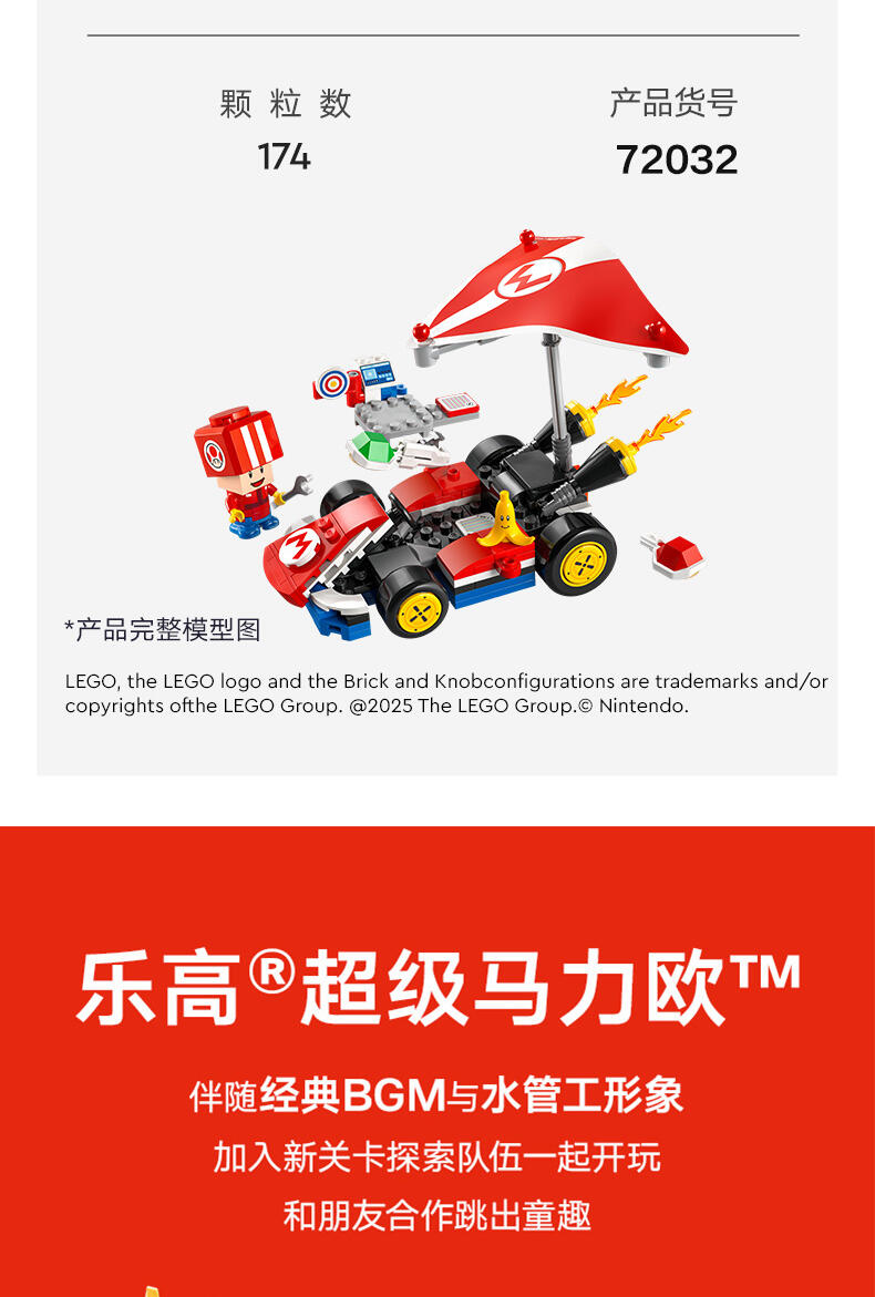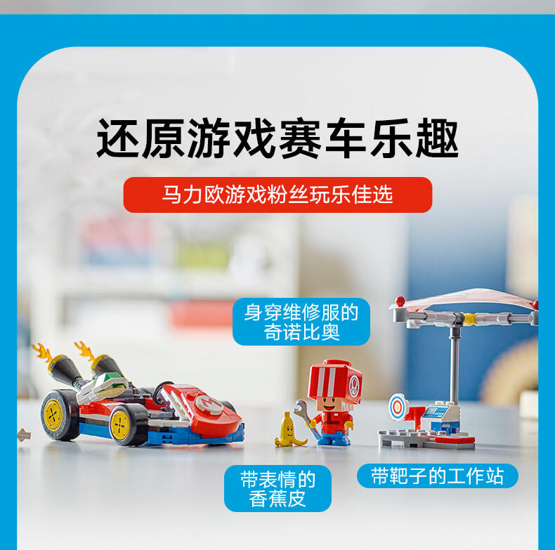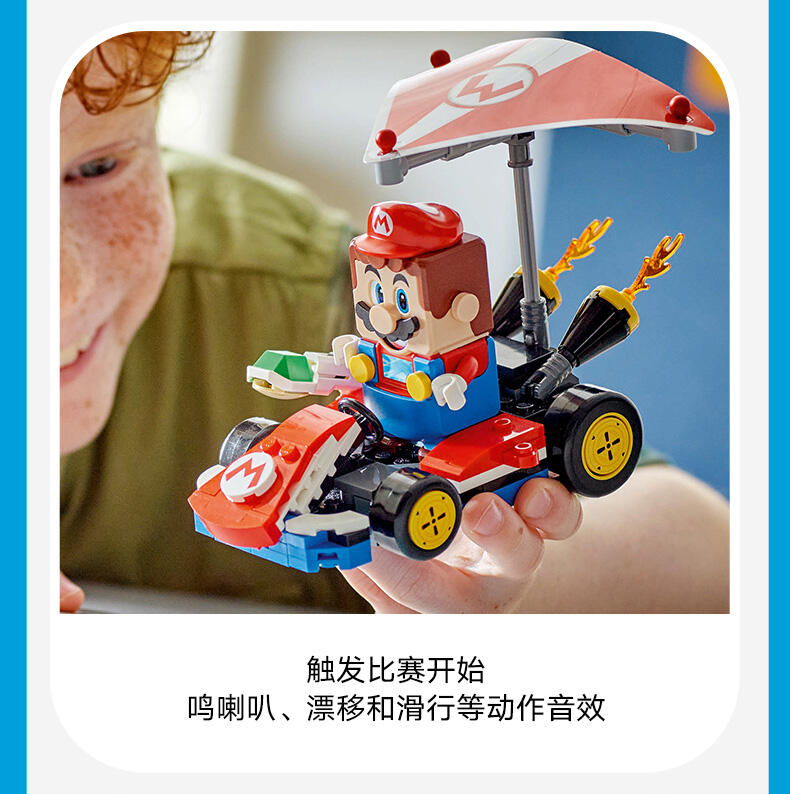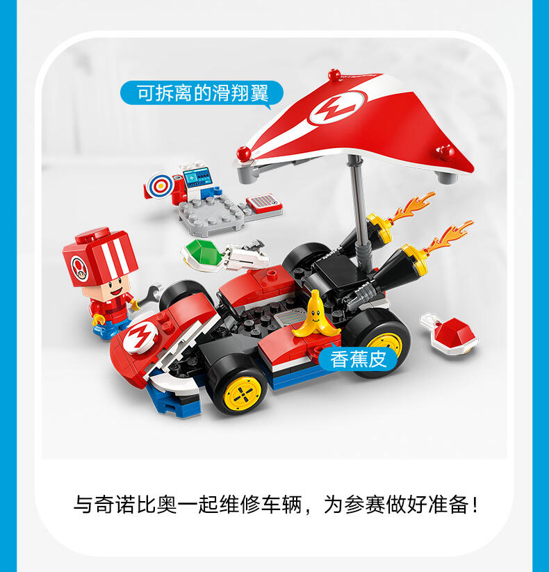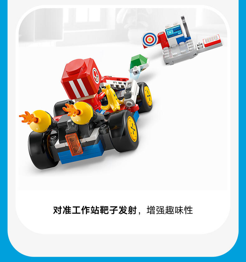 玩乐这款适合孩子的汽车玩具套装 (72032),准备驾驶一辆标准型卡丁车中进行赛车、漂移和滑翔冒险。本套装可作为一份令 7 岁及以上男孩、女孩和游戏玩家激动不已的乐高 超级马力欧生日礼物,其中包含一件源自《马力欧卡丁车》的标准型卡丁车拼搭模型、一个带有靶子的工作站,以及一个身穿红色维修人员制服的奇诺比奥(维修人员)玩偶。标准型卡丁车拥有可以拆离的超级滑翔翼,允许漂移的车轮,以及发射功能,可以向工作站的靶子发射炮弹。与乐高 马力欧 、乐高 路易吉 或乐高 碧姬 人偶(来自套装 71439、71440 或 71441 – 单独出售)一起驾驶卡丁车,进行交互式玩乐,其中包括比赛开始、鸣喇叭、漂移和滑行的声音效果,还可以踩踏工作台的动作标签,以探索更多数字反应。这款具有收藏价值的任天堂 套装非常适合独立玩乐,或作为一项社交活动。留意乐高超级马力欧:马力欧卡丁车系列的其它车辆(单独出售),与其一较高下。