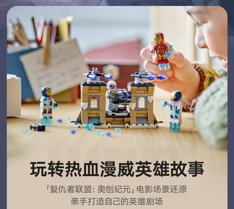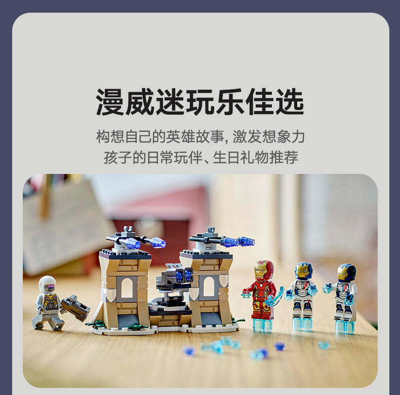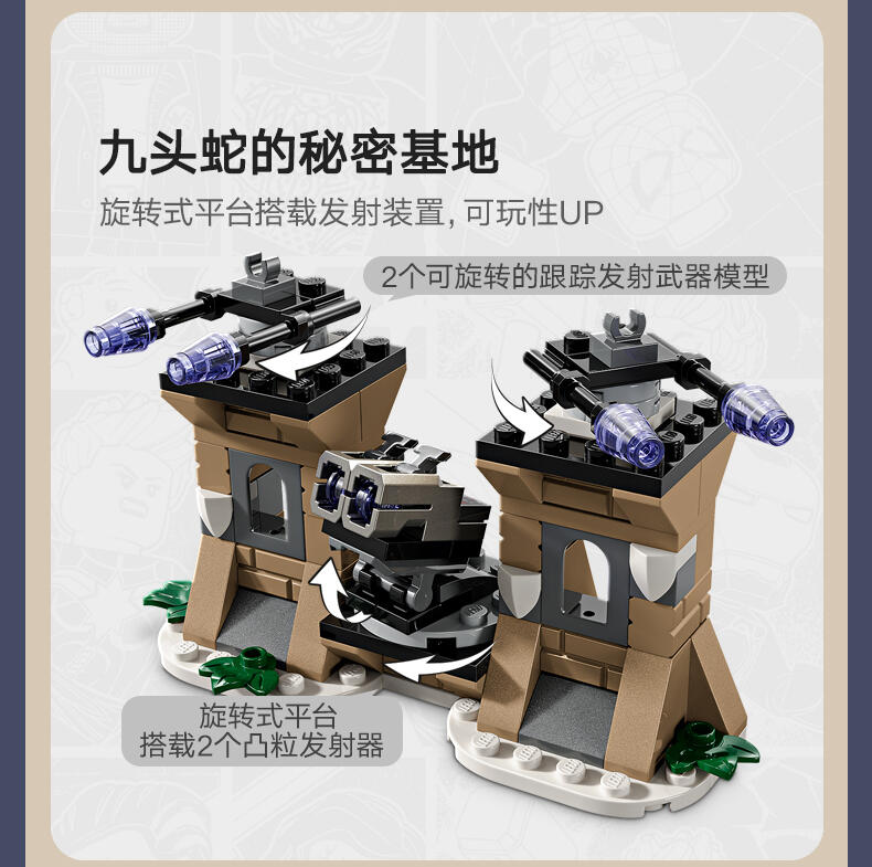 该套装包括4个迷你人偶:钢铁侠、2个铁军团和一个九头蛇骑兵。这款可构建的钢铁侠玩具有一个打开的面罩,里面有一个能量爆能器。九头蛇骑兵有一个射钉枪。透明的蓝色砖块给人一种迷你人偶在飞翔的印象。可建造的九头蛇基地有两个钉枪,连接在一个旋转的地板上,孩子们可以在那里放置九头蛇骑兵,瞄准即将到来的超级英雄。基地塔楼的顶部有两对导弹发射器(非发射型),用于抵御攻击。