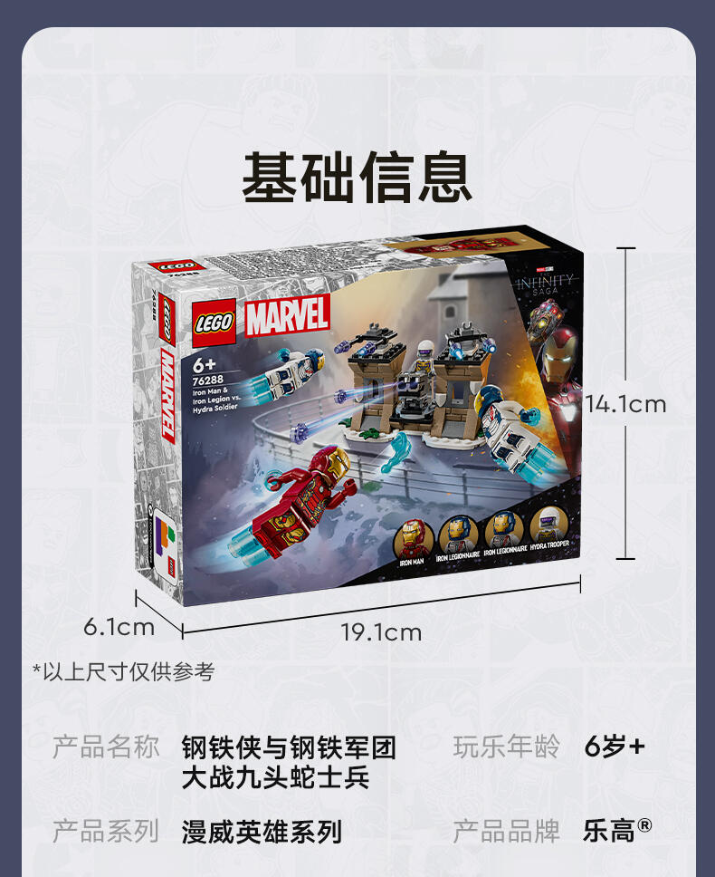 “LEGO漫威钢铁侠和铁军团与九头蛇战士(76288)可构建的超级英雄冒险玩具再现了漫威工作室《复仇者联盟:奥创纪元》中的一个场景,钢铁侠和2名铁军团成员飞往九头蛇部队的强化基地。这个可构建的超英雄游戏套装充满了酷炫的功能和配件,使其成为适合儿童,尤其是6岁及以上复仇者联盟粉丝的绝佳可构建玩具。