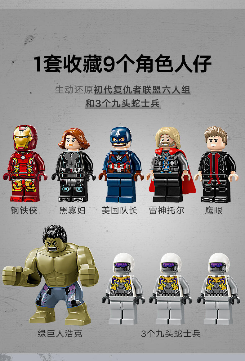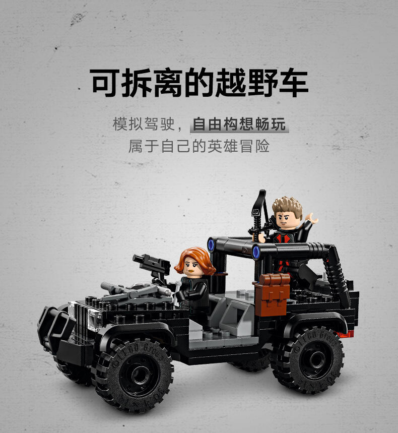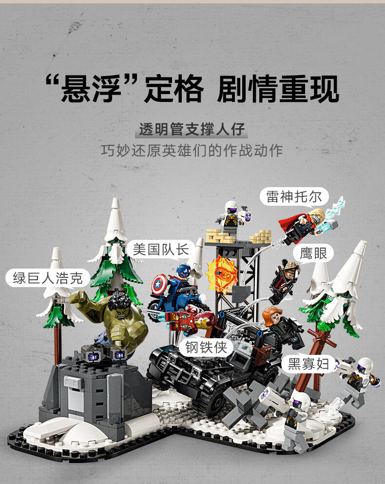 该剧基于漫威影业热门电影《复仇者联盟:奥创纪元》中的大型战斗场景。这款多功能建筑玩具包括5个复仇者联盟迷你人偶——鹰眼、黑寡妇、美国队长、钢铁侠和雷神——一个巨大的绿巨人形象和3个九头蛇部队迷你人偶。组成该套装的5个模块可以配置为无限的游戏可能性,也可以组合在一起,创造出令人印象深刻的展示作品。包括各种武器和配件,以激发富有想象力的角色扮演,以及一辆推式越野车。