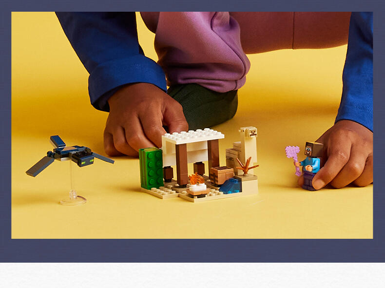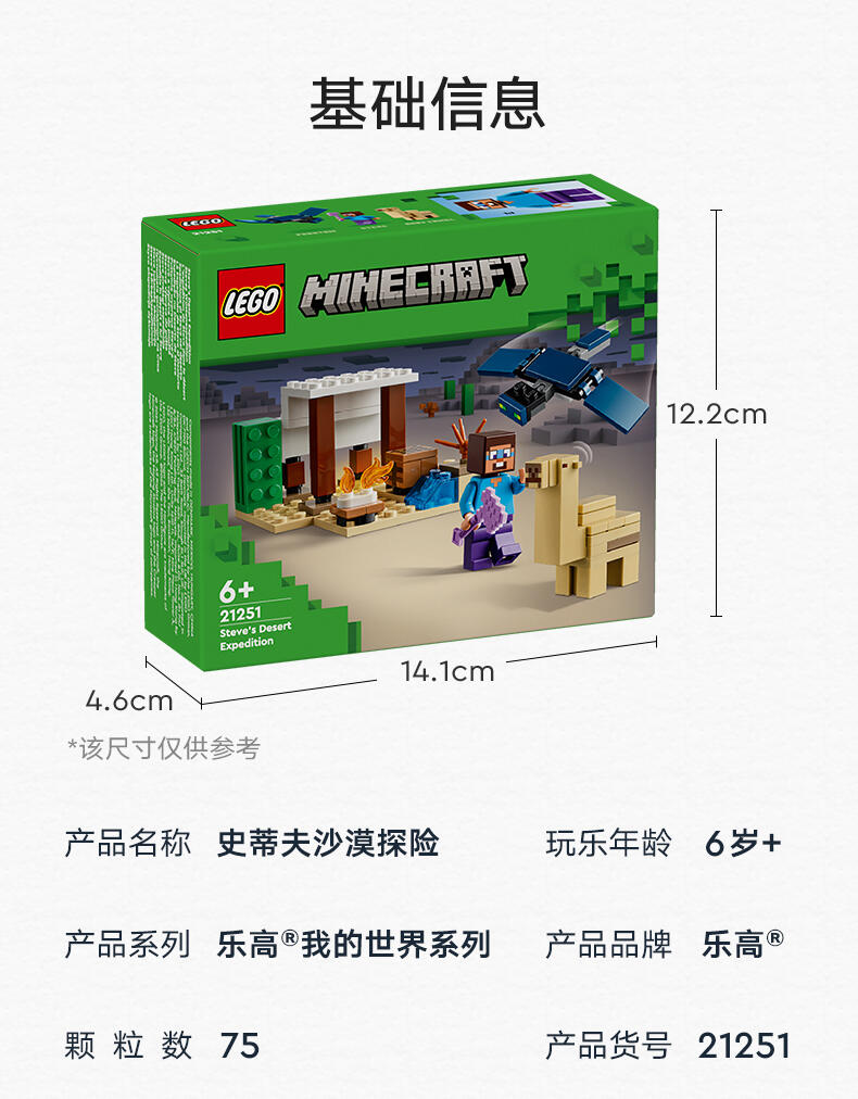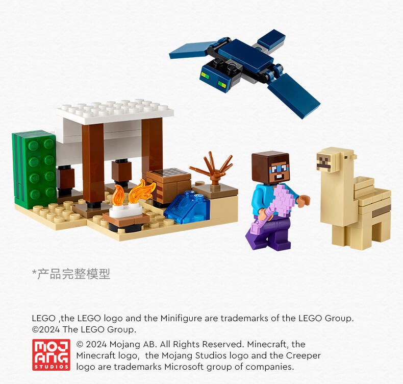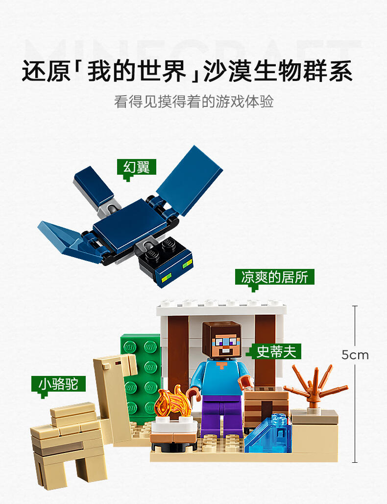 这款乐高 Minecraft 玩具适合 6+ 岁的玩家,是位于 Minecraft 沙漠生物群落中的第一款儿童拼搭玩具。史蒂夫的沙漠探险 (21251) 挑战孩子们在敌对环境中建造一座 Minecraft 房屋,然后保护它免受飞行 Phantom 的攻击><。该套装包括标志性的 Minecraft 元素,例如工作台、篝火和各种沙漠风光。这款套装是送给任何 Minecraft 粉丝的绝佳礼物,当一个带有可移动翅膀的飞行幻影俯冲下来攻击基地时,它会激发创造性的冒险和战斗动作。该玩具还具有更新的史蒂夫面部表情,以及骆驼宝宝首次出现在乐高 Minecraft 套装中。这款送给孩子和游戏玩家的礼物创意与其他乐高 Minecraft 玩具套装(单独出售)兼容。