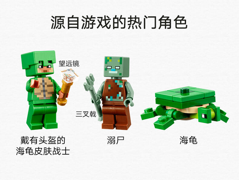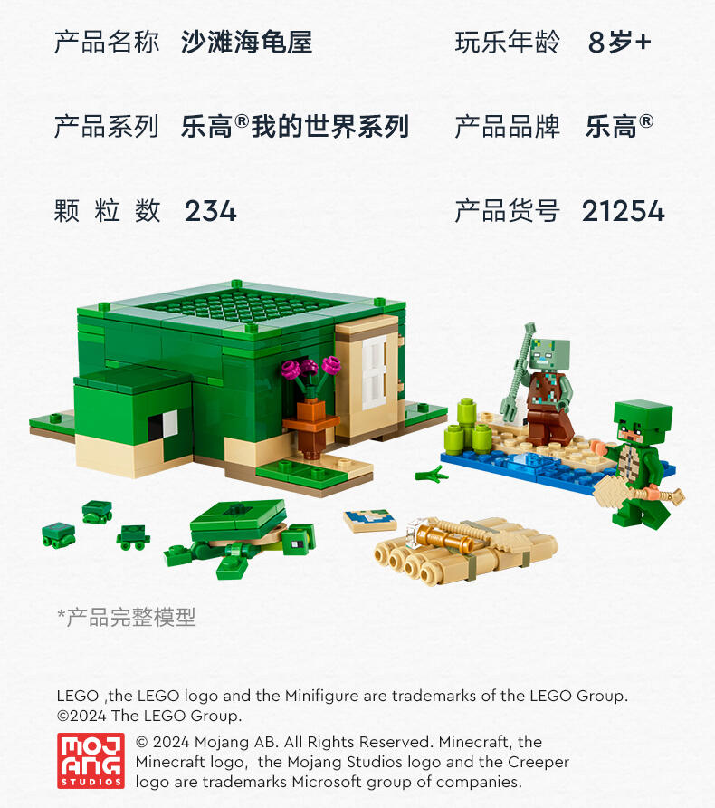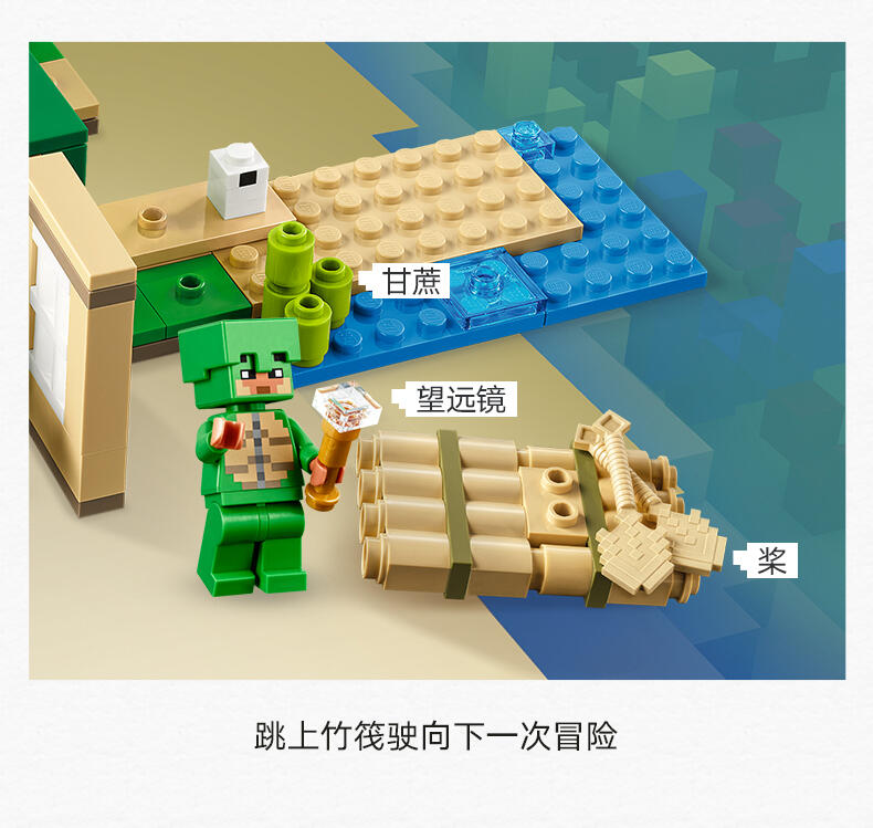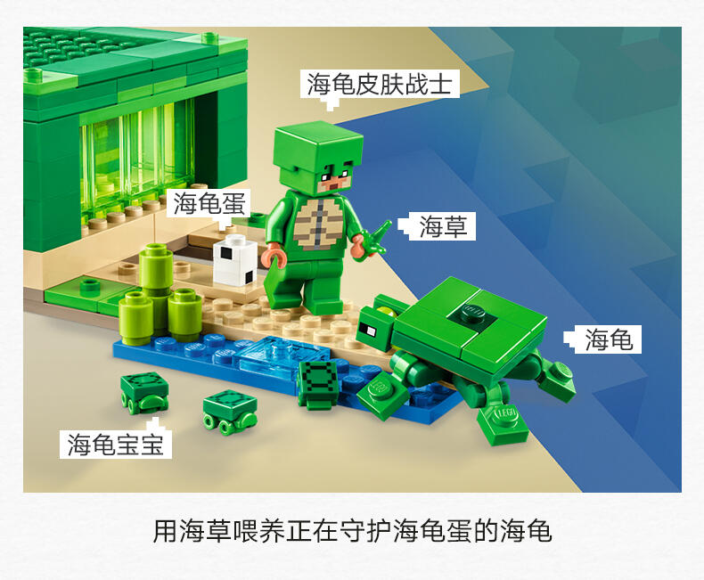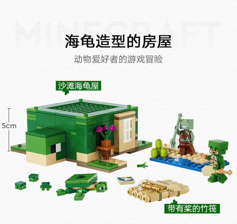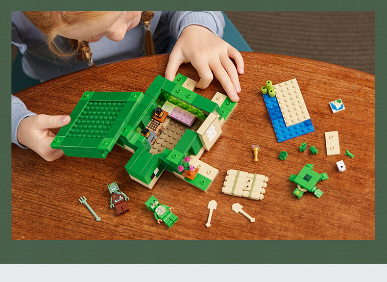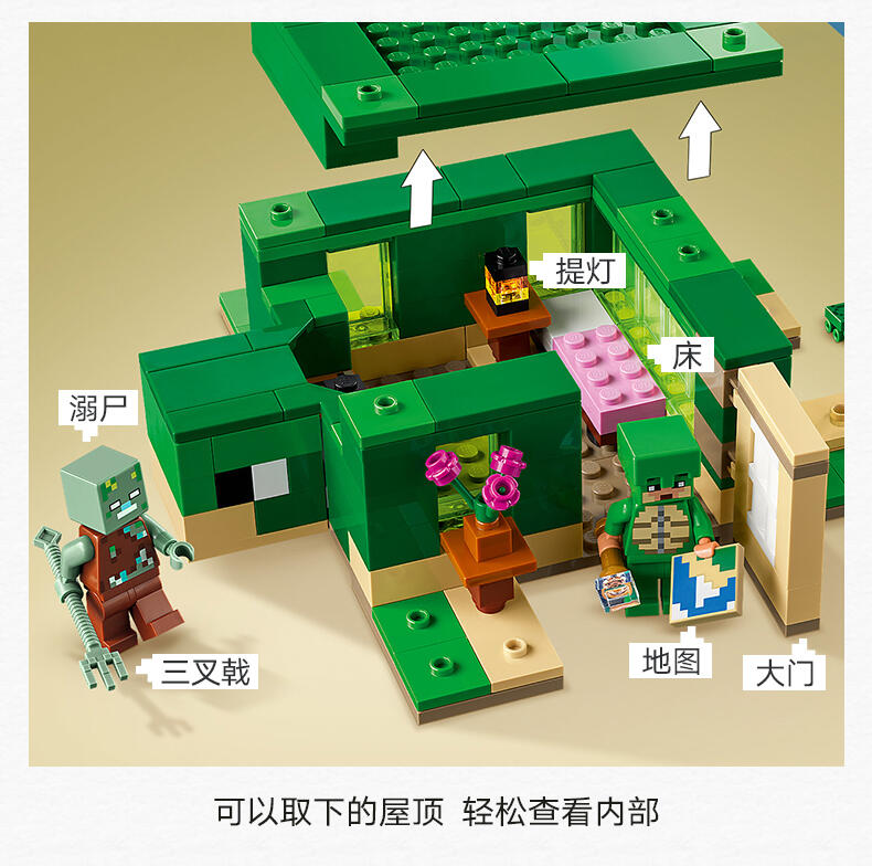 玩家建造一个龟形的《我的世界》房子,里面有窗户、灯笼、门、床、桌子、手工制作桌和炉子。可升降的屋顶便于进入内部。外面是一个海滩区,有甘蔗、龟蛋和一个带桨的竹筏。这里有熟悉的《我的世界》人物和暴徒:一个穿着龟皮和头盔的龟皮战士,一个带三叉戟的溺水者,一个啃海草的乌龟和三只小乌龟。这款游戏玩家玩具中的其他配件包括一个望远镜和一张地图。游戏动作、创意建筑和动物护理的爱好者会喜欢这个多功能玩具。为了获得额外的数字乐趣,乐高积木应用程序允许建设者放大、旋转3D模型并跟踪他们的进度。