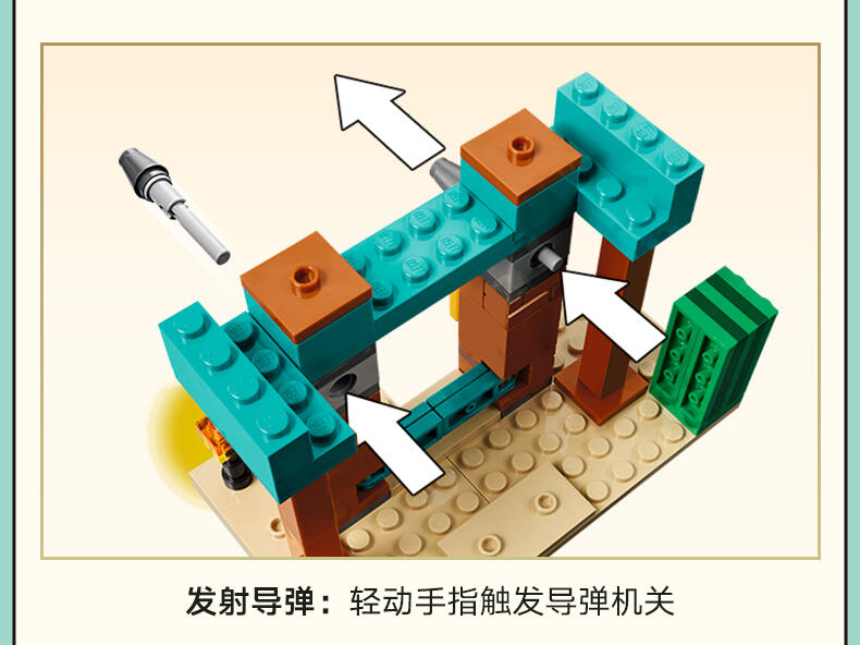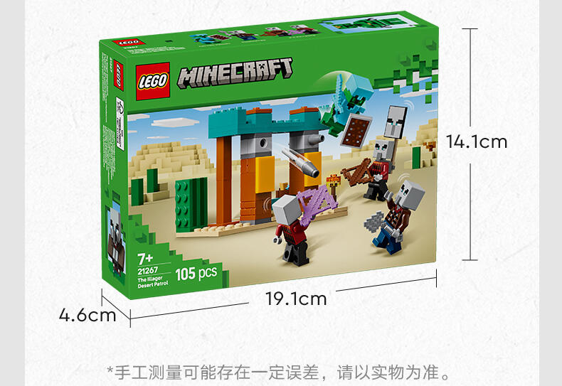 这款适合 7 岁及以上孩子的小型乐高 套装可为《我的世界》玩家带来无尽的乐趣。灾厄村民沙漠巡逻队 (21267) 包含 4 个乐高我的世界人偶,以及系列有趣的功能和逼真的配件,是一款可以带来大型《我的世界》行动的迷你玩具。以《我的世界》沙漠前哨为背景,孩子们可以扮演仙人掌骑士,装备着钻石盔甲、盾牌和宝剑。当 3 个灾厄村民人偶前来偷盗宝藏时,孩子们必须保卫前哨站。这款套装包含孩子们只需轻动手指即可发射的导弹、各式武器以及装有宝藏的木桶。如想体验额外的数字乐趣,LEGO Builder 应用程序允许孩子使用他们的设备缩放和旋转三维模型。