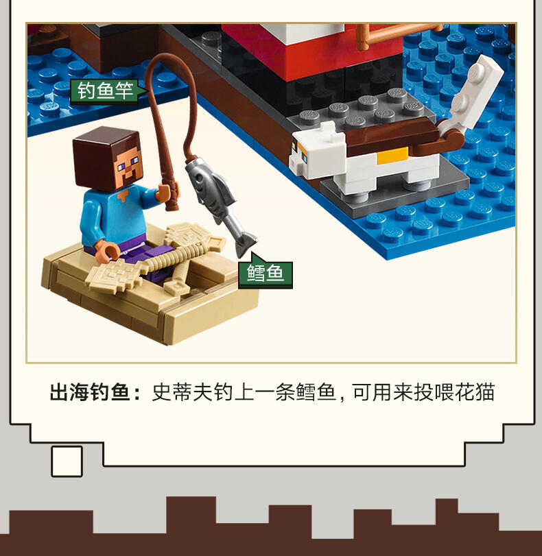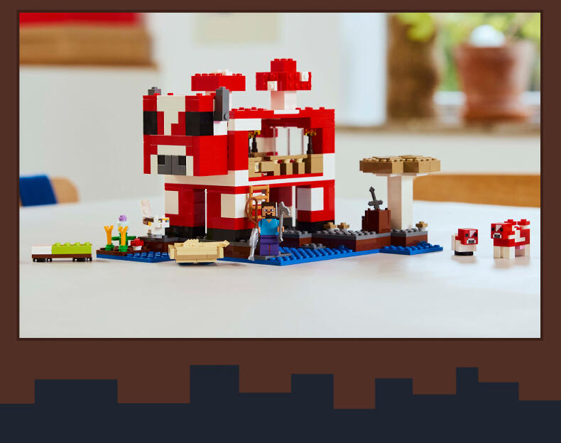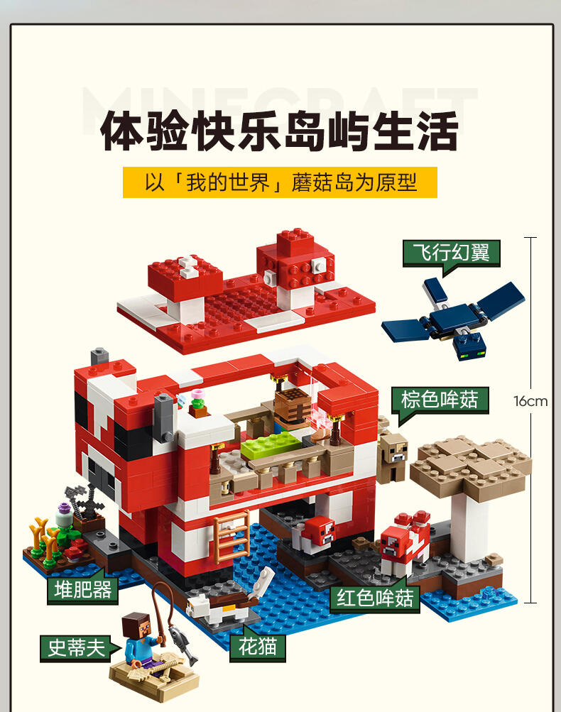 这款乐高 我的世界哞菇房屋 (21270) 非常适合《我的世界》玩家及喜欢建造房屋、照料动物和抵御偶尔空袭的孩子!这款引人入胜的玩具套装可作为 8 岁及以上男孩和女孩的超棒《我的世界》礼物。这款乐高我的世界房屋建造玩具以蘑菇岛为背景,包含深受欢迎的角色史蒂夫,以及红色哞菇、红色哞菇宝宝、棕色哞菇、花猫和敌对的飞行幻翼。这款玩具套装充满游戏特色,有一小片种有小麦、蘑菇和猪笼草的农田,旁边是堆肥器。配件包括钓鱼竿、鳕鱼、锄头、下界合金剑、碗、带桨的船、宝箱、熔炉、工作台、书架、面包和床。LEGO Builder 应用程序可为孩子们带来更多乐趣,允许他们使用自己的设备缩放和旋转三维模型。