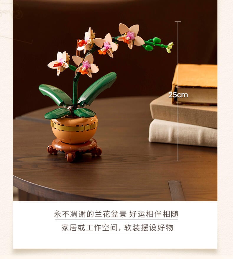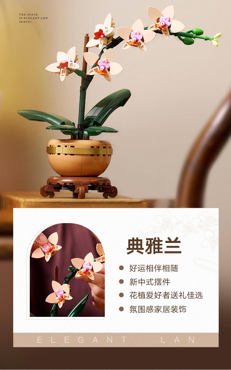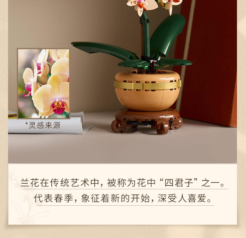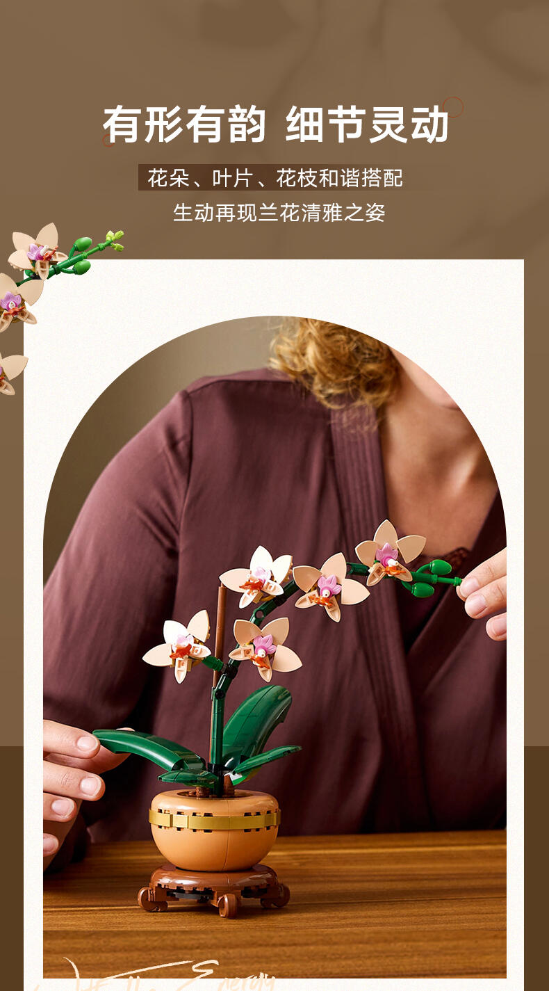 让乐高 你兰花(10343)成人建筑套件让创造力绽放。这款兰花是送给女性、男性和花迷的华丽装饰植物礼物,它是一种令人惊叹的花卉展示,永远不需要浇水。逼真的复制品以5朵盛开的兰花和几朵含苞待放的兰花为特色,还有叶子,以增加真实感。它还配有一个浅色的陶土花盆,放在一个美丽的木制底座上,让初露头角的花店很容易将乐高花自豪地展示为美丽的家居或办公室装饰,为任何生活或工作空间带来大自然的宁静。兰花是传统艺术中被称为“四君子”的四种经典美丽植物的一部分,代表春天的季节,被认为象征着新的开始,使这款成人乐高套装成为一份贴心的乔迁礼物、生日礼物或特殊场合的善意姿态。