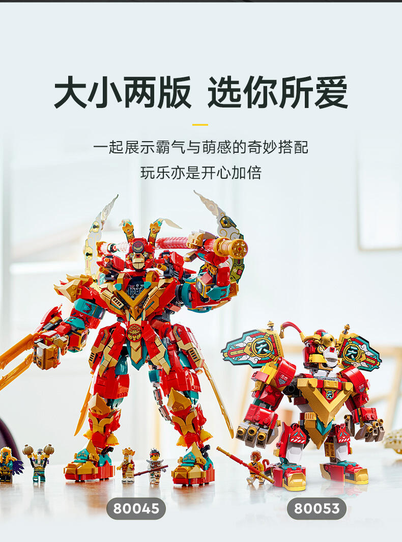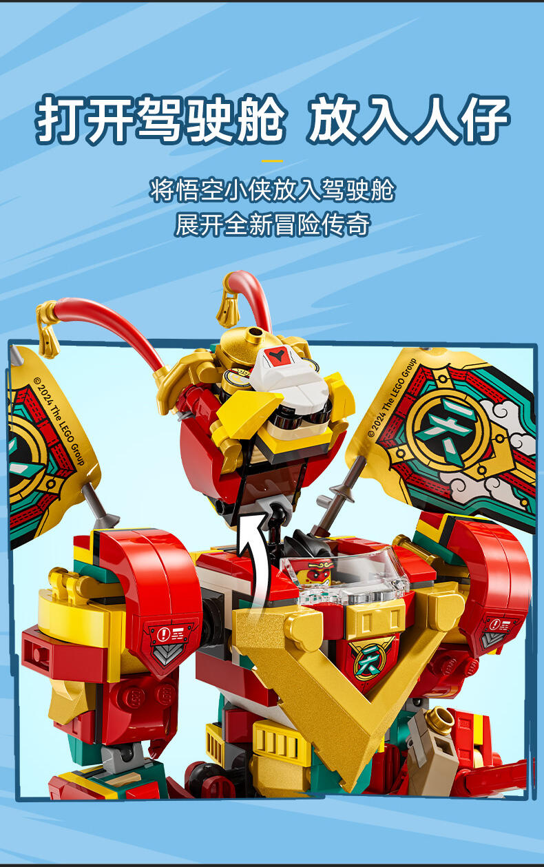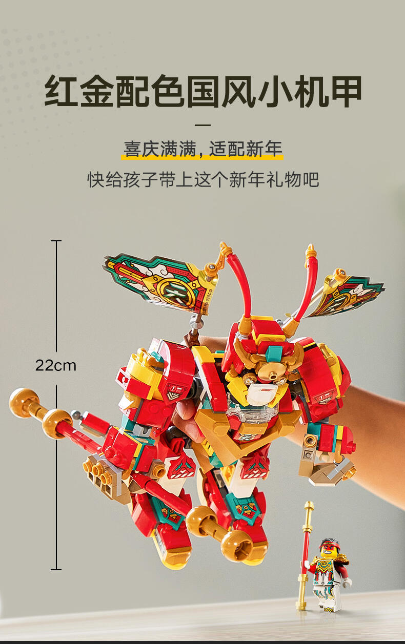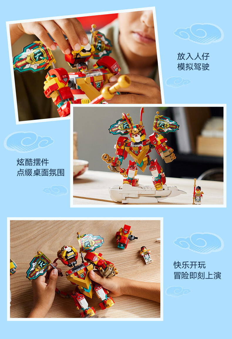 用这款乐高 悟空小侠 悟空小侠迷你机甲(80051)拼砌盒组中可摆姿势的玩偶启发 8 岁以上孩子、男生、女生与机甲迷。此拼砌玩具展示盒组包含可摆姿势的迷你机甲可动玩偶,有铰接式手臂、腿部和尾巴、旗帜,以及可后倾以便进入驾驶舱的头部。此盒组还有金箍棒、悟空小侠人偶与拼砌式云朵展示座,可让热爱机甲的孩子在游戏时间结束后展示充满想象力的迷你机甲玩具。