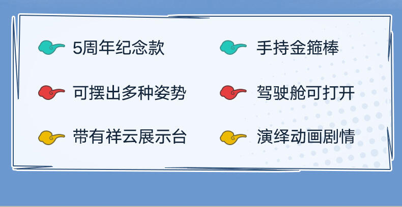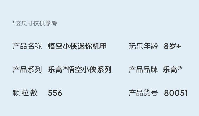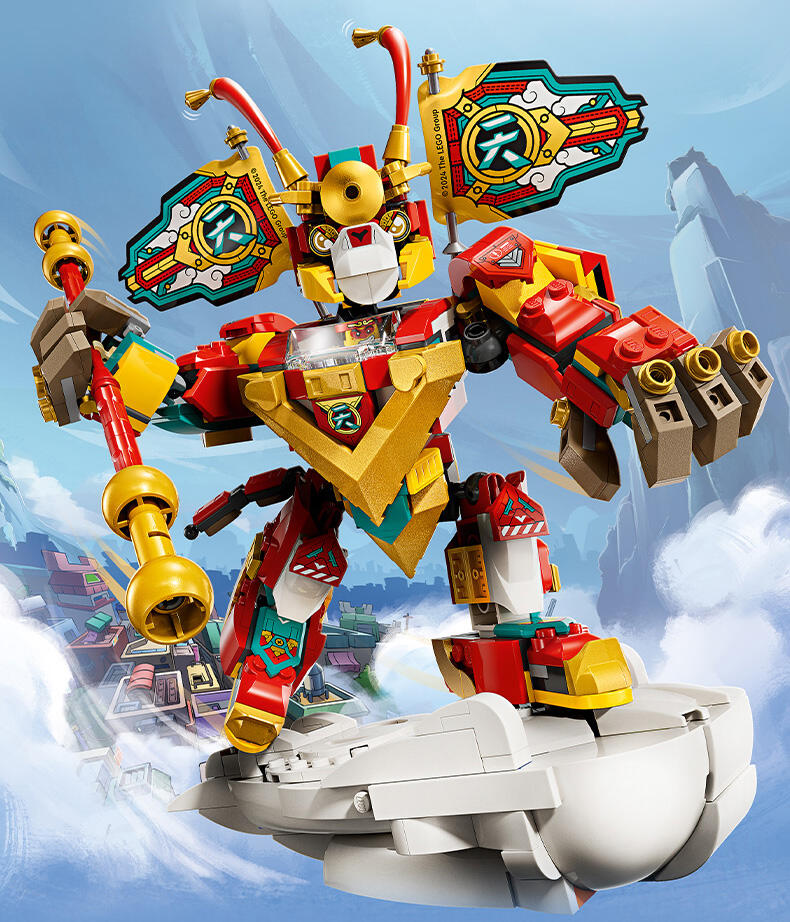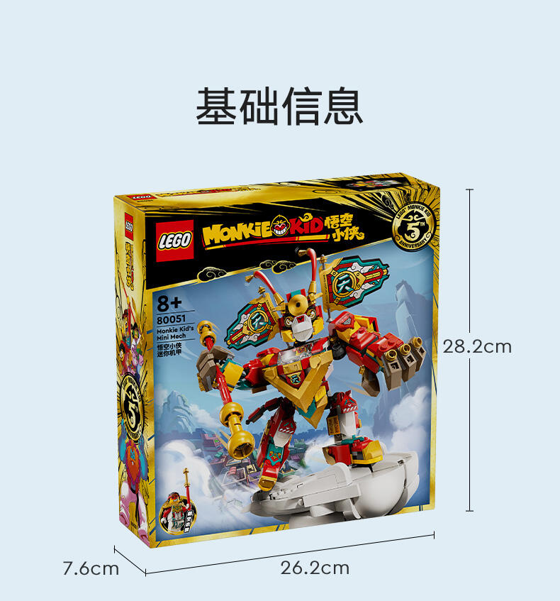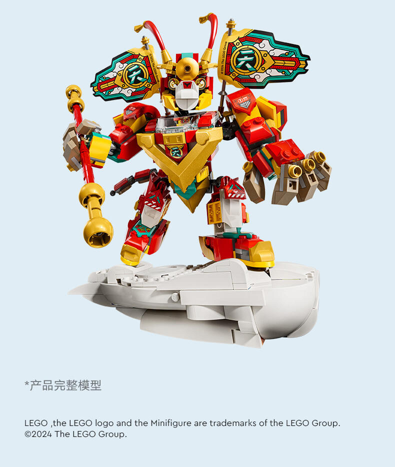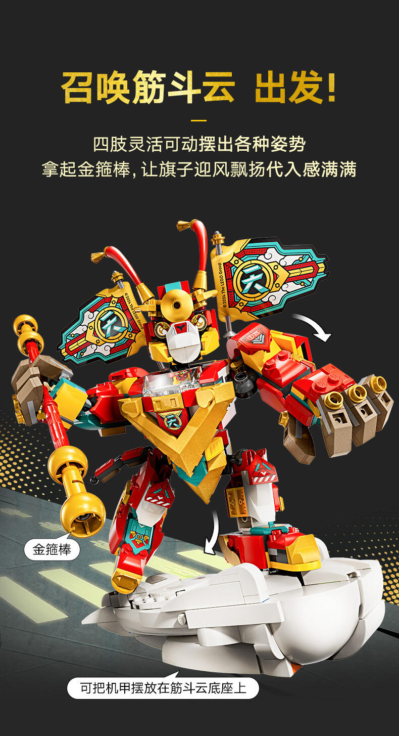 用这款乐高 悟空小侠 悟空小侠迷你机甲(80051)拼砌盒组中可摆姿势的玩偶启发 8 岁以上孩子、男生、女生与机甲迷。此拼砌玩具展示盒组包含可摆姿势的迷你机甲可动玩偶,有铰接式手臂、腿部和尾巴、旗帜,以及可后倾以便进入驾驶舱的头部。此盒组还有金箍棒、悟空小侠人偶与拼砌式云朵展示座,可让热爱机甲的孩子在游戏时间结束后展示充满想象力的迷你机甲玩具。