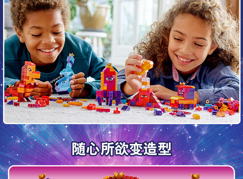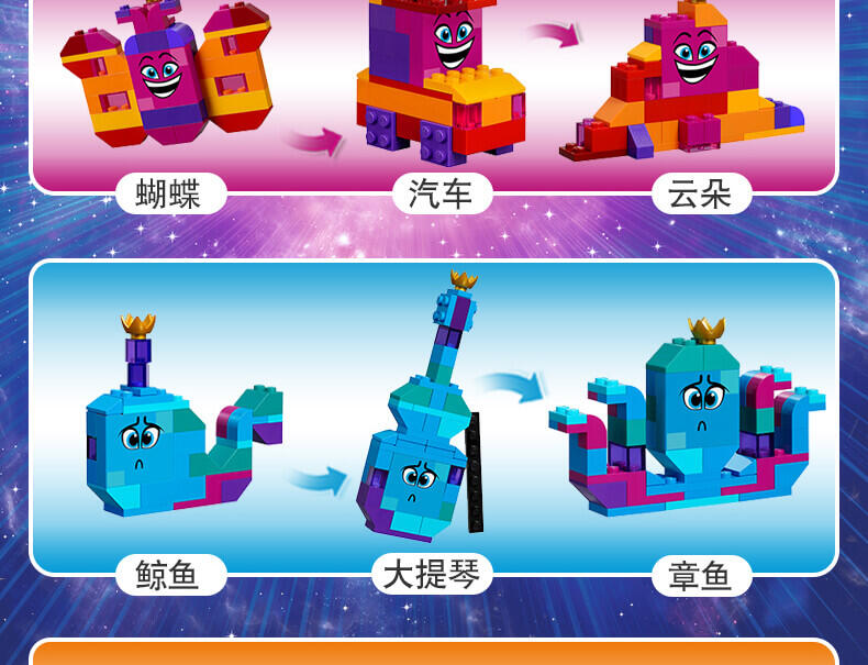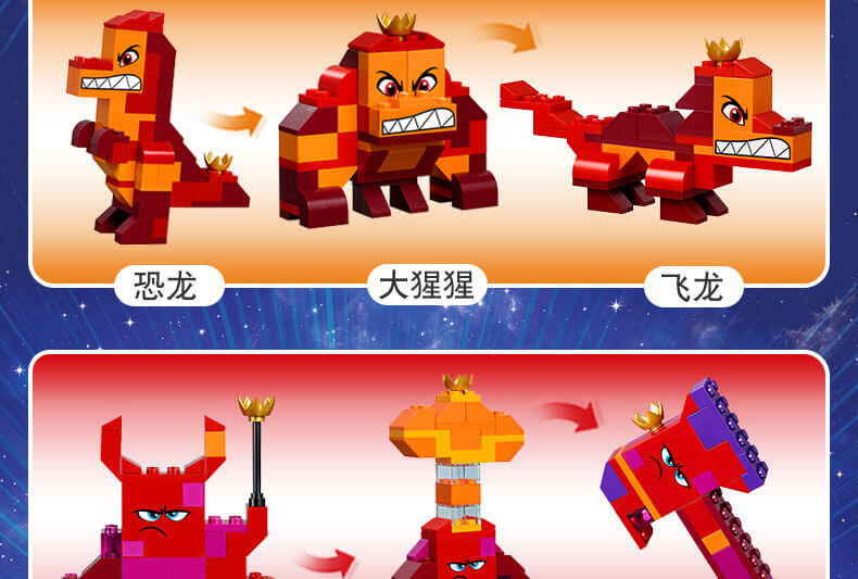 拼砌花艾薇娃娜比女王并将她重组成各种不同外型,就像THE LEGO MOVIE 2 里一 样!创造一个哀伤的大提琴、愤怒的恐龙、快乐的汽车及更多东西。发挥你的拼砌大师想象力!