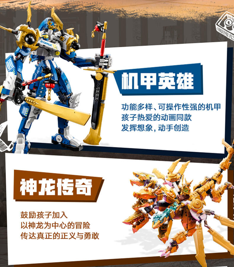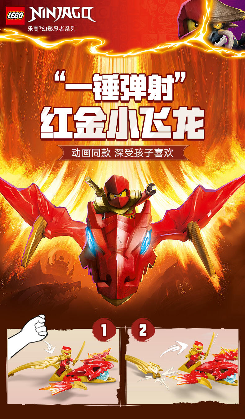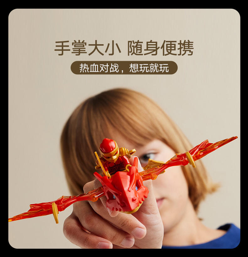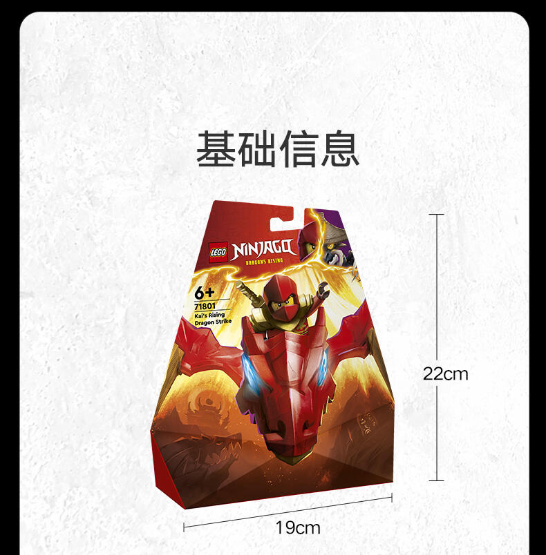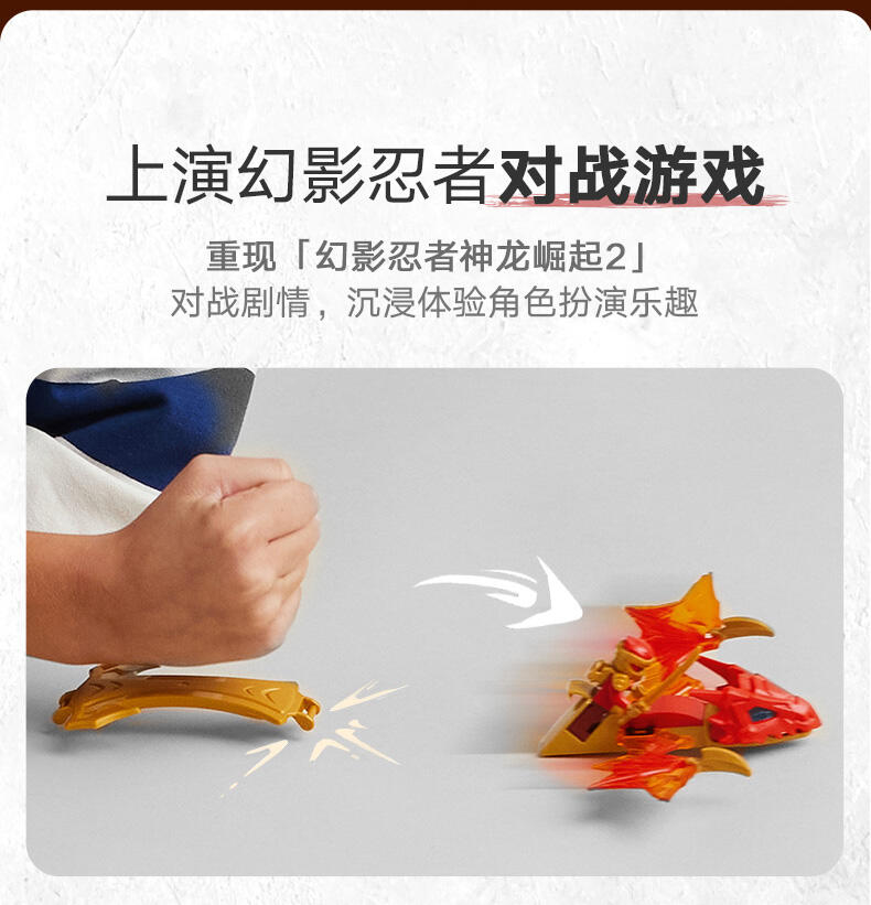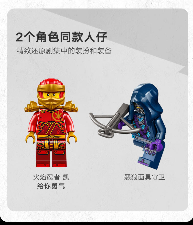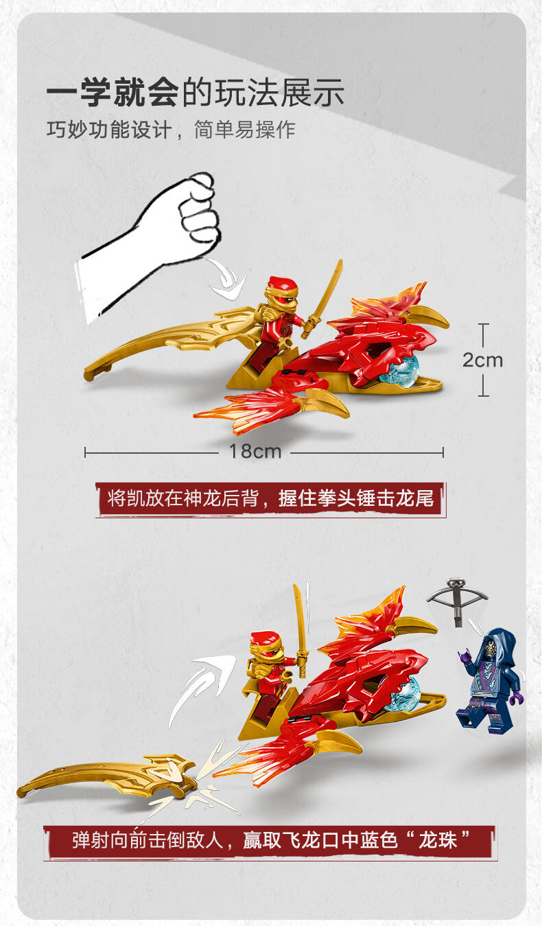 这款忍者玩具套装配有两个乐高忍者角色:瑞龙凯,他配有迷你武士刀配件,可以骑上可构建的龙动作人偶,以及带弩配件的狼面具护卫队。孩子们可以在这些乐高忍者角色之间上演战斗,从龙形玩具的优雅嘴巴中赢得一个蓝色的龙力量元素。乐高忍者系列的其他儿童可建造忍者玩具包括机械、车辆和寺庙,因此粉丝们可以与他们的英雄角色扮演故事(套装单独出售)