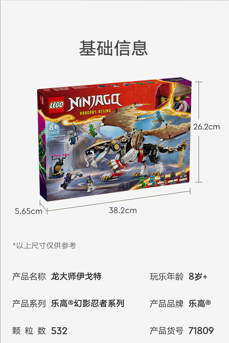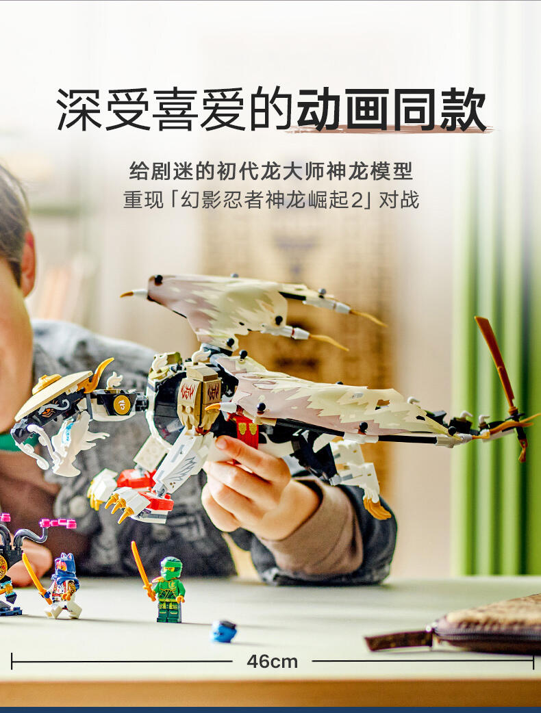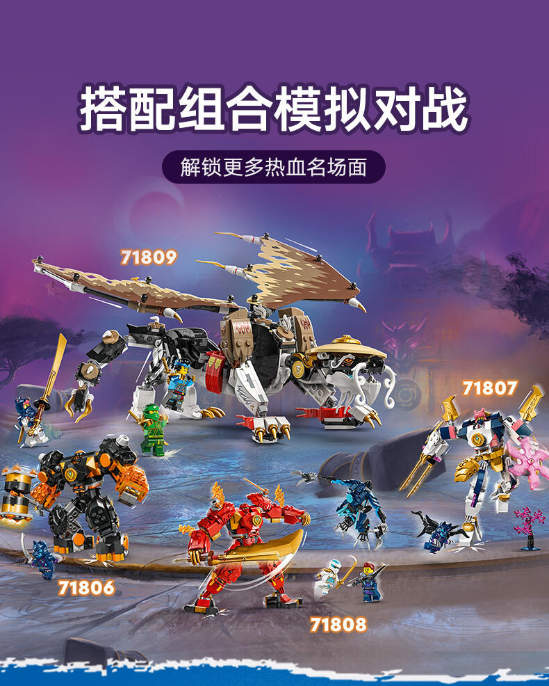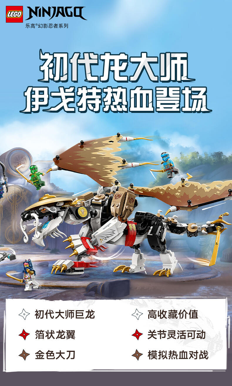 8 岁以上孩子可用这款龙长老艾格特(71809)大型英雄玩具盒组,重现《旋风忍者 猛龙崛起》电视影集第 2 季的刺激冒险。这是旋风忍者系列史上第一款龙长老玩具,有可动的腿、尾巴、头与薄翼、自己的剑配件,以及背上摆放武士刀配件的支架。