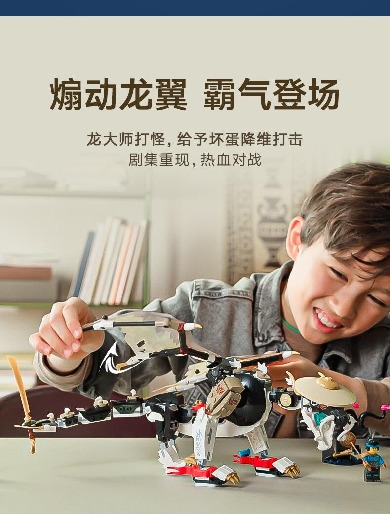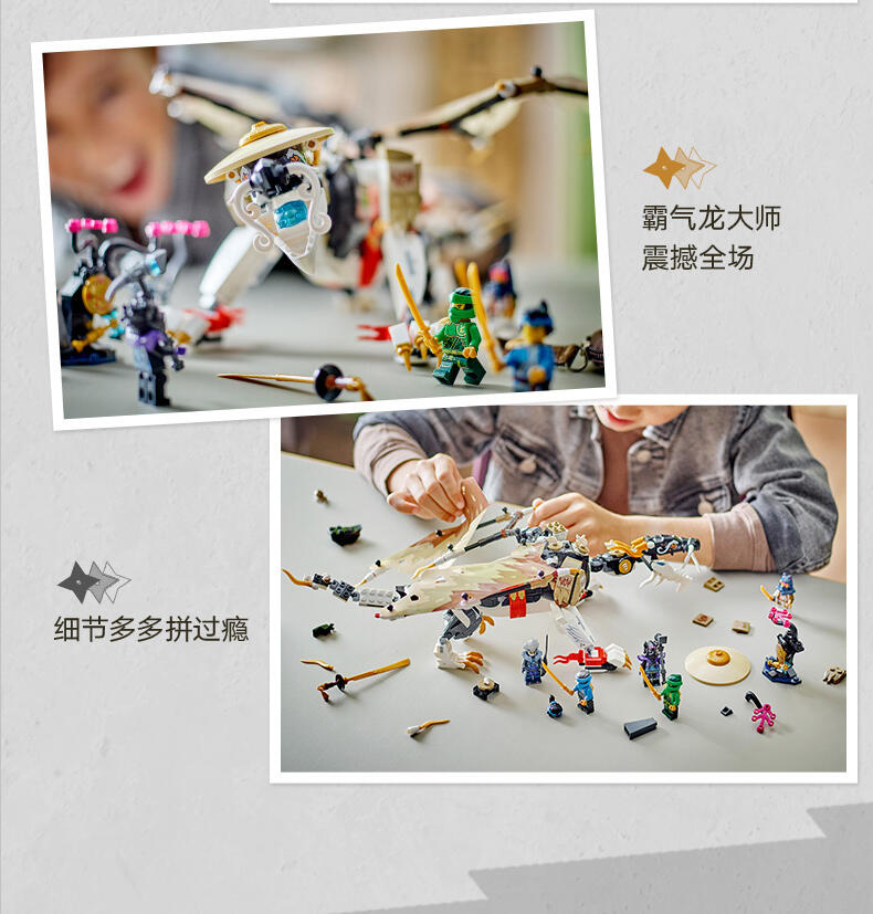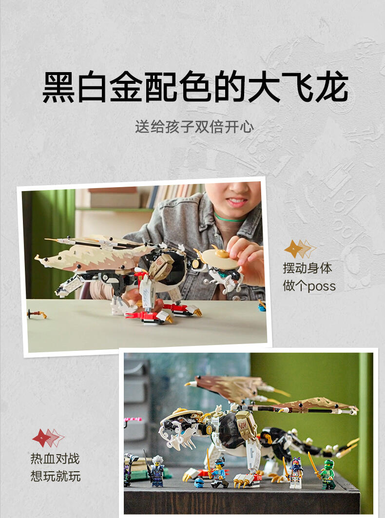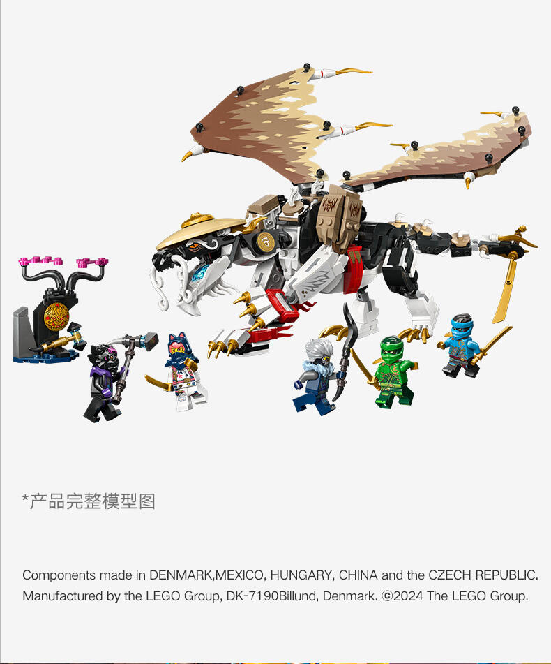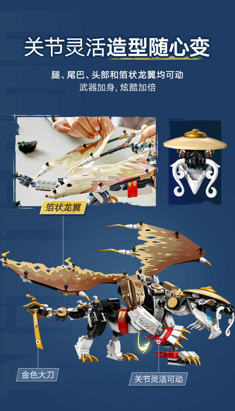 8 岁以上孩子可用这款龙长老艾格特(71809)大型英雄玩具盒组,重现《旋风忍者 猛龙崛起》电视影集第 2 季的刺激冒险。这是旋风忍者系列史上第一款龙长老玩具,有可动的腿、尾巴、头与薄翼、自己的剑配件,以及背上摆放武士刀配件的支架。