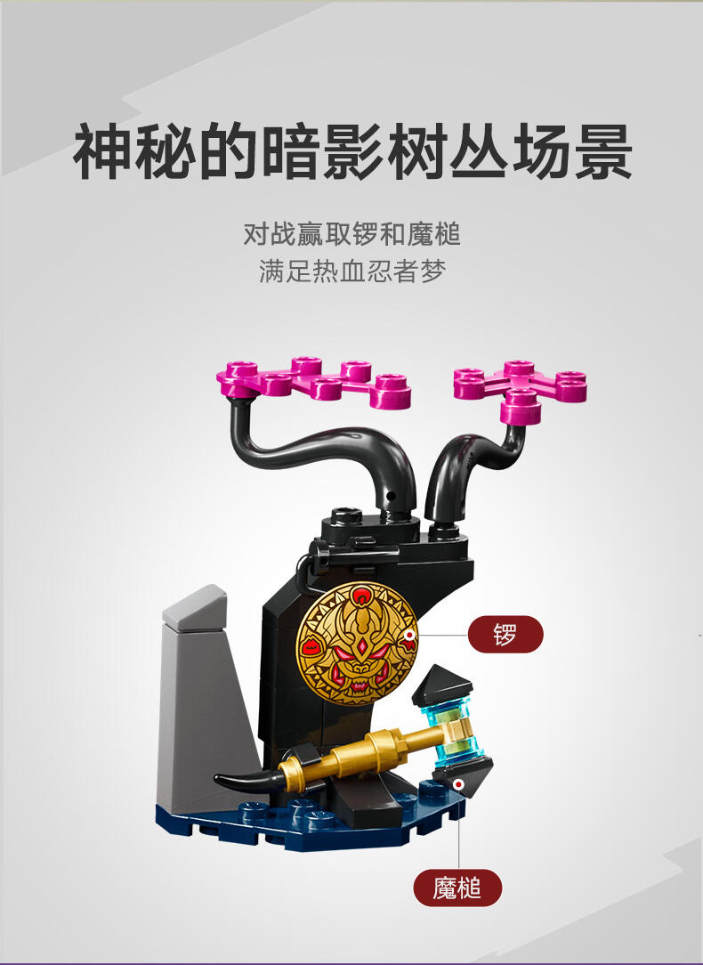 此冒险玩具配有 5 只人偶-附剑配件的忍者战士劳埃德、索拉与赤兰,以及邪恶双人组:附锤子的拉斯君王和附剑配件的辛德-让孩子能上演忍者战斗场景。里面还有 1 棵积木组成的小树,包含魔法槌子与终结之锣配件,这些旋风忍者角色正在为赢得这些物品而战。