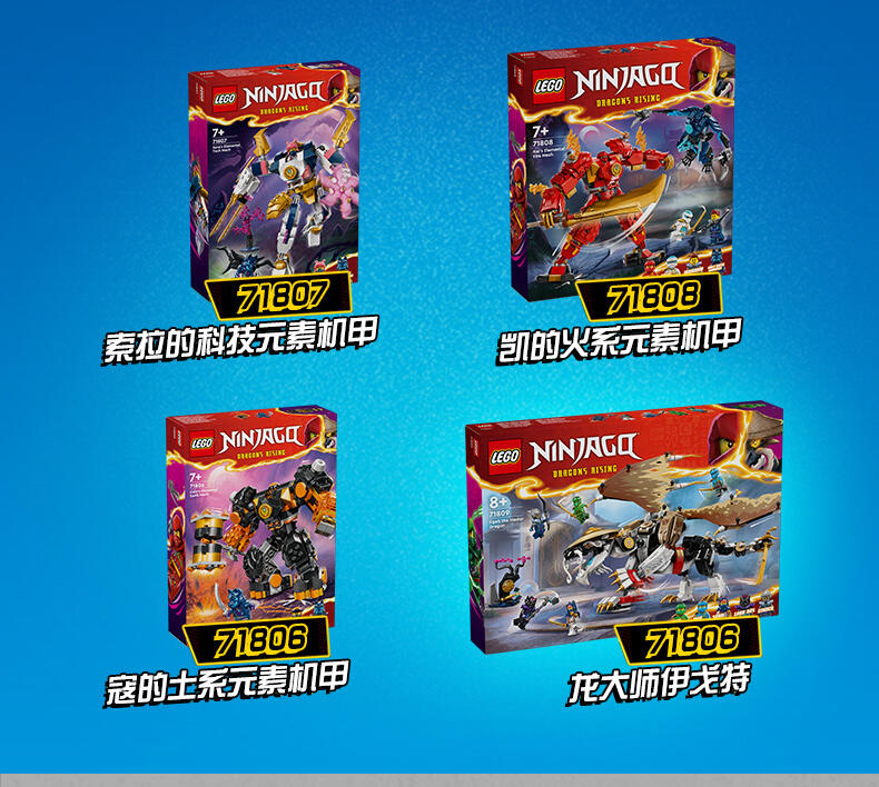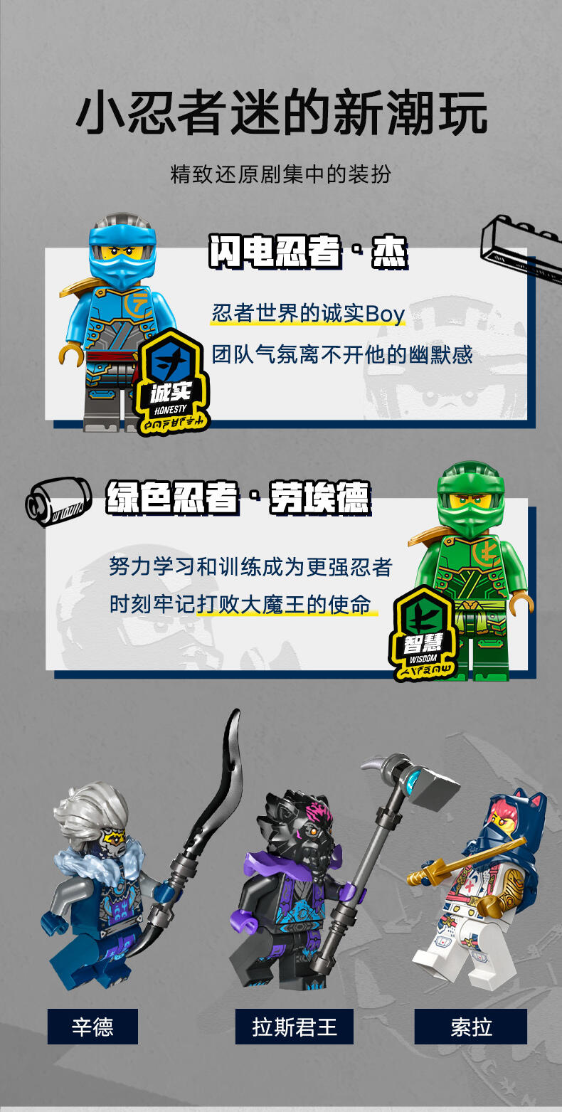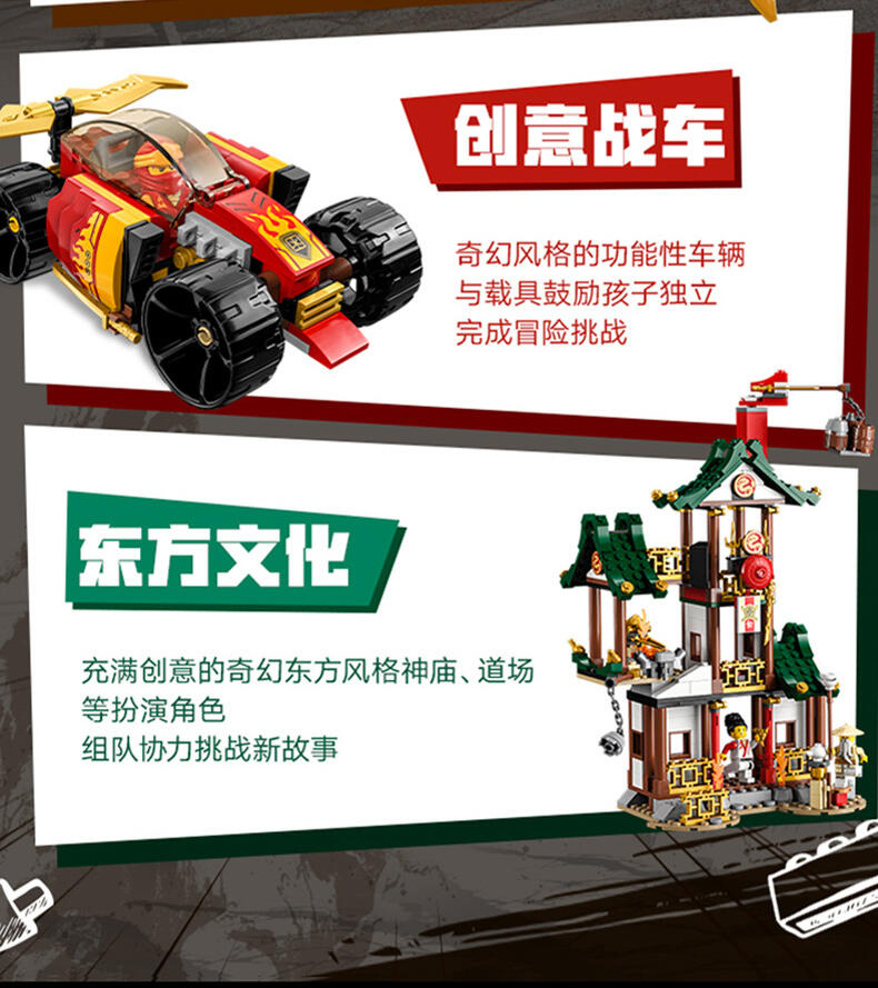 乐高 旋风忍者系列拼砌式忍者儿童玩具包含机械人、交通工具与寺庙,可用于精采的角色扮演冒险。每款战斗盒组均可使用 LEGO Builder 应用程序制作,此应用程序指引你与你的孩子展开简单又直觉的拼砌冒险。