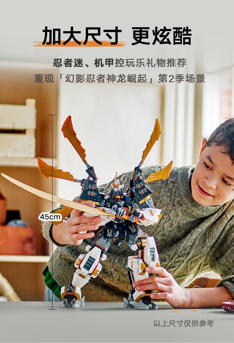 Cole的Titan Dragon Mech(71821)冒险玩具适用于12岁以上的男孩和女孩,让孩子们玩《忍者龙崛起》电视剧第二季的动作场面。这是有史以来最大的忍者巨人机械,具有可折叠的手臂、腿、头部、身体、旋转点和关节,孩子们可以将其放置在战斗姿势、一对可折叠的龙翼和一把大刀中。