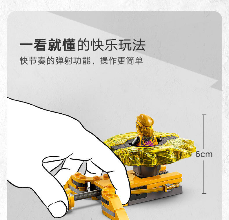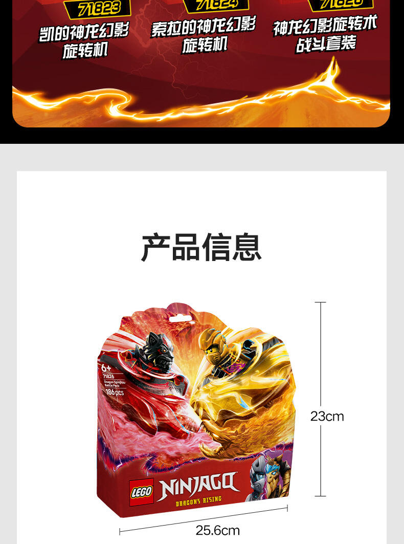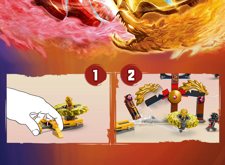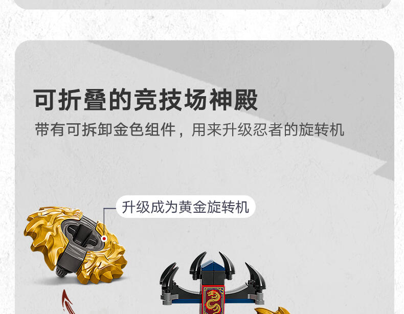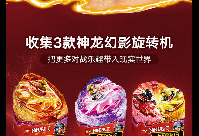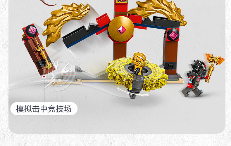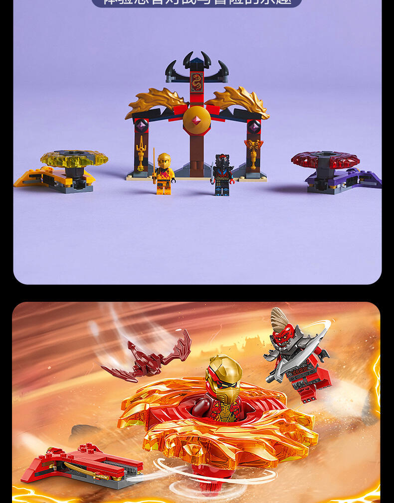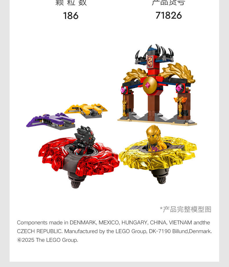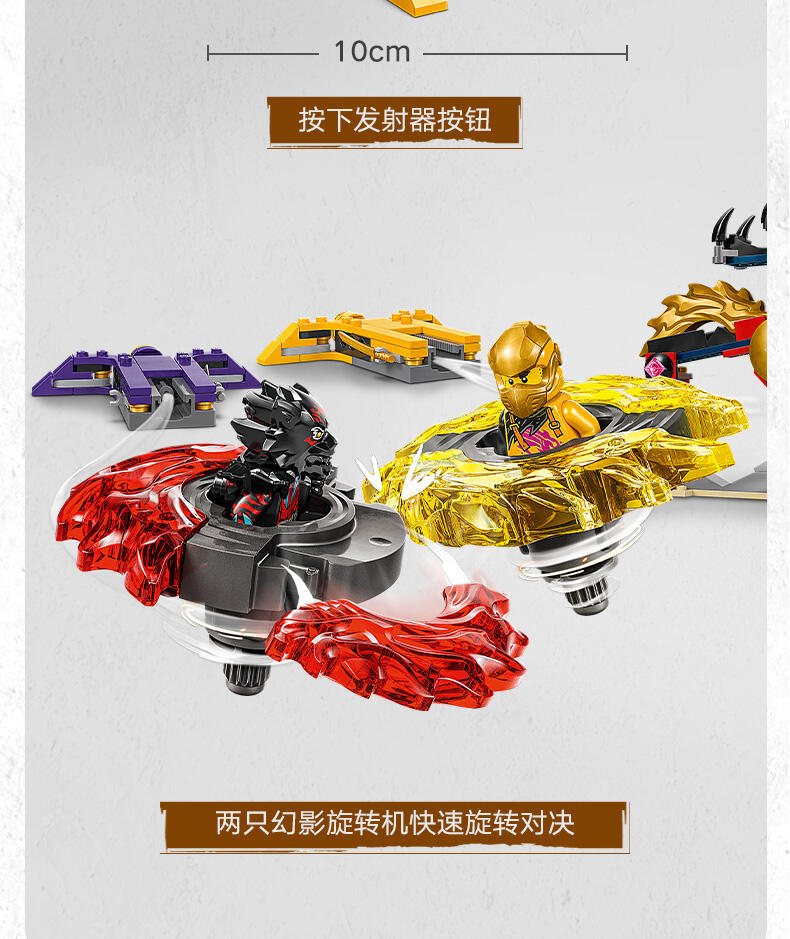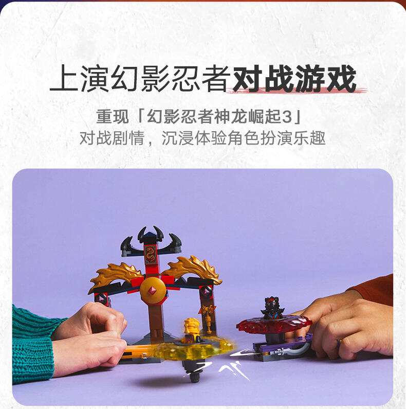 这款神龙幻影旋转术战斗套装 (71826) 玩具套装允许 6 岁及以上的男孩和女孩表演电视剧《幻影忍者神龙崛起》第 3 季中的精彩行动。这款小型的乐高 动作玩具套装包含一座竞技场神殿,2 个小人仔:阿林和拉斯,以及 2 个神龙幻影旋转机玩具,可供孩子们将小人仔放入发射器,然后发射,让他们展开旋转大战。孩子们可以进行精彩的角色扮演冒险,在阿林的黄色旋转机和拉斯的红色旋转机之间上演善恶之战,两个旋转机都带有可拆卸式能量组件。幻影忍者角色们可以用金色组件升级他们的旋转机,并通过击中竞技场并使其倒塌来获胜。乐高幻影忍者系列套装(单独出售)和战斗拼搭玩具包含各式各样的机甲、神龙和交通工具,以便粉丝们展开精彩的忍者行动。可以使用 LEGO Builder 应用程序拼搭和创造每款玩具套装,它会引导您及您的孩子踏上轻松直观的拼搭冒险之旅。