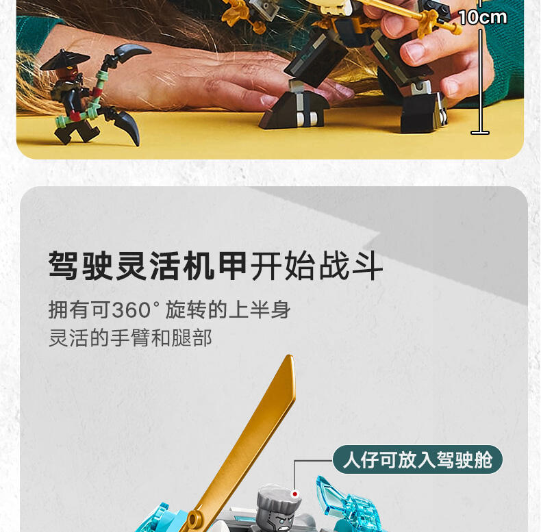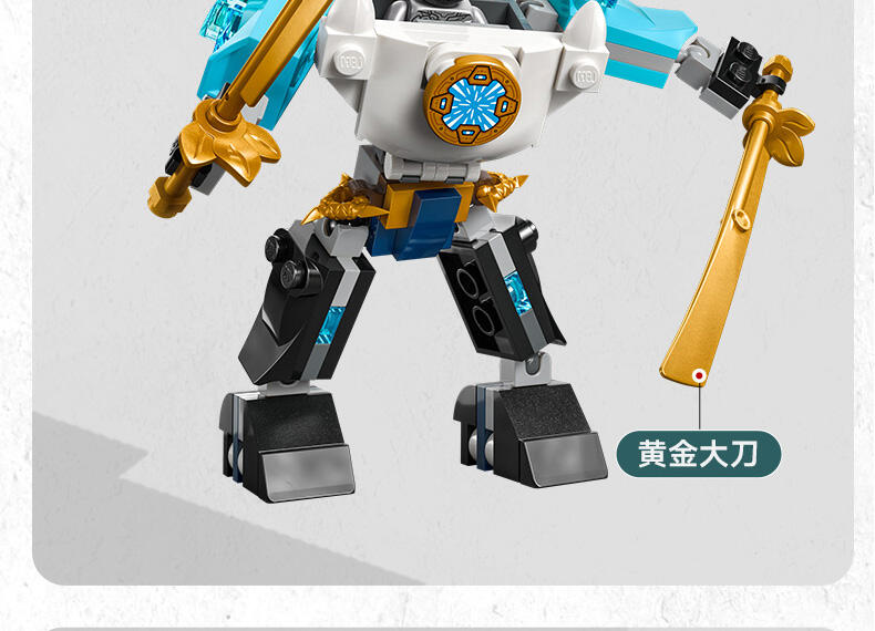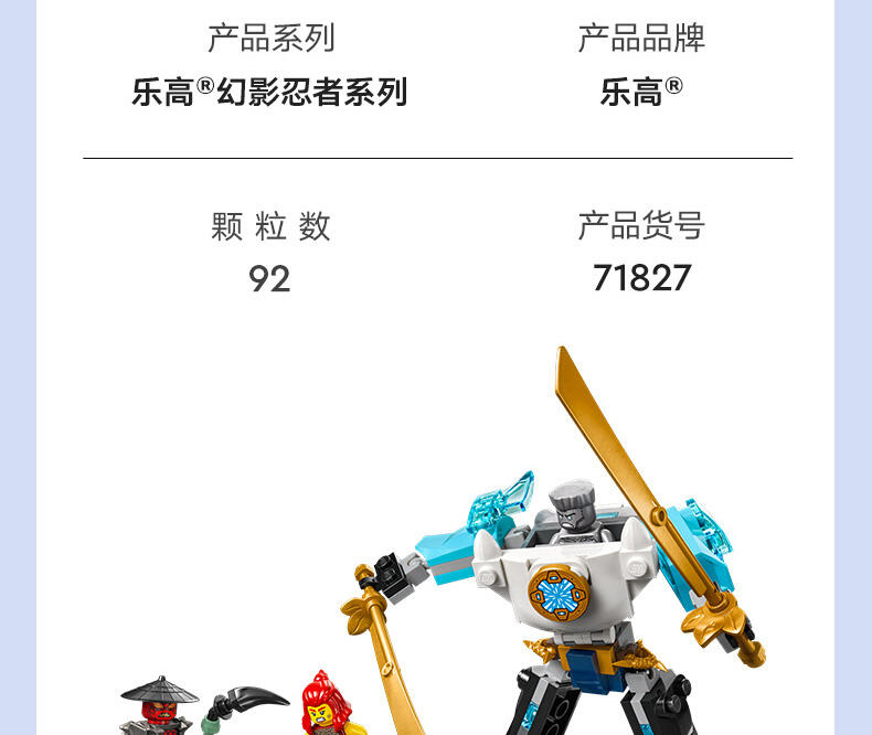 这款乐高 影忍者赞的战斗机甲 (71827) 假装游戏玩具套装允许 6 岁及以上的男孩和女孩上演《幻影忍者神龙崛起》第 3 季中激动人心的行动。这款儿童拼搭套装包含一个幻影忍者机甲,其拥有灵活的手臂、腿部和手部,可 360 度旋转的上半身,以及可以打开的胸部(里面可以容纳一个小人仔)和 2 柄大刀。