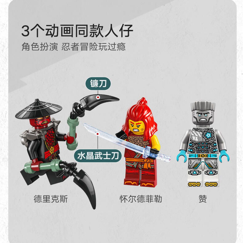 这款乐高玩具套装包含 3 个幻影忍者角色小人仔:身穿之前从未见过的盔甲的赞,配备 2 个手里剑,怀尔德菲勒装备有水晶武士刀,封禁五人组中的昆虫大师德里克斯带着 2 柄镰刀,以便孩子们在合并后的幻影忍者世界中进行长时间的角色扮演冒险。