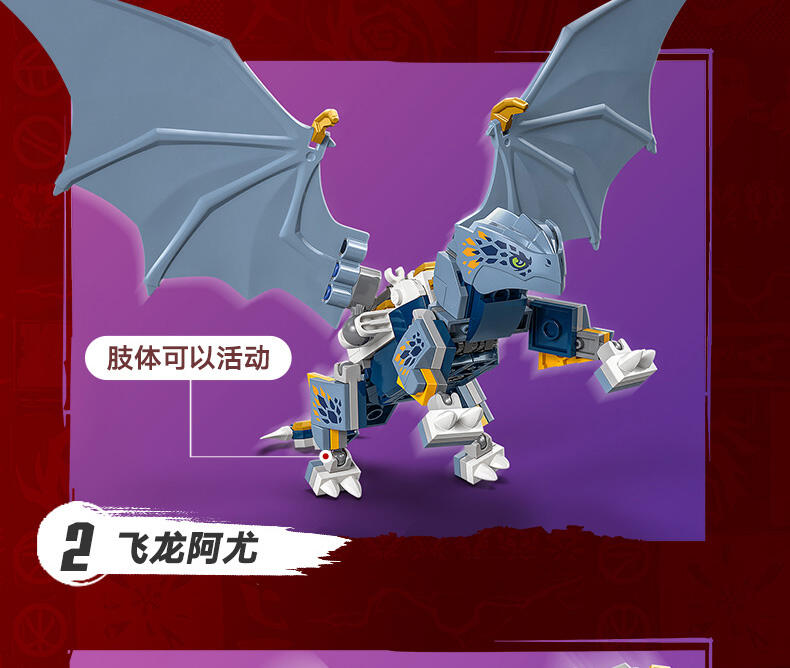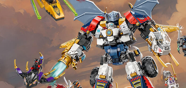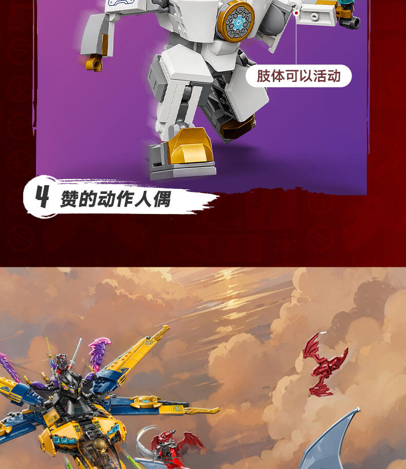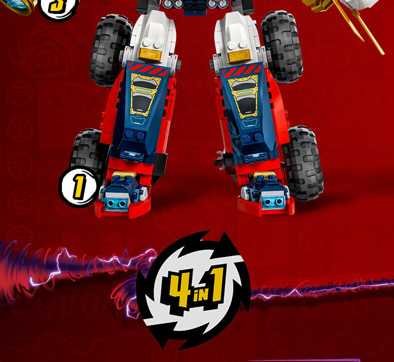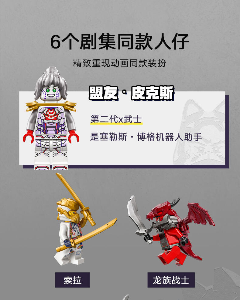 玩乐这款赞的高科技组合式机甲 (71834) 4 合 1 拼搭套装,9 岁及以上的男孩和女孩可以获得无尽的玩乐机会,重现电视剧《幻影忍者神龙崛起》第 3 季中的精彩行动。孩子们可以玩乐这款令人惊叹的大型组合式机甲,其拥有灵活的腿部、脚部、手臂、手腕、手指、头部、龙翼,还装备有驾驶舱和 2 个发射器。然后,他们可将其拆分成 4 个较小的模型:肢体灵活且拥有龙翼的飞龙;一架喷气式飞机,配有可以活动的发动机和可以旋转的驾驶舱;一辆汽车,带有 4 个巨型越野车轮和 2 个可以打开的驾驶室,其中一个驾驶室藏有爆能枪;还有赞的动作人偶。这款忍者玩具套装包含 6 个小人仔,以便孩子们进行长时间的战斗。忍者索拉和寇及他们的盟友皮克斯配备有酷炫的忍者武器,以对抗邪恶的三人组:诺克特、龙族战士和龙族侦察兵,他们均装备有武器。