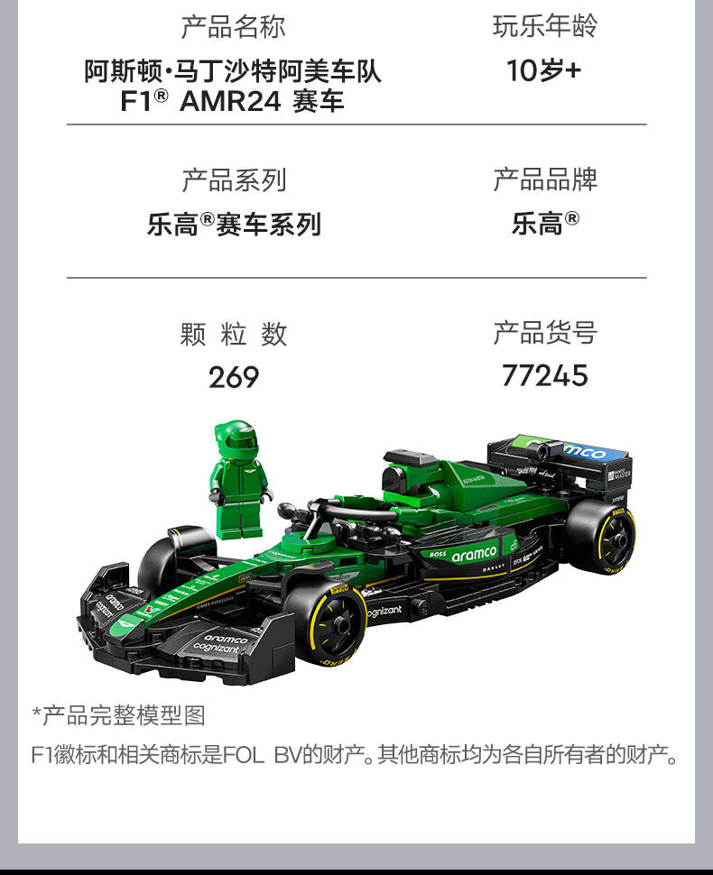 LEGO乐高 超级赛车系列 77245 阿斯顿·马丁沙特阿美车队 F1 AMR24 赛车