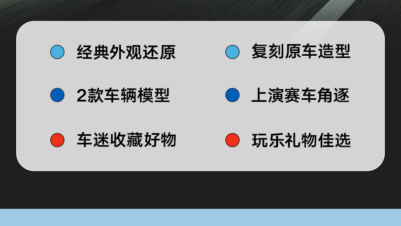 - 2 个小人仔——本套装中的每辆汽车都包含一个戴着头盔驾驶员小人仔、假发和扳手,孩子们可将小人仔放到驾驶座,准备在赛道上进行比赛