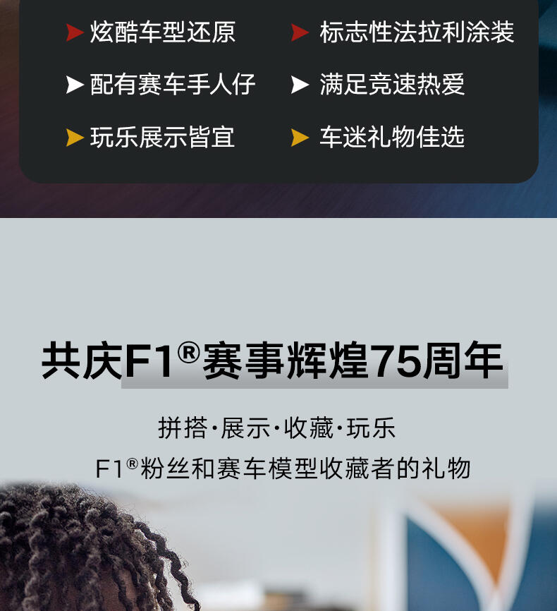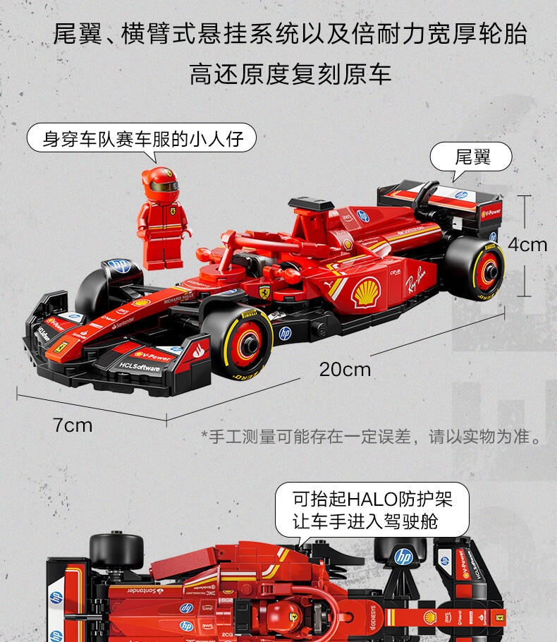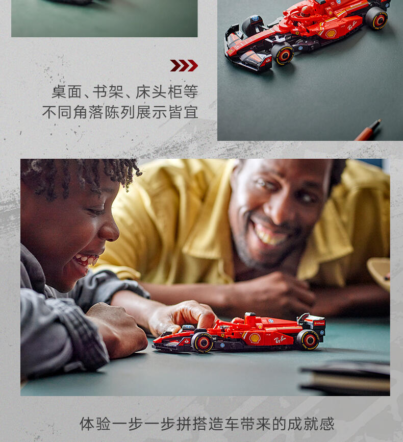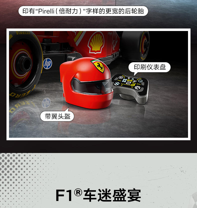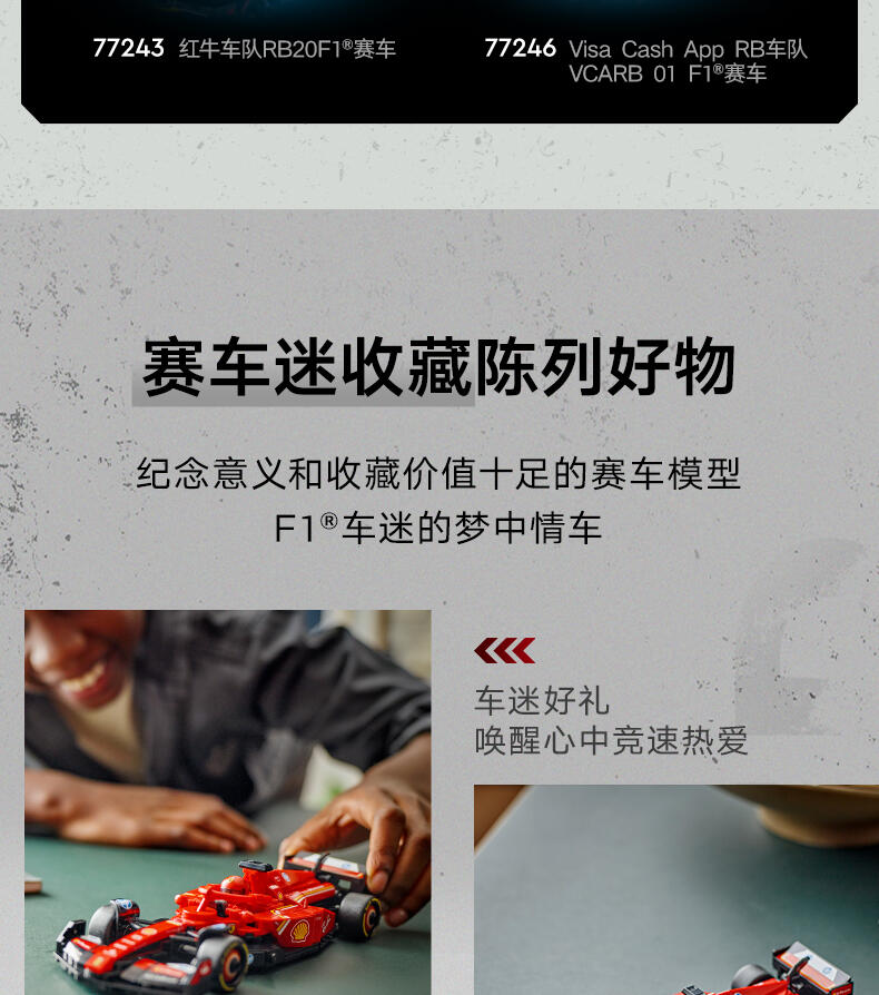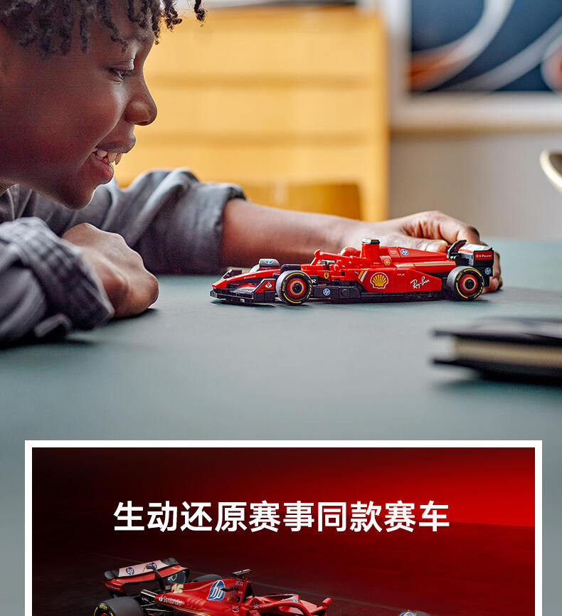 这款LEGO 度冠军法拉利SF-24 F1 车(77242)配备了驾驶员,等待着10岁及以上的男孩和女孩参加激动人心的F1 赛。这款法拉利玩具展示了2024年F1赛季参赛的真实赛车的细节。儿童和成人爱好者可以建造、欣赏和比赛这辆车。F1车型的驾驶舱可以通过抬起光环、后翼、叉骨悬架、赞助商贴花和印有“倍耐力”字样的宽后轮胎来打开。包括一个穿着法拉利赛车服的驾驶员迷你像和一个带翅膀的头盔,可以放在驾驶舱里与之比赛。乐高速度冠军套装允许赛车迷制作一些世界上最著名的汽车模型,包括2024赛季的其他一级方程式赛车(单独出售)。每套汽车都可以使用打印的建筑说明或LEGO Builder应用程序创建,该应用程序将指导您和您的孩子进行有趣的建筑冒险。