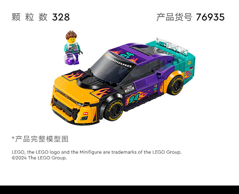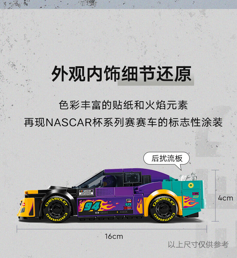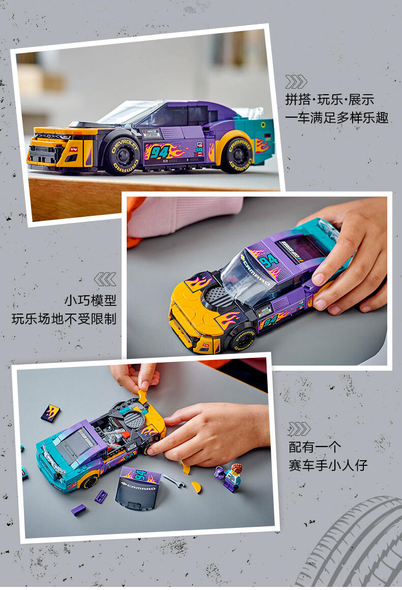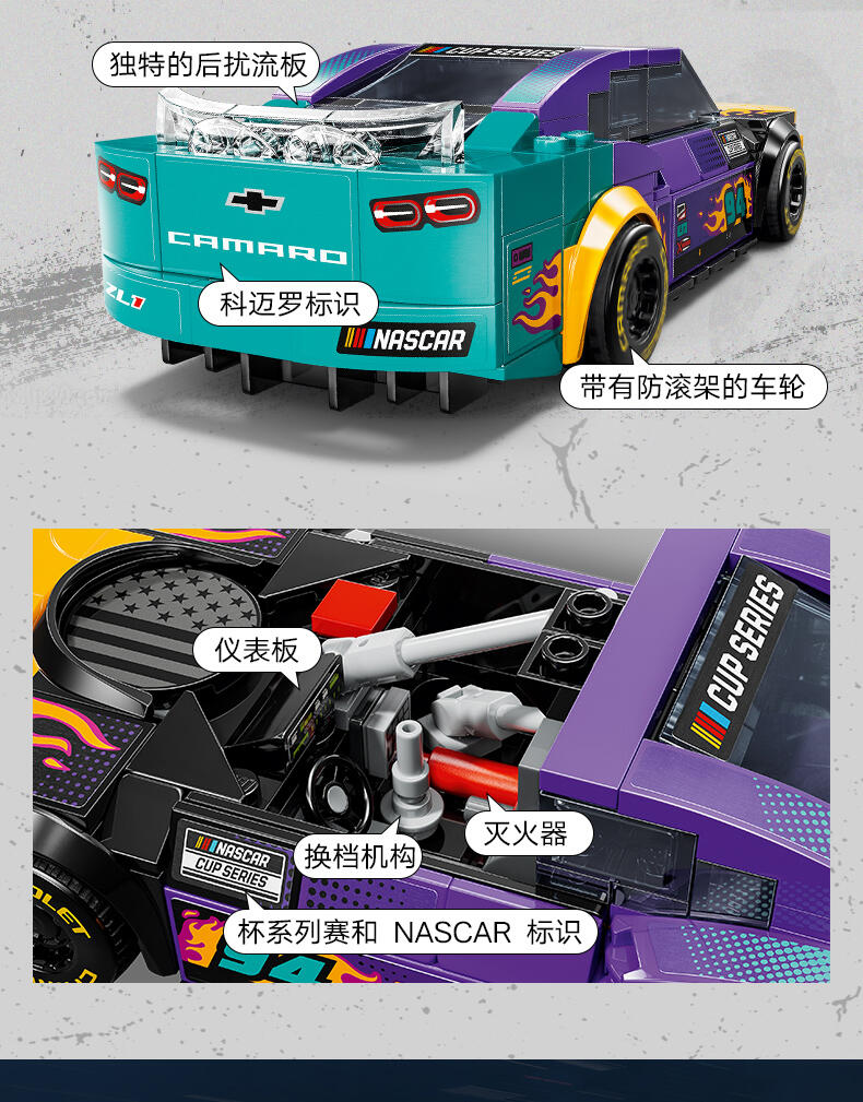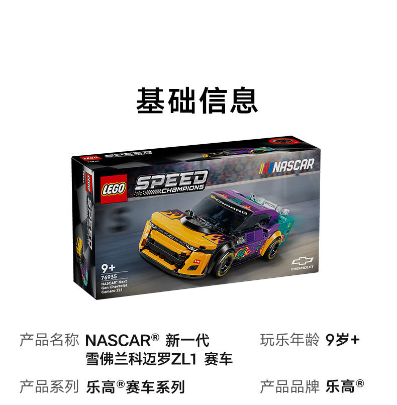 “9岁以上的男孩和女孩以及NASCAR粉丝可以收集、建造、玩和展示这款乐高速度冠军NASCAR下一代雪佛兰Camaro ZL1(76935)玩具车。这款功能强大的赛车以鲜艳的颜色和火焰装饰,包括NASCAR杯系列赛中真实赛车的设计细节。