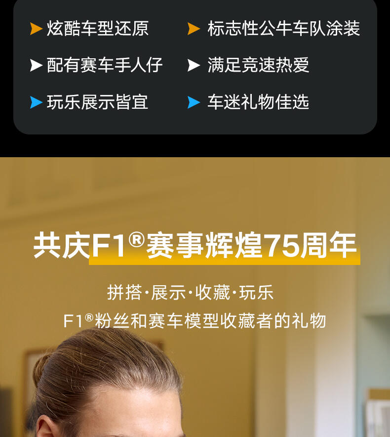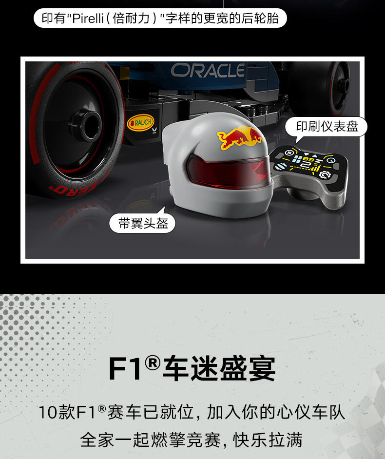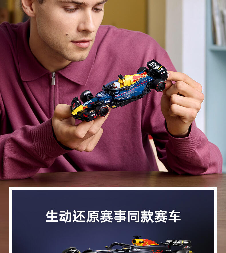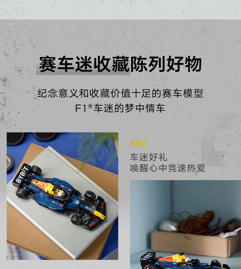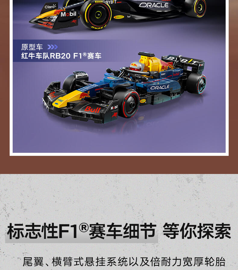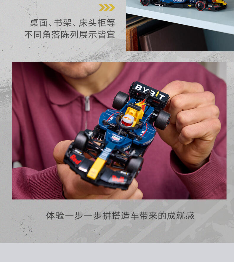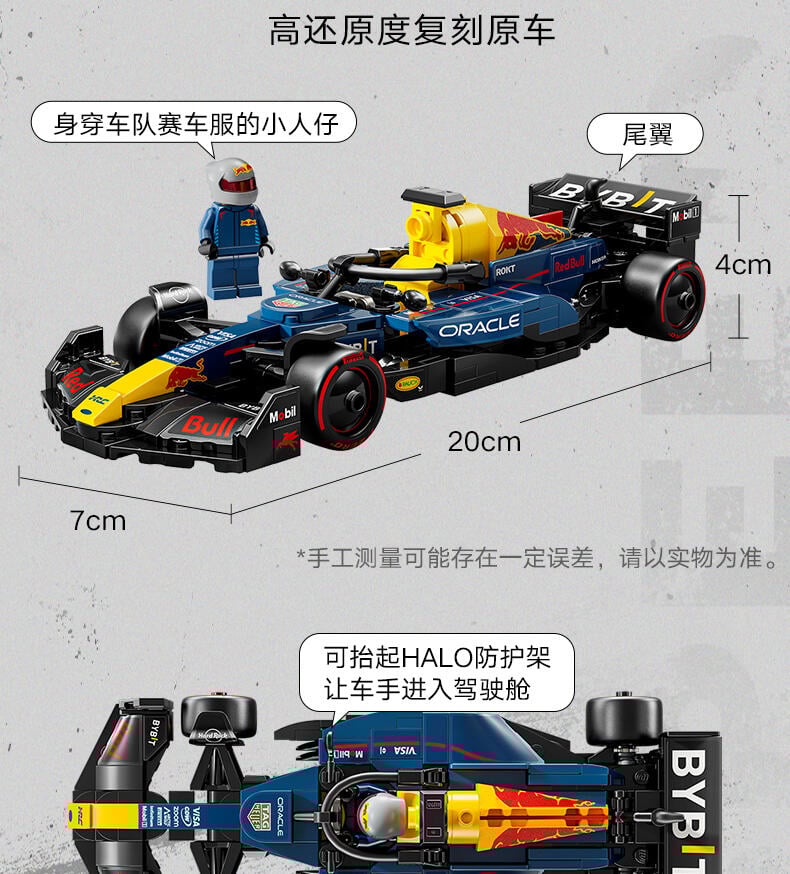 用这款LEGO 度冠军Oracle Red Bull racing RB20 F1 车来庆祝您对F1 车的热爱。这款成人车具有2024年一级方程式世界锦标赛期间驾驶的真实版本的设计细节。探索F1车型的惊人功能,包括通过抬起光环打开的驾驶舱、后翼、叉骨悬架、赞助商贴纸和印有“倍耐力”字样的宽后轮胎。这个展示模型包括一个穿着红牛服装的F1车手的迷你人偶和一个带翅膀的头盔,可以放在驾驶舱里与之比赛。乐高速度冠军套装允许孩子们和赛车迷制作一些世界上最著名的汽车模型,包括2024赛季的其他一级方程式赛车(单独出售)。每套汽车都可以使用打印的建筑说明或LEGO Builder应用程序创建,该应用程序将指导您和您的家人进行有趣的建筑冒险。