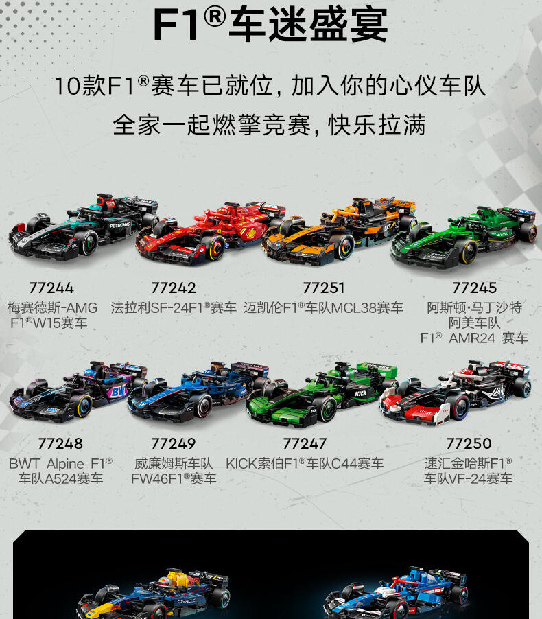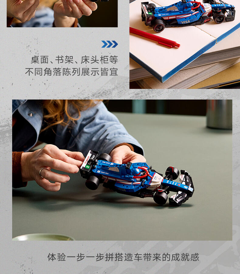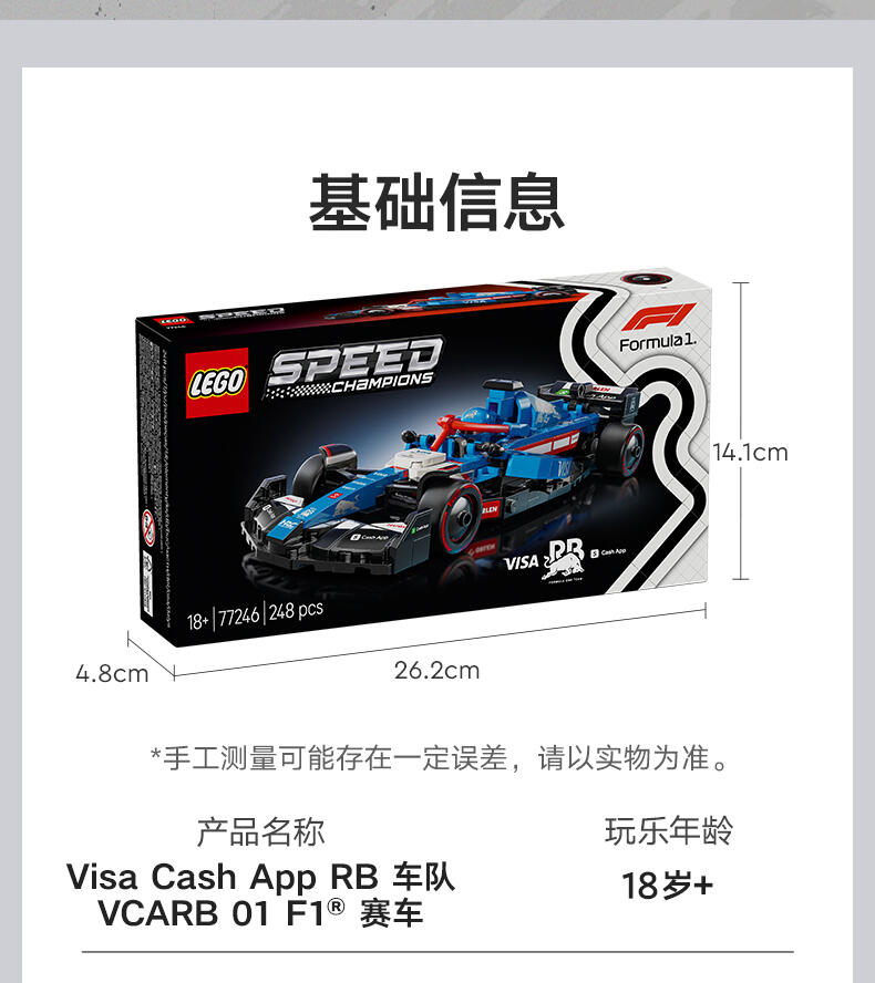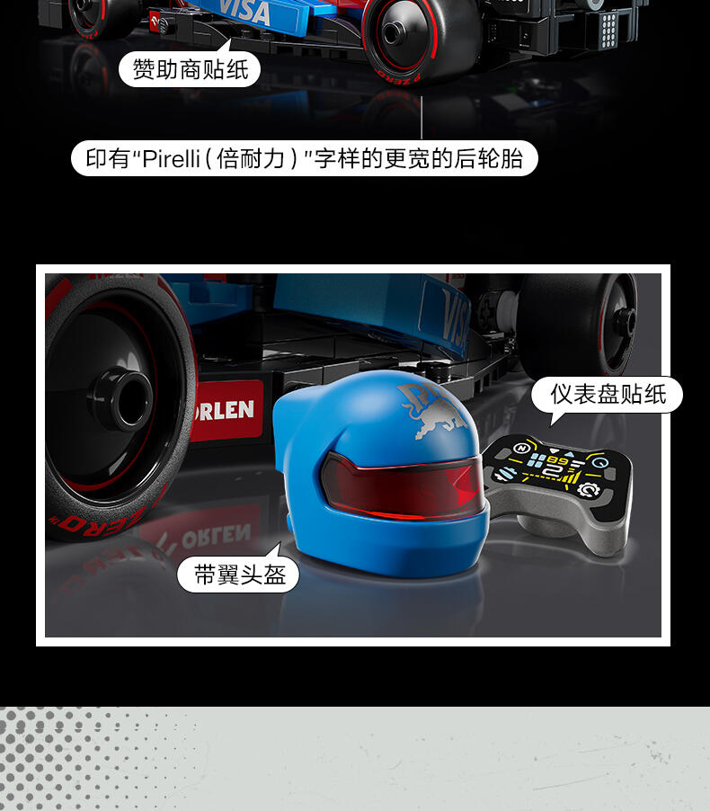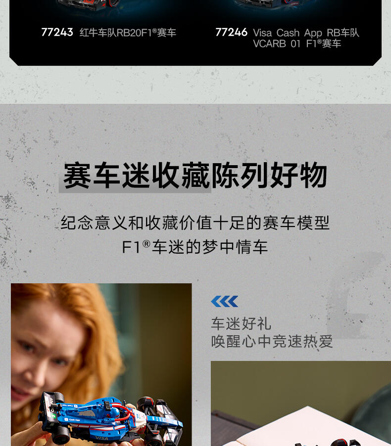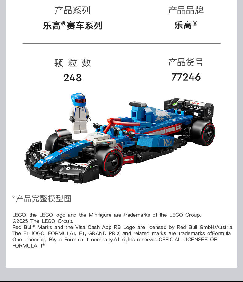 使用LEGO peed Champions Visa Cash App RB VCARB 01 F1 车(77246)成人套装,展示您对F1 车的热情。F1车型的设计细节与2024年参加一级方程式世界锦标赛的真实版本相同。F1车型的驾驶舱可以通过抬起光环、后翼、叉骨悬架、赞助商贴花和印有“倍耐力”字样的宽后轮胎打开。包括一个穿着RB服装的驾驶员迷你像和一个带翅膀的头盔,可以放在驾驶舱里与之比赛。家庭或办公室的绝佳展示模型!乐高速度冠军套装允许孩子们和赛车迷制作一些世界上最著名的汽车模型,包括2024赛季的其他一级方程式赛车(单独出售)。每套汽车都可以使用打印的建筑说明或LEGO Builder应用程序创建,该应用程序将指导您和您的家人进行有趣的建筑冒险。